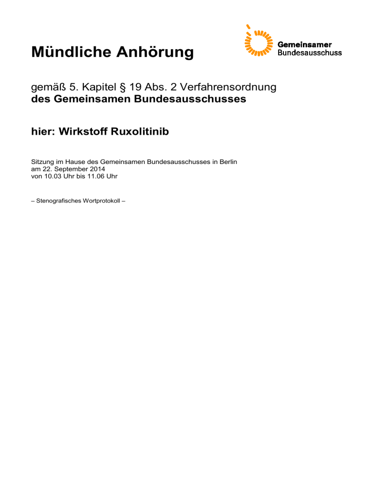 Mündliche Anhörung gemäß 5. Kapitel § 19 Abs. 2 Verfahrensordnung des Gemeinsamen Bundesausschusses hier: Wirkstoff Ruxolitinib Sitzung im Hause des Gemeinsamen Bundesausschusses in Berlin am 22. September 2014 von 10.03 Uhr bis 11.06 Uhr – Stenografisches Wortprotokoll – Angemeldete Teilnehmer der Firma Novartis Pharma GmbH: Herr Dr. Holler Herr Dr. Hilf Frau Dr. Bachhuber Frau Dr. Weiß Angemeldete Teilnehmer für die Arzneimittelkommission der deutschen Ärzteschaft (AkdÄ): Herr Prof. Dr. Ludwig Frau PD Dr. Hübner Angemeldete Teilnehmer der Firma medac GmbH: Herr Dr. Erdmann Herr Meier Angemeldete Teilnehmer für die Deutsche Gesellschaft für Hämatologie und Medizinische Onkologie (DGHO): Herr Prof. Dr. Wörmann Herr PD Dr. LeCoutre Angemeldete Teilnehmer für den Verband Forschender Arzneimittelhersteller e. V. (vfa): Herr Dr. Rasch Frau Orben Beginn der Anhörung: 10.03 Uhr (Die angemeldeten Teilnehmer betreten den Raum) Herr Hecken (Vorsitzender): Meine sehr verehrten Damen und Herren! Herzlich willkommen hier beim Gemeinsamen Bundesausschuss zur mündlichen Anhörung im Rahmen des Nutzenbewertungsverfahrens Ruxolitinib, zweiter Durchgang, kann man sagen. Es ist als Orphan bei uns im Gemeinsamen Bundesausschuss schon einmal mit einem geringen Zusatznutzen bewertet worden. Nunmehr ist die 50-Millionen-Schwelle überschritten, und damit hat eine „normale“ Bewertung stattgefunden. Es liegt uns eine Dossierbewertung des IQWiG vom 12. August 2014 vor, die Basis des Stellungnahmeverfahrens war und auch die Basis der heutigen mündlichen Anhörung ist. Im Gegensatz zur seinerzeitigen Beurteilung durch den Gemeinsamen Bundesausschuss sieht das IQWiG einen Hinweis auf einen beträchtlichen Zusatznutzen bei dem in Rede stehenden Wirkstoff. Die zentralen Fragestellungen, die sich für uns heute in der Anhörung ergeben, neben anderen Fragen, die Sie selbstverständlich ansprechen können, ist natürlich die Frage, die sehr wichtig für das Ergebnis der Bewertung ist, ob und in welchem Umfang die COMFORT-II-Studie in die Bewertung einbezogen werden kann. Dann wäre ich auch sehr interessiert an der Einschätzung der Kliniker zum Schadenspotenzial und zur Mortalität. Das sind Fragestellungen, die auch in verschiedenen Stellungnahmen eine Rolle gespielt haben. Im Stellungnahmeverfahren haben Novartis, die Arzneimittelkommission der deutschen Ärzteschaft, medac, die Deutsche Gesellschaft für Hämatologie und Medizinische Onkologie und der vfa Stellungnahmen abgegeben. Ich begrüße heute hier Herrn Dr. Haller, Herrn Dr. Hilf, Frau Dr. Bachhuber und Frau Dr. Weiß von Novartis, Herrn Professor Ludwig und Frau Privatdozentin Dr. Hübner für die AkdÄ, Herrn Erdmann und Herrn Meier von medac, Herrn Professor Wörmann und Herrn Professor LeCoutre für die DGHO sowie Herrn Dr. Rasch und Frau Orben vom vfa. Seien Sie uns herzlich willkommen. Üblicher Hinweis: Wir führen Wortprotokoll. Deshalb bitte jeweils Namen, Firma oder entsendende Institution nennen, bevor Sie das Wort ergreifen. Ich würde wie üblich der Firma Novartis als pharmazeutischem Unternehmer die Gelegenheit geben, sich als Erstes mit den aus Ihrer Sicht relevanten Punkten auseinanderzusetzen. Die Stellungnahme noch einmal herunterzuspulen, ist überflüssig. Die entscheidenden Punkte sind adressiert. Daran würden sich die Fragen anschließen, und die anderen Stellungnehmer haben die Möglichkeit zur Ergänzung oder zu Nachfragen. Wer möchte beginnen? – Herr Holler, bitte schön. Herr Dr. Holler (Novartis): Guten Morgen! Sehr geehrter Herr Vorsitzender! Sehr geehrte Damen und Herren! Herzlichen Dank für die Möglichkeit, ein kurzes Statement von unserer Seite vorauszuschicken. Die Bewertung von Ruxolitinib ist sicherlich ein besonderes Verfahren, besonders in mehrerlei Hinsicht. Als bisher einziges Orphan-Arzneimittel durchläuft Ruxolitinib die frühe Nutzenbewertung ein zweites Mal, aufgrund der gesetzlich definierten Umsatzschwelle. Diese Tatsache trägt der hohen Akzeptanz des Wirkstoffs bei den Patienten und Ärzten Rechnung. Das erfordert gemäß Sozialgesetzbuch ein umfangreicheres Bewertungsverfahren. Trotz der hohen Akzeptanz hat sich an der Patientengruppe, die zu behandeln ist, und am Solistenstatus von Ruxolitinib nichts geändert. Nach wie vor hat Ruxolitinib einen Orphan-Status bei der EMA. Eine Chance dieses Verfahrens ist sicherlich, dass die Neubewertung die Möglichkeit gibt, weitere Langzeitdaten aus den Zulassungsstudien COMFORT I und II zu berücksichtigen. 3 Ganz kurz zur Erinnerung zum Krankheitsbild. Myelofibrose ist eine seltene Erkrankung, die das Knochenmark vernarbt. In der Folge ist die Blutbildung sehr stark gestört. Die Patienten sind aufgrund von Symptomen oftmals stark eingeschränkt, extreme Milzvergrößerung, Bauchbeschwerden, Gewichtsverlust, konstitutionelle Symptome, Muskel- und Knochenschmerzen und ständige Müdigkeit. Ebenfalls geht die Erkrankung mit einer hohen Mortalitätsrate einher. Das mediane Gesamtüberleben nach der Diagnose beträgt in etwa sechs Jahre. Bei 15 bis 20 Prozent der Patienten kommt es zum Übergang in eine akute myeloische Leukämie, wodurch die Lebenserwartung auf weniger als sechs Monate sinkt. Nach wie vor gibt es keine zugelassene medikamentöse Therapiealternative zu Ruxolitinib. Es kann lediglich palliativ symptomorientiert im Sinne einer Best Supportive Care therapiert werden. Im ersten Verfahren hat dieses Gremium dem Wirkstoff Ruxolitinib einen geringen Zusatznutzen auf Basis der Zweijahresdaten bescheinigt. Nun stellt sich selbstverständlich die Frage: Was hat sich seitdem verändert? Mit dem zweiten Nutzendossier haben wir Drei- beziehungsweise Dreieinhalbjahresdaten, Langzeitdaten, zur Lebensverlängerung der betreffenden Patienten präsentiert. Es bestätigt sich die Senkung des Mortalitätsrisikos um circa die Hälfte. Aus den Langzeitanalysen wissen wir, dass die patientenrelevanten Effekte der Ruxolitinibtherapie dauerhaft sind