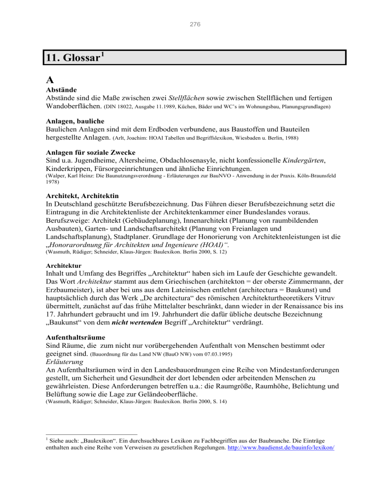 276 11. Glossar1 A Abstände Abstände sind die Maße zwischen zwei Stellflächen sowie zwischen Stellflächen und fertigen Wandoberflächen. (DIN 18022, Ausgabe 11.1989, Küchen, Bäder und WC’s im Wohnungsbau, Planungsgrundlagen) Anlagen, bauliche Baulichen Anlagen sind mit dem Erdboden verbundene, aus Baustoffen und Bauteilen hergestellte Anlagen. (Arlt, Joachim: HOAI Tabellen und Begriffslexikon, Wiesbaden u. Berlin, 1988) Anlagen für soziale Zwecke Sind u.a. Jugendheime, Altersheime, Obdachlosenasyle, nicht konfessionelle Kindergärten, Kinderkrippen, Fürsorgeeinrichtungen und ähnliche Einrichtungen. (Walper, Karl Heinz: Die Baunutzungsverordnung - Erläuterungen zur BauNVO - Anwendung in der Praxis. Köln-Braunsfeld 1978) Architekt, Architektin In Deutschland geschützte Berufsbezeichnung. Das Führen dieser Berufsbezeichnung setzt die Eintragung in die Architektenliste der Architektenkammer einer Bundeslandes voraus. Berufszweige: Architekt (Gebäudeplanung), Innenarchitekt (Planung von raumbildenden Ausbauten), Garten- und Landschaftsarchitekt (Planung von Freianlagen und Landschaftsplanung), Stadtplaner. Grundlage der Honorierung von Architektenleistungen ist die „Honorarordnung für Architekten und Ingenieure (HOAI)“. (Wasmuth, Rüdiger; Schneider, Klaus-Jürgen: Baulexikon. Berlin 2000, S. 12) Architektur Inhalt und Umfang des Begriffes „Architektur“ haben sich im Laufe der Geschichte gewandelt. Das Wort Architektur stammt aus dem Griechischen (architekton = der oberste Zimmermann, der Erzbaumeister), ist aber bei uns aus dem Lateinischen entlehnt (architectura = Baukunst) und hauptsächlich durch das Werk „De architectura“ des römischen Architekturtheoretikers Vitruv übermittelt, zunächst auf das frühe Mittelalter beschränkt, dann wieder in der Renaissance bis ins 17. Jahrhundert gebraucht und im 19. Jahrhundert die dafür übliche deutsche Bezeichnung „Baukunst“ von dem nicht wertenden Begriff „Architektur“ verdrängt. Aufenthaltsräume Sind Räume, die zum nicht nur vorübergehenden Aufenthalt von Menschen bestimmt oder geeignet sind. (Bauordnung für das Land NW (BauO NW) vom 07.03.1995) Erläuterung An Aufenthaltsräumen wird in den Landesbauordnungen eine Reihe von Mindestanforderungen gestellt, um Sicherheit und Gesundheit der dort lebenden oder arbeitenden Menschen zu gewährleisten. Diese Anforderungen betreffen u.a.: die Raumgröße, Raumhöhe, Belichtung und Belüftung sowie die Lage zur Geländeoberfläche. (Wasmuth, Rüdiger; Schneider, Klaus-Jürgen: Baulexikon. Berlin 2000, S. 14) 1 Siehe auch: „Baulexikon“. Ein durchsuchbares Lexikon zu Fachbegriffen aus der Baubranche. Die Einträge enthalten auch eine Reihe von Verweisen zu gesetzlichen Regelungen. http://www.baudienst.de/bauinfo/lexikon/ 277 Ausbau Bauarbeiten, die sich an den Rohbau eines Gebäudes anschließen. Sie umfassen alle festen und beweglichen Teile, die Räume bilden, abschließen oder aufteilen. (Arlt, Joachim: HOAI Tabellen und Begriffslexikon, Wiesbaden u. Berlin,1988) Außenanlagen Nach DIN 276 (= „Kosten im Hochbau“) umfassen Außenanlagen eines Gebäudes Einfriedungen, Geländebearbeitung und -gestaltung, Versorgungsanlagen, Wirtschaftsgegenstände, Kunstwerke und künstlerisch gestaltete Bauteile, Anlagen für Sonderzwecke, Verkehrsanlagen und Grünflächen, d.h. alle Anlagen und Einrichtungen auf einem Grundstück, die zur städtebaulichen Einbindung, zur Ver- und Entsorgung, zur Verkehrserschließung des Gebäudes und zur Gestaltung des Grundstücks dienen. (Arlt, Joachim: HOAI Tabellen und Begriffslexikon, Wiesbaden u. Berlin,1988) Außenraum Der außerhalb der speziellen Raumbegrenzung befindliche Raum ist der Außenraum. Er dient in erster Linie der Verbindung zwischen den einzelnen gesellschaftlichen Tätigkeitsbereichen innerhalb der gebauten Räume. Daneben dient er einer Reihe von Tätigkeiten, die der Mensch im Naturraum vollzieht, wie z.B. Sport, Erholung usw. Außenräume sind im Gegensatz zu Innenräumen nicht vollkommen umbaut. In der Regel fehlt die obere Begrenzung. Außenraum wird hauptsächlich durch entsprechende Zueinanderordnung von Baukörpern gebildet und ist demzufolge durch deren Lagebeziehungen und Umrißformen gekennzeichnet; Außenräume bzw. Folgen von Außenräumen sind städtebauliche Einheiten, Ensembles und Landschaftsräume. Durch Raumbegrenzung weitgehend seitlich abgeschlossener Außenraum ohne oberen Abschluß wird auch als Binnenraum bezeichnet (Atrium, Portikus, Hof). (Spitzer, Hartwig: Raumnutzungslehre. Stuttgart 1992) Ausstattung Sind bauseitig eingebaute und/oder eingebrachte Gegenstände bzw. Geräte, die von dem Bauherrn eingebracht und/oder eingebaut werden. Die Ausstattung ist stets Bestandteil des Gebäudes bzw. der Wohnung, oder des Kindergartens. Erläuterung: Zum Beispiel Badewannen, Brausetassen, Handwaschbecken, Spülklosetts, Einbauschränke, Einbauküche. Ausrüstung, technische Zur Technischen Ausrüstung gehören folgende Anlagegruppen: 1. Gas-, Wasser- und Abwassertechnik 2. Wärmeversorgungs-, Brauchwassererwärmungs- und Raumlufttechnik 3. Elektrotechnik 4. Aufzug-, Förder- und Lagertechnik 5. Küchen-, Wäscherei- und chemische Reinigungstechnik 6. Medizin- und Labortechnik. Es handelt sich dabei um Anlagen in Gebäuden, soweit sie in der DIN 276 (= „Kosten im Hochbau“) erfaßt sind und entsprechende Anlagen in Ingenieurbauwerken. (Arlt, Joachim: HOAI Tabellen und Begriffslexikon, Wiesbaden u. Berlin,1988) Aussenwand Eine das Gebäude umschließende und seinen Innenraum nach außen abgrenzende Wand mit den Funktionen des Wärme-, Schall-, Brand- und Schlagregenschutzes und i.d.R. auch mit tragender Funktion. (Wasmuth, Rüdiger; Schneider, Klaus-Jürgen: Baulexikon. Berlin 2000, S. 18) 278 B Bauantrag Schriftlicher Antrag an die Bauaufsichtsbehörde auf Erteilung der Baugenehmigung. (Arlt, Joachim: HOAI Tabellen und Begriffslexikon, Wiesbaden u. Berlin, 1988) Bauart Ist die Art, in der Bau