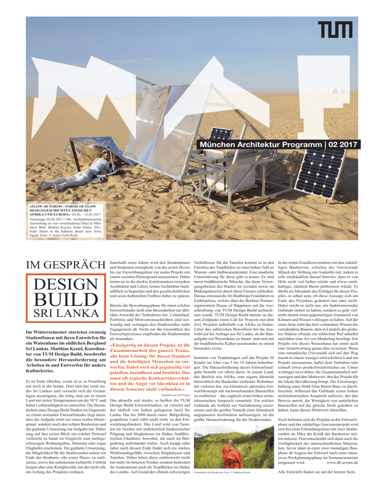München Architektur Programm | 02 2017 »FLOW OF FORMS / FORMS OF FLOW DESIGNGESCHICHTEN ZWISCHEN AFRIKA UND EUROPA« 03.02. - 12.03.2017 Vernissage: 02.02.2017 | 18h | Architekturmuseum Ausstellung an vier verschiedenen Orten in München; Bild: Markus Kayser, Solar Sinter, 2011, Solar Sinter in the Saharan desert near Siwa, Egypt; Foto: © Amos Field Reid IM GESPRÄCH DESIGN BUILD Innerhalb eines Jahres wird den Studentinnen und Studenten ermöglicht, von der ersten Skizze bis zur Einweihungsfeier ein reales Projekt mit einem sozialen Hintergrund umzusetzen. Dabei treten sie in die direkte Konfrontation zwischen Architektur und Leben, lernen Architektur buchstäblich zu begreifen und den gesellschaftlichen und sozio-kulturellen Einfluss dabei zu spüren. Bereits die Bewerbungsphase für einen solches Entwurfsstudio stellt eine Besonderheit zur üblichen Auswahl der Teilnehmer dar: Lebenslauf, Portfolio und Motivationsschreiben sind notwendig und verlangen den Studierenden mehr Engagement ab. Nicht nur die Gesamtheit des Im Wintersemester starteten zwanzig Entwurfsprozesses empfinden die Studierenden StudentInnen mit ihren Entwürfen für als besonders. SRI LANKA ein Waisenhaus im südlichen Bergland Sri Lankas. Matthias Kestel, Koordinator von TUM Design Build, beschreibt die besondere Herausforderung am Arbeiten in und Entwerfen für andere Kulturkreise. »Einzigartig an diesem Projekt, ist die Zusammenarbeit des ganzen Teams, die beste Lösung für diesen Standort und die beteiligten Menschen zu entwerfen. Dabei wird sich gegenseitig viel geholfen, beeinflusst und bestärkt. Das sonst oft typische KonkurrenzverhalEs ist Ende Oktober, warm ist es in Vorarlberg ten und die Angst vor Ideenklau ist in nur noch in der Sonne. Dort sitzt das »real studio Sri Lanka« und versucht sich die Grund- diesem Semester nicht vorhanden.« lagen anzueignen, die nötig sind um in einem Land mit steten Temperaturen um die 30°C und hoher Luftfeuchtigkeit zu entwerfen. Die Besonderheit eines Design Build Studios im Gegensatz zu einem normalen Entwurfsstudio liegt darin, dass die Aufgabe nicht nur einen realen Hintergrund, sondern auch den echten Bauherren und die geplante Umsetzung zur Aufgabe hat. Daher mag auf den ersten Blick ein solcher Entwurf vielleicht zu banal im Vergleich zum mehrgeschossigen Wohnungsbau, Museum oder sogar Flughafen erscheinen. Die geplante Umsetzung, die Möglichkeit für die Studierenden schon vor Ende des Studiums »ihr erstes Haus« zu realisieren, sowie das unbekannte kulturelle Umfeld bergen aber eine Komplexität, mit der nicht alle am Anfang des Projektes rechnen. Studentin aus dem Projekt Das aktuelle real studio, so heißen die TUM Design Build Entwurfstudios, ist verortet auf der südlich von Indien gelegenen Insel Sri Lanka. Das bis 2008 durch einen Bürgerkrieg gespaltene Land zählt nicht mehr zu den Entwicklungsländern. Das Land wird von Tamilen im Norden mit mehrheitlich hinduistischer Prägung und Singhalesen im Süden, buddhistischen Glaubens, bewohnt, die auch im Bürgerkrieg aufeinander trafen. Auch knapp zehn Jahre nach dessen Ende findet sich ein starkes Wohlstandsgefälle zwischen Singhalesen und Tamilen. Daher leben diese mittlerweile nicht nur mehr im ärmeren Norden sondern bestreiten ihr Auskommen auch als Teepflücker im Süden des Landes. Auf Grund der oftmals schwierigen Verhältnisse für die Tamilen kommt es in den Familien der Teepflücker zu einer hohen Zahl an Waisen- oder Halbwaisenkinder. Eine staatliche Unterstützung für diese gibt es kaum. Es sind meist buddhistische Mönche, die diese Versorgungslücken des Staates im sozialen sowie im Bildungsbereich durch ihren Einsatz schließen. Daraus entstand die Sri Bodhiraja Foundation in Embilipitiya, welche über die Berliner Partnerorganisation House of Happiness auf die Ausschreibung von TUM Design Build aufmerksam wurde. TUM Design Build startete zu diesem Zeitpunkt einen Call for Projects mit dem Ziel, Projekte außerhalb von Afrika zu finden. Unter den zahlreichen Bewerbern fiel die Auswahl auf die Anfrage aus Sri Lanka, da die Bauaufgabe ein Waisenhaus zu bauen und sich mit der buddhistische Kultur auseinander zu setzen besonders reizte. In der ersten Emailkonversation mit den zukünftigen Bauherren, schickte der Vorsitzende Mönch der Stiftung ein Audiofile mit, indem er sehr eindrücklich darauf hinwies, dass er von Holz nicht viel halten würde und etwas nachhaltiges, nämlich Beton präferieren würde. Es dürfte als Messlatte des Erfolges für dieses Projekts zu sehen sein, ob diese Aussage sich am Ende des Projektes geändert hat oder nicht. Dabei reicht es nicht nur, ein funktionierendes Gebäude stehen zu haben, sondern es geht vielmehr darum einen gegenseitigen Austausch von Können und Wissen vollzogen zu haben. Auf der einen Seite steht das dort vorhandene Wissen des vernakulären Bauens, dem in Ländern des globalen Südens oftmals ein schlechter Ruf anhaftet und daher eine Art von Marketing benötigt. Ein Projekt wie dieses Waisenhaus hat somit auch eine Verantwortung genau dies zu leisten. Wenn eine europäische Universität sich auf den Weg macht in einem weniger entwickeltem Land ein Projekt umzusetzen, haftet dem Vorhaben sehr schnell etwas postkolonialistisches an. Umso wichtiger ist es daher, die Zusammenarbeit aufzuzeigen und den Mehrwert, den das Projekt für die lokale Bevölkerung bringt. Die Erwartungshaltung eines Stahl-Glas-Beton Baus zu durchbrechen, während das Gebäude einen hohen architektonischen Anspruch aufweist, der den Beweis antritt, die Wertigkeit von natürlichen Baustoffen auf die gleiche Stufe gehoben zu haben, kann diesen Mehrwert darstellen. Inmitten von Teeplantagen soll das Projekt 20 Kinder im Alter von 5 bis 18 Jahren beherbergen. Die Herausforderung dieser Entwurfsaufgabe besteht vor allem darin, in einem Land, das ähnlich wie Afrika, eine eigene Identität hinsichtlich der Baukultur einfacher Wohnbauten verloren hat, ein klimatisch optim