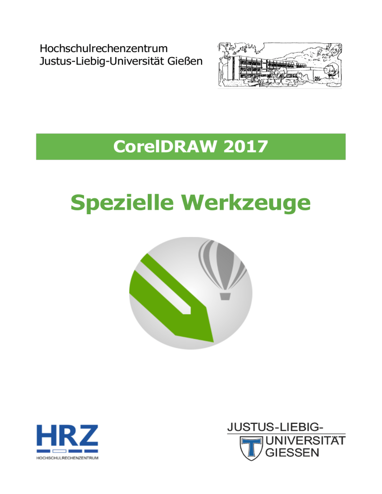 Hochschulrechenzentrum Justus-Liebig-Universität Gießen CorelDRAW 2017 Spezielle Werkzeuge Spezielle Werkzeuge in CorelDRAW Seite 1 von 38 Inhaltsverzeichnis Einleitung ............................................................................................................................................ 4 Hilfsmittel Form ................................................................................................................................ 4 Hilfsmittel Glätten ........................................................................................................................... 11 Hilfsmittel Verschmieren .............................................................................................................. 12 Hilfsmittel Wirbel ............................................................................................................................ 13 Hilfsmittel Heranziehen und Zurückweisen ............................................................................. 14 Hilfsmittel Verwischen .................................................................................................................. 15 Hilfsmittel Aufrauen ....................................................................................................................... 17 Hilfsmittel Beschneiden................................................................................................................ 18 Hilfsmittel Messer........................................................................................................................... 20 Hilfsmittel Virtuelles Segment löschen .................................................................................... 23 Hilfsmittel Radierer ........................................................................................................................ 24 Hilfsmittel Formerkennung .......................................................................................................... 25 Hilfsmittel LiveSketch ................................................................................................................... 26 Hilfsmittel Parallele Bemaßung .................................................................................................. 27 Hilfsmittel Horizontale oder Vertikale Bemaßung ................................................................. 30 Hilfsmittel Winkelbemaßung ....................................................................................................... 30 Hilfsmittel Segmentbemaßung ................................................................................................... 31 Hilfsmittel 3-Punkt-Beschriftungslinie...................................................................................... 32 Hilfsmittel Geradlinige Verbindung ........................................................................................... 33 Hilfsmittel Rechtwinklige Verbindung ...................................................................................... 34 Hilfsmittel Rechtwinklige runde Verbindung .......................................................................... 35 Hilfsmittel Anker bearbeiten ........................................................................................................ 35 Zusatzhinweis zu den Verbindungslinien ...................................................................................... 36 Hilfsmittel Intelligente Füllung .................................................................................................... 37 Tastenkombinationen ...................................................................................................................... 38 Abb. 1: Die verschiedenen Knotentypen auf dem Umriss eines Objekts ......................................... 4 Abb. 2: Dialogfeld Optionen; Unterkategorie Knoten und Ziehpunkte ...................................... 5 Abb. 3: Beispiel mit zwei Objekten (Hauptobjekt oben; Nebenobjekt unten) .................................. 6 Abb. 4: Mehrere markierte Knoten auf Haupt- und Nebenobjekt .................................................... 6 Abb. 5: Symbolleiste Eigenschaftsleiste (Hilfsmittel Form) ...................................................... 6 HOCHSCHULRECHENZENTRUM HRZ Abbildungsverzeichnis Spezielle Werkzeuge in CorelDRAW Seite 2 von 38 Abb. 6: Symbolleiste Eigenschaftsleiste (Hilfsmittel Glätten) ................................................. 11 Abb. 7: Beispiele für den Einsatz des Hilfsmittels Glätten ............................................................ 12 Abb. 8: Symbolleiste Eigenschaftsleiste (Hilfsmittel Verschmieren) ...................................... 12 Abb. 9: Beispiele für den Einsatz des Hilfsmittels Verschmieren ................................................. 13 Abb. 10: Symbolleiste Eigenschaftsleiste (Hilfsmittel Wirbel) .................................................. 13 Abb. 11: Beispiele für den Einsatz des Hilfsmittels Wirbel ............................................................. 14 Abb. 12: Symbolleiste Eigenschaftsleiste (Hilfsmittel Heranziehen bzw. Zurückweisen) ....... 14 Abb. 13: Beispiele für die beiden Hilfsmittel Heranziehen und Zurückweisen .............................. 15 Abb. 14: Symbolleiste Eigenschaftsleiste (Hilfsmittel Verwischen) .......................................... 15 Abb. 15: Beispiele für den Einsatz des Hilfsmittels Verwischen ..................................................... 16 Abb. 16: Symbolleiste Eigenschaftsleiste (Hilfsmittel Aufrauen) ............................................. 17 Abb. 17: Beispiele für den Einsatz des Hilfsmittels Aufrauen ........................................................ 18 Abb. 18: Das Rechteck zum Ausschneiden eines Teils eines Objekts .............................................. 19 Abb. 19: Symbolleiste Eigenschaftsleiste (Hilfsmittel Beschneiden) ........................................ 19 Abb. 20: Beispiele für