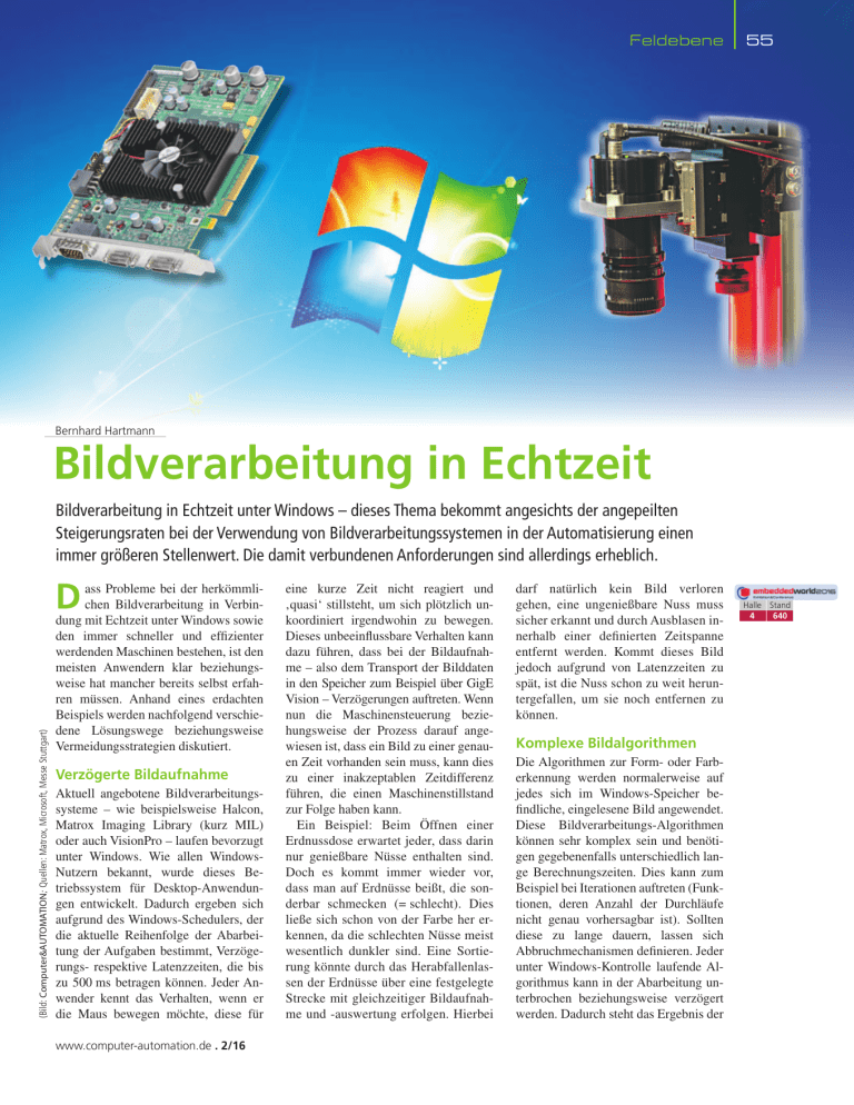 Feldebene 55 Bernhard Hartmann Bildverarbeitung in Echtzeit Bildverarbeitung in Echtzeit unter Windows – dieses Thema bekommt angesichts der angepeilten Steigerungsraten bei der Verwendung von Bildverarbeitungssystemen in der Automatisierung einen immer größeren Stellenwert. Die damit verbundenen Anforderungen sind allerdings erheblich. (Bild: Computer&AUTOMATION; Quellen: Matrox, Microsoft, Messe Stuttgart) D ass Probleme bei der herkömmlichen Bildverarbeitung in Verbindung mit Echtzeit unter Windows sowie den immer schneller und effizienter werdenden Maschinen bestehen, ist den meisten Anwendern klar beziehungsweise hat mancher bereits selbst erfahren müssen. Anhand eines erdachten Beispiels werden nachfolgend verschiedene Lösungswege beziehungsweise Vermeidungsstrategien diskutiert. Verzögerte Bildaufnahme Aktuell angebotene Bildverarbeitungssysteme – wie beispielsweise Halcon, Matrox Imaging Library (kurz MIL) oder auch VisionPro – laufen bevorzugt unter Windows. Wie allen WindowsNutzern bekannt, wurde dieses Betriebssystem für Desktop-Anwendungen entwickelt. Dadurch ergeben sich aufgrund des Windows-Schedulers, der die aktuelle Reihenfolge der Abarbeitung der Aufgaben bestimmt, Verzögerungs- respektive Latenzzeiten, die bis zu 500 ms betragen können. Jeder Anwender kennt das Verhalten, wenn er die Maus bewegen möchte, diese für www.computer-automation.de . 2/16 eine kurze Zeit nicht reagiert und ­‚quasi‘ stillsteht, um sich plötzlich unkoordiniert irgendwohin zu bewegen. Dieses unbeeinflussbare Verhalten kann dazu führen, dass bei der Bildaufnahme – also dem Transport der Bilddaten in den Speicher zum Beispiel über GigE Vision – Verzögerungen auftreten. Wenn nun die Maschinensteuerung beziehungsweise der Prozess darauf angewiesen ist, dass ein Bild zu einer genauen Zeit vorhanden sein muss, kann dies zu einer inakzeptablen Zeitdifferenz führen, die einen Maschinenstillstand zur Folge haben kann. Ein Beispiel: Beim Öffnen einer Erdnussdose erwartet jeder, dass darin nur genießbare Nüsse enthalten sind. Doch es kommt immer wieder vor, dass man auf Erdnüsse beißt, die sonderbar schmecken (= schlecht). Dies ließe sich schon von der Farbe her erkennen, da die schlechten Nüsse meist wesentlich dunkler sind. Eine Sortierung könnte durch das Herabfallenlassen der Erdnüsse über eine festgelegte Strecke mit gleichzeitiger Bildaufnahme und -auswertung erfolgen. Hierbei darf natürlich kein Bild verloren ­gehen, eine ungenießbare Nuss muss sicher erkannt und durch Ausblasen innerhalb einer definierten Zeitspanne entfernt werden. Kommt dieses Bild jedoch aufgrund von Latenzzeiten zu spät, ist die Nuss schon zu weit heruntergefallen, um sie noch entfernen zu können. Komplexe Bildalgorithmen Die Algorithmen zur Form- oder Farb­ erkennung werden normalerweise auf jedes sich im Windows-Speicher befindliche, eingelesene Bild angewendet. Diese Bildverarbeitungs-Algorithmen können sehr komplex sein und benötigen gegebenenfalls unterschiedlich lange Berechnungszeiten. Dies kann zum Beispiel bei Iterationen auftreten (Funktionen, deren Anzahl der Durchläufe nicht genau vorhersagbar ist). Sollten diese zu lange dauern, lassen sich ­Abbruchmechanismen definieren. Jeder unter Windows-Kontrolle laufende Algorithmus kann in der Abarbeitung unterbrochen beziehungsweise verzögert werden. Dadurch steht das Ergebnis der Halle Stand 4 640 Feldebene Berechnung eventuell nicht zum benötigten Zeitpunkt zur Verfügung, was wiederum zu einer Störung der Maschine führen kann. Auch hier wieder das Erdnuss-Beispiel: Ideal wäre, dass die Bildaufnahme immer ohne Unterbrechung zeitrichtig erfolgt und kein Bild verloren geht. Die Maschine benötigt zu einer definierten und genau einzuhaltenden Zeit (= deterministisch) ein Signal, mit dem sich das Ausblasventil zur Entfernung der ‚defekten‘ Erdnuss steuern lässt. Kommt dieses Signal aufgrund der nicht definierbaren Latenzzeiten von Windows zu spät oder gar nicht, wird gegebenenfalls das Ventil geöffnet und eine gute Erdnuss entfernt. Die ‚fehlerhafte‘ Erdnuss ist inzwischen aufgrund der Verzögerung schon ein paar Zentimeter weiter gefallen oder bereits in der Lieferschachtel angelangt. Welche Abhilfe beziehungsweise welche Strategien gibt es nun, diesem Dilemma zu begegnen? Die Framegrabber-Strategie Eine gängige Lösung sind Framegrabber, auf denen nicht nur die Bildaufnahme, sondern auch die komplette Berechnung direkt vorgenommen werden kann. Hierbei sind die Algorithmen entsprechend vorher als VHDLProgramm zu erstellen, mit dem passenden VHDL-Compiler zu übersetzen – was bis zu einem Tag pro Compilierungs-Vorgang dauern kann – und anschließend zu testen. Dies bedeutet einen hohen Aufwand und zusätzliche Zeit in der Entwicklung. Ohne Programmierung kosten solche Framegrabber einige hundert Euro pro Stück – ohne hierbei das benötigte Interface (GigE, CameraLink oder ­ ­CoaXPress) beziehungsweise die Kamera mit einbezogen zu haben. Ob dies eine Lösung im Hinblick auf selbstkonfigurierende und autonome Maschinen unter Industrie 4.0 sein kann, muss sich herausstellen. Eigenentwickelte PCI-Karte Eine andere Strategie ist die komplette Eigenentwicklung einer PCIEinsteckkarte auf Basis eines DSP oder eines FPGA. Dies bedeutet, dass die Bild-Erfassung sowie die gesamte Echtzeit-Verarbeitung auf der Einsteckkarte erfolgt und somit auch getrennt von Windows läuft. Allerdings: Das Interface muss selbst programmiert und die Echtzeit-Verarbeitung entwickelt und getestet werden. Zusätzlich ist ein Betriebssystem für den DSP oder für das FPGA nötig, das gegebenenfalls anzupassen ist. Ebenso sind die Bildverarbeitungs-Algorithmen an den jeweils verwendeten Chip anzupassen. Unvermeidlich ist zudem eine eigene Hardware-Entwicklung mit den zugehörigen Platinen-Entwicklungen, Fehler-Iterationen sowie Test-Szenarien. Und last but not least fällt eine Lagerhaltung für Service- und Ausfälle an. Als problema