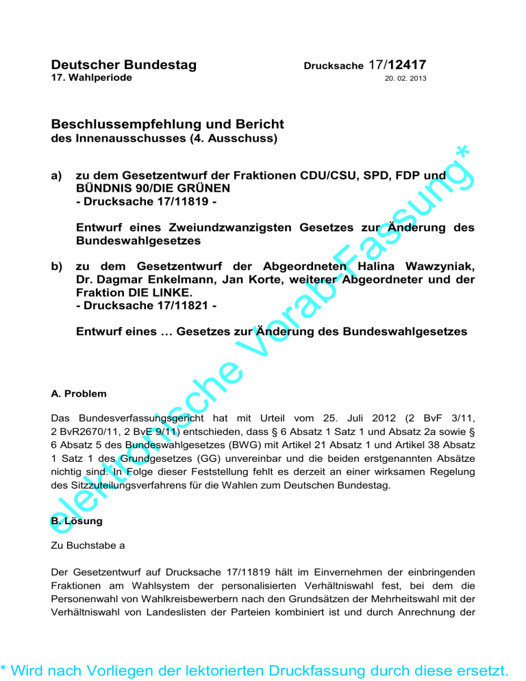 Deutscher Bundestag Drucksache 17. Wahlperiode 17/12417 20. 02. 2013 Beschlussempfehlung und Bericht * g n u des Innenausschusses (4. Ausschuss) a) zu dem Gesetzentwurf der Fraktionen CDU/CSU, SPD, FDP und BÜNDNIS 90/DIE GRÜNEN - Drucksache 17/11819 - a F s s Entwurf eines Zweiundzwanzigsten Gesetzes zur Änderung des Bundeswahlgesetzes b) b zu dem Gesetzentwurf der Abgeordneten Halina Wawzyniak, Dr. Dagmar Enkelmann, Jan Korte, weiterer Abgeordneter und der Fraktion DIE LINKE. - Drucksache 17/11821 - V a r o Entwurf eines … Gesetzes zur Änderung des Bundeswahlgesetzes A. Problem i n c s e h Das Bundesverfassungsgericht hat mit Urteil vom 25. Juli 2012 (2 BvF 3/11, 2 BvR2670/11, 2 BvE 9/11) entschieden, dass § 6 Absatz 1 Satz 1 und Absatz 2a sowie § 6 Absatz 5 des Bundeswahlgesetzes (BWG) mit Artikel 21 Absatz 1 und Artikel 38 Absatz 1 Satz 1 des Grundgesetzes (GG) unvereinbar und die beiden erstgenannten Absätze nichtig sind. In Folge dieser Feststellung fehlt es derzeit an einer wirksamen Regelung des Sitzzuteilungsverfahrens für die Wahlen zum Deutschen Bundestag. rt o k e l e B. Lösung Zu Buchstabe a Der Gesetzentwurf auf Drucksache 17/11819 hält im Einvernehmen der einbringenden Fraktionen am Wahlsystem der personalisierten Verhältniswahl fest, bei dem die Personenwahl von Wahlkreisbewerbern nach den Grundsätzen der Mehrheitswahl mit der Verhältniswahl von Landeslisten der Parteien kombiniert ist und durch Anrechnung der * Wird nach Vorliegen der lektorierten Druckfassung durch diese ersetzt. 2 gewonnenen Direktmandate auf die Listenmandate der Grundcharakter der Verhältniswahl gewahrt wird. Zur Vermeidung des Phänomens des so genannten negativen Stimmgewichts wird die mit dem 19. Gesetz zur Änderung des Bundeswahlgesetzes vom 25.11.2011 (BGBl. I S. 2313) eingeführte länderweise Verteilung der Sitze auf die Landeslisten der Parteien in modifizierter Form als erste Stufe der Sitzverteilung beibehalten. * g n u Zum Ausgleich von Überhangmandaten wird in einer zweiten Stufe der Sitzverteilung die Gesamtzahl der Sitze so weit erhöht, bis bei anschließender bundesweiter Oberverteilung an die Parteien und Unterverteilung auf die Landeslisten alle Wahlkreismandate auf Zweitstimmenmandate der Partei angerechnet werden können. a F s s Annahme des Gesetzentwurfs auf Drucksache 17/11819 in geänderter Fassung mit den Stimmen der Fraktionen CDU/CSU, SPD, FDP und BÜNDNIS 90/DIE GRÜNEN gegen die Stimmen der Fraktion DIE LINKE. Zu Buchstabe b a r o b Ablehnung des Gesetzentwurfs auf Drucksache 17/11821 mit den Stimmen der Fraktionen CDU/CSU, SPD, FDP und BÜNDNIS 90/DIE GRÜNEN gegen die Stimmen der Fraktion DIE LINKE. e h C. Alternativen c s V Annahme des Gesetzentwurfs auf Drucksache 17/11821. rt o i n D. Finanzielle Auswirkungen Durch die Änderung des Bundeswahlgesetzes fallen Kosten insoweit an, als die Software des Bundeswahlleiters zur IT-unterstützten Ermittlung des Wahlergebnisses an das neue Verfahren der Mandatszuteilung angepasst werden muss. Sofern sich nach dem Ergebnis einer Bundestagswahl die Gesamtzahl der Sitze erhöht, fallen nach dem Abgeordnetengesetz Mehrkosten für die Amtsausstattung, Abgeordnetenentschädigung und Versorgungsansprüche weiterer Abgeordneter an. l e k e * Wird nach Vorliegen der lektorierten Druckfassung durch diese ersetzt. 3 Beschlussempfehlung Der Bundestag wolle beschließen, a) den Gesetzentwurf auf Drucksache 17/11819 mit folgenden Maßgaben, im Übrigen unverändert anzunehmen: * g n u Artikel 1 wird wie folgt geändert: 1. Nummer 1 wird wie folgt geändert: a) b) s s Absatz 2 Satz 1 wird wie folgt gefasst: „In einer ersten Verteilung wird zunächst die Gesamtzahl der Sitze (§ 1 Absatz 1) in dem in Satz 2 bis 7 beschriebenen Berechnungsverfahren den Ländern nach deren Bevölkerungsanteil (§ 3 Absatz 1) und sodann in jedem Land die Zahl der dort nach Absatz 1 Satz 3 verbleibenden Sitze auf der Grundlage der zu berücksichtigenden Zweitstimmen den Landeslisten zugeordnet.“ a r o b a F In Absatz 7 Satz 1 werden jeweils die Wörter „zu vergebenden“ gestrichen. V 2. Nach Nummer 1 wird folgende Nummer 1a eingefügt: e h ‚1a. In § 46 Absatz 2 wird die Angabe „§ 6 Abs. 4 Satz 3“ durch die Wörter „§ 6 Absatz 6 Satz 5“ ersetzt.‘; i n c s b) den Gesetzentwurf auf Drucksache 17/11821 abzulehnen. l e k e rt o * Wird nach Vorliegen der lektorierten Druckfassung durch diese ersetzt. 4 Berlin, den 20. Februar 2013 Der Innenausschuss Wolfgang Bosbach Vorsitzender Reinhard Grindel Berichterstatter Gabriele Fograscher Berichterstatterin Dr. Stefan Ruppert Berichterstatter k e l e e h c s i n rt o Wolfgang Wieland Berichterstatter a r o s s a F b * g n u V Halina Wawzyniak Berichterstatterin * Wird nach Vorliegen der lektorierten Druckfassung durch diese ersetzt. 5 Bericht der Abgeordneten Reinhard Grindel, Gabriele Fograscher, Dr. Stefan Ruppert, Halina Wawzyniak und Wolfgang Wieland I. Zum Verfahren * g n u 1. Überweisung Die Gesetzentwürfe auf Drucksachen 17/11819 und 17/11821 wurden in der 215. Sitzung des Deutschen Bundestages am 14. Dezember 2012 an den Innenausschuss federführend sowie an den Rechtsausschuss zur Mitberatung überwiesen. s s a F 2. Votum des mitberatenden Ausschusses b Zu Buchstabe a Der Rechtsausschuss hat in seiner 117. Sitzung am 20. Februar 2013 mit den Stimmen der Fraktionen CDU/CSU, SPD, FDP und BÜNDNIS 90/DIE GRÜNEN gegen die Stimmen der Fraktion DIE LINKE. empfohlen, den Gesetzentwurf in der Fassung des Änderungsantrags auf Ausschussdrucksache 17(4)665 anzunehmen. V a r o Zu Buchstabe b Der Rechtsausschuss hat in seiner 117. Sitzung am 20. Februar 2013 mit den Stimmen der Fraktionen CDU/CSU, SPD, FDP und BÜNDNIS 90/DIE GRÜNEN gegen die Stimmen der Fraktion DIE LINKE. die Ablehnung des Gesetzentwurfs empfohlen. i n c s e h 3. Beratungen im federführenden Ausschuss rt o Der Innenausschuss hat in seiner 88. Sitzung am 12. Dezember 2012 einvernehmlich beschlossen, eine öffentliche 