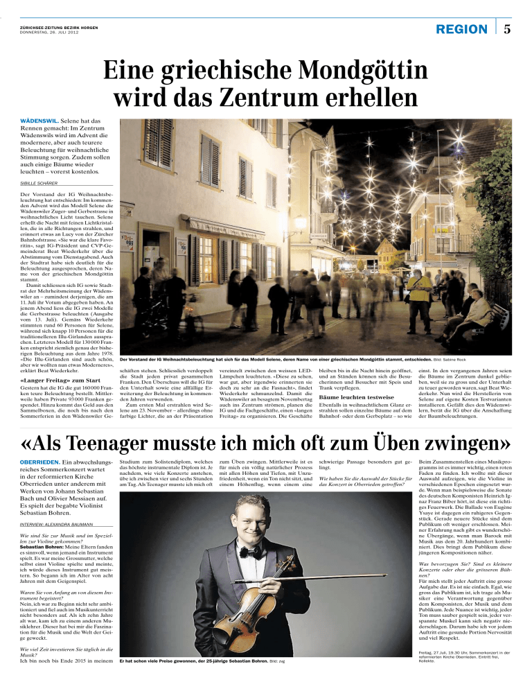 region Zürichsee-Zeitung BeZirk horgen Donnerstag, 26. Juli 2012 5 Eine griechische Mondgöttin wird das Zentrum erhellen WädensWil. Selene hat das Rennen gemacht: Im Zentrum Wädenswils wird im Advent die modernere, aber auch teurere Beleuchtung für weihnachtliche Stimmung sorgen. Zudem sollen auch einige Bäume wieder leuchten – vorerst kostenlos. Sibille Schärer Der Vorstand der IG Weihnachtsbeleuchtung hat entschieden: Im kommenden Advent wird das Modell Selene die Wädenswiler Zuger- und Gerbestrasse in weihnachtliches Licht tauchen. Selene erhellt die Nacht mit feinen Lichtkristallen, die in alle Richtungen strahlen, und erinnert etwas an Lucy von der Zürcher Bahnhofstrasse. «Sie war die klare Favoritin», sagt IG-Präsident und CVP-Gemeinderat Beat Wiederkehr über die Abstimmung vom Dienstagabend. Auch der Stadtrat habe sich deutlich für die Beleuchtung ausgesprochen, deren Name von der griechischen Mondgöttin stammt. Damit schliessen sich IG sowie Stadtrat der Mehrheitsmeinung der Wädenswiler an – zumindest derjenigen, die am 11. Juli ihr Votum abgegeben haben. An jenem Abend liess die IG zwei Modelle die Gerbestrasse beleuchten (Ausgabe vom 13. Juli). Gemäss Wiederkehr stimmten rund 60 Personen für Selene, während sich knapp 10 Personen für die traditionelleren Illu-Girlanden aussprachen. Letzteres Modell für 130 000 Franken entspricht ziemlich genau der bisherigen Beleuchtung aus dem Jahre 1978. «Die Illu-Girlanden sind auch schön, aber wir wollten nun etwas Moderneres», erklärt Beat Wiederkehr. «Langer Freitag» zum Start Gestern hat die IG die gut 160 000 Franken teure Beleuchtung bestellt. Mittlerweile haben Private 93 000 Franken gespendet. Hinzu kommt das Geld aus den Sammelboxen, die noch bis nach den Sommerferien in den Wädenswiler Ge- der Vorstand der ig Weihnachtsbeleuchtung hat sich für das Modell selene, deren name von einer griechischen Mondgöttin stammt, entschieden. Bild: sabine rock schäften stehen. Schliesslich verdoppelt die Stadt jeden privat gesammelten Franken. Den Überschuss will die IG für den Unterhalt sowie eine allfällige Erweiterung der Beleuchtung in kommenden Jahren verwenden. Zum ersten Mal erstrahlen wird Selene am 23. November – allerdings ohne farbige Lichter, die an der Präsentation vereinzelt zwischen den weissen LEDLämpchen leuchteten. «Diese zu sehen, war gut, aber irgendwie erinnerten sie doch zu sehr an die Fasnacht», findet Wiederkehr schmunzelnd. Damit die Wädenswiler an besagtem Novembertag auch ins Zentrum strömen, planen die IG und die Fachgeschäfte, einen «langen Freitag» zu organisieren. Die Geschäfte bleiben bis in die Nacht hinein geöffnet, und an Ständen können sich die Besucherinnen und Besucher mit Speis und Trank verpflegen. Bäume leuchten testweise Ebenfalls in weihnachtlichem Glanz erstrahlen sollen einzelne Bäume auf dem Bahnhof- oder dem Gerbeplatz – so wie einst. In den vergangenen Jahren seien die Bäume im Zentrum dunkel geblieben, weil sie zu gross und der Unterhalt zu teuer geworden waren, sagt Beat Wiederkehr. Nun wird die Herstellerin von Selene auf eigene Kosten Testvarianten installieren. Gefällt dies den Wädenswilern, berät die IG über die Anschaffung der Baumbeleuchtungen. «Als Teenager musste ich mich oft zum Üben zwingen» oBerrieden. Ein abwechslungsreiches Sommerkonzert wartet in der reformierten Kirche Oberrieden unter anderem mit Werken von Johann Sebastian Bach und Olivier Messiaen auf. Es spielt der begabte Violinist Sebastian Bohren. Studium zum Solistendiplom, welches das höchste instrumentale Diplom ist. Je nachdem, wie viele Konzerte anstehen, übe ich zwischen vier und sechs Stunden am Tag.Als Teenager musste ich mich oft zum Üben zwingen. Mittlerweile ist es für mich ein völlig natürlicher Prozess mit allen Höhen und Tiefen, mit Unzufriedenheit, wenn ein Ton nicht sitzt, und einem Höhenflug, wenn einem eine interview: alexandra baumann Wie sind Sie zur Musik und im Speziellen zur Violine gekommen? sebastian Bohren: Meine Eltern fanden es sinnvoll, wenn jemand ein Instrument spielt. Es war meine Grossmutter, welche selbst einst Violine spielte und meinte, ich würde dieses Instrument gut meistern. So begann ich im Alter von acht Jahren mit dem Geigenspiel. schwierige Passage besonders gut gelingt. Wie haben Sie die Auswahl der Stücke für das Konzert in Oberrieden getroffen? Beim Zusammenstellen eines Musikprogramms ist es immer wichtig, einen roten Faden zu finden. Ich wollte mit dieser Auswahl aufzeigen, wie die Violine in verschiedenen Epochen eingesetzt wurde. Wenn man beispielsweise die Sonate des deutschen Komponisten Heinrich Ignaz Franz Biber hört, ist diese ein richtiges Feuerwerk. Die Ballade von Eugène Ysaye ist dagegen ein ruhigeres Gegenstück. Gerade neuere Stücke sind dem Publikum oft weniger erschlossen. Meiner Erfahrung nach gibt es wunderschöne Übergänge, wenn man Barock mit Musik aus dem 20. Jahrhundert kombiniert. Dies bringt dem Publikum diese jüngeren Kompositionen näher. Waren Sie von Anfang an von diesem Instrument begeistert? Nein, ich war zu Beginn nicht sehr ambitioniert und fiel auch im Musikunterricht nicht besonders auf. Als ich zehn Jahre alt war, kam ich zu einem anderen Musiklehrer. Dieser hat bei mir die Faszination für die Musik und die Welt der Geige geweckt. Was bevorzugen Sie? Sind es kleinere Konzerte oder eher die grösseren Bühnen? Für mich stellt jeder Auftritt eine grosse Aufgabe dar. Es ist nie einfach. Egal, wie gross das Publikum ist, ich trage als Musiker eine Verantwortung gegenüber dem Komponisten, der Musik und dem Publikum. Jede Nuance ist wichtig, jeder Ton muss sauber gespielt sein, jeder verspannte Muskel kann sich negativ niederschlagen. Darum habe ich vor jedem Auftritt eine gesunde Portion Nervosität und viel Respekt. Wie viel Zeit investieren Sie täglich in die Musik? Ich bin noch bis Ende 2015 in meinem Freitag, 27.Juli, 19.30 uhr, sommerkonzert in der reformierten 