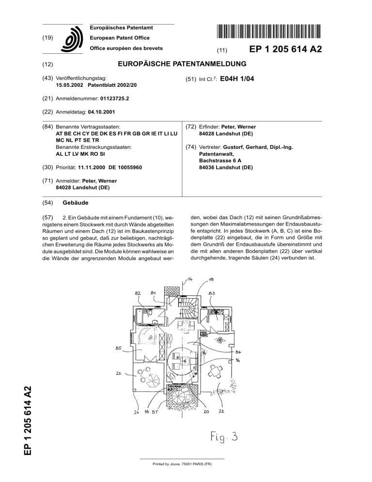 Europäisches Patentamt (19) European Patent Office *EP001205614A2* Office européen des brevets (11) EP 1 205 614 A2 EUROPÄISCHE PATENTANMELDUNG (12) (43) Veröffentlichungstag: (51) Int Cl.7: 15.05.2002 Patentblatt 2002/20 E04H 1/04 (21) Anmeldenummer: 01123725.2 (22) Anmeldetag: 04.10.2001 (84) Benannte Vertragsstaaten: (72) Erfinder: Peter, Werner AT BE CH CY DE DK ES FI FR GB GR IE IT LI LU MC NL PT SE TR Benannte Erstreckungsstaaten: AL LT LV MK RO SI (30) Priorität: 11.11.2000 DE 10055960 84028 Landshut (DE) (74) Vertreter: Gustorf, Gerhard, Dipl.-Ing. Patentanwalt, Bachstrasse 6 A 84036 Landshut (DE) (71) Anmelder: Peter, Werner 84028 Landshut (DE) (54) Gebäude den, wobei das Dach (12) mit seinen Grundrißabmessungen den Maximalabmessungen der Endausbaustufe entspricht. In jedes Stockwerk (A, B, C) ist eine Bodenplatte (22) eingebaut, die in Form und Größe mit dem Grundriß der Endausbaustufe übereinstimmt und die mit allen anderen Bodenplatten (22) über vertikal durchgehende, tragende Säulen (24) verbunden ist. EP 1 205 614 A2 (57) 2. Ein Gebäude mit einem Fundament (10), wenigstens einem Stockwerk mit durch Wände abgeteilten Räumen und einem Dach (12) ist im Baukastenprinzip so geplant und gebaut, daß zur beliebigen, nachträglichen Erweiterung die Räume jedes Stockwerks als Module ausgebildet sind. Die Module können wahlweise an die Wände der angrenzenden Module angebaut wer- Printed by Jouve, 75001 PARIS (FR) 1 EP 1 205 614 A2 Beschreibung [0001] Die Erfindung betrifft ein Gebäude mit einem Fundament, wenigstens einem Stockwerk mit durch Wände abgeteilten Räumen und einem Dach, wobei die Räume jedes Stockwerks als Module ausgebildet sind, die wahlweise an die Wände der angrenzenden Module anbaubar sind. [0002] Gebäude, insbesondere Wohnhäuser, werden im allgemeinen nach individuellen Wünschen und Anforderungen geplant und errichtet. Dies gilt vor allem für freistehende Einfamilienhäuser. Zum Einsparen von Planungs- und Baukosten ist es daneben auch bekannt, freistehende Typenhäuser oder Reihenhäuser mit übereinstimmenden Grundrissen und Raumaufteilungen zu bauen. [0003] Insbesondere zur Errichtung vorübergehend genutzter Gebäude, beispielsweise Arbeiterunterkünfte oder auch Schulen, ist es ferner bekannt, genormte Container für jeweils einen Raum vorzusehen und diese der Funktion entsprechend einander zuzuordnen. Diese sehr kostengünstige Lösung hat allerdings den Nachteil, daß sie nicht für auf Dauer bestimmte Gebäude geeignet ist. [0004] Schließlich ist es auch Stand der Technik, Wohneinheiten, insbesondere Mehrfamilienhäuser, in Plattenbauweise zu errichten, wobei die Wände jeweils aus vorgefertigen Platten bestehen, die gegebenenfalls bereits mit Fenstern und/oder Türen ausgestattet sind. Diese Lösung erlaubt allerdings keine ästhetisch ansprechende Gestaltung des Gebäudes, das ebenfalls bereits von Anfang an in seiner endgültigen Form und Größe errichtet wird. [0005] Der Erfindung liegt die Aufgabe zugrunde, ein Gebäude so zu entwerfen, daß es bereits von Anfang an eine vorläufige maximale Endausbaustufe berücksichtigt und so gestaltet ist, daß je nach Bedarf problemlos einzelne Räume nachträglich an- oder eingebaut werden können, ohne die grundsätzliche Konstruktion der Stockwerke und des Daches verändern zu müssen. [0006] Bei einem Gebäude der eingangs umrissenen Bauart wird diese Aufgabe erfindungsgemäß dadurch gelöst, daß in jedes Stockwerk eine Bodenplatte eingebaut ist, die in Form und Größe mit dem Grundriß einer Endausbaustufe des Gebäudes übereinstimmt und die mit allen anderen Bodenplatten über vertikal durchgehende, tragende Säulen verbunden ist. Das Dach kann mit seinen projizierten Grundrißabmessungen den Maximalabmessungen der Endausbaustufe entsprechen. [0007] Mit diesem Baukastenprinzip ist es in wirtschaftlicher und konstruktiv einfacher Weise möglich, zunächst ein Gebäude mit den unbedingt notwendigen Räumen zu erstellen und zu späteren Zeitpunkten weitere Räume zu ergänzen, die mit ihren Wänden lediglich eingeschoben oder angebaut werden. Die Statik der Endausbaustufe ist aufgrund der von Anfang an vorhandenen, tragenden Säulen und Bodenplatten berücksichtigt. Die Module können aus vorgefertigten Bautei- 5 10 15 20 25 30 35 40 45 50 55 2 2 len bestehen oder in herkömmlicher Weise von Hand gemauert werden. [0008] Die Erfindung gestattet die Errichtung ansprechender Wohnhäuser oder Bürogebäude, die trotz kostengünstiger Bauweise weder die Nachteile der Plattenbauweise noch die Nachteile vorgefertigter, einheitlicher Typenbauten im Stil einer eintönigen Siedlung aufweisen. Vielmehr können die Gebäude individuell geplant werden und im Falle von Ein- oder Mehrfamilienhäusern mit der Familie mitwachsen. Wohnanlagen, insbesondere Eigentumswohnungen, können problemlos erweitert werden. [0009] Die Gebäude gemäß der Erfindung gestatten andererseits auch eine Verkleinerung in dem Sinne, daß ein späterer Umbau in mehrere, kleinere Wohneinheiten möglich ist, was wirtschaftlich günstig sein kann und oftmals eine Wertsteigerung mit sich bringt. [0010] Daneben ist es auch möglich, Gebäude gemäß der Erfindung für gewerbliche Zwecke zu planen und zu errichten, beispielsweise für kleine und mittlere Fabrikationsstätten, Lagerhäuser oder auch für öffentliche Gebäude wie Schulen oder Kindergärten. [0011] Eine wirtschaftliche und konstruktiv vorteilhafte Weiterbildung besteht darin, daß der Frist des Daches in der Längs- oder Quermittelachse des Gebäudes liegt, das ein Doppelhaus oder ein Reihenhaus sein kann. Die Mittelachse kann gleichzeitig Längsmittelachse eines Moduls für einen Eingangsbereich (Treppenhaus) und einen zentralen Wohnraum sein, an dessen vom Eingangsbereich abgewandter Seite eine Terrasse oder ein Balkon angeschlossen werden kann. [0012] Die Länge des zentralen Wohnraumes kann variabel sein. [0013] Die zu beiden Seiten des zentralen Wohnrau