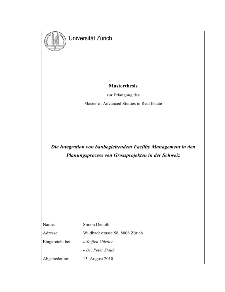 Universität Zürich Masterthesis zur Erlangung des Master of Advanced Studies in Real Estate Die Integration von baubegleitendem Facility Management in den Planungsprozess von Grossprojekten in der Schweiz Name: Simon Denoth Adresse: Wildbachstrasse 58, 8008 Zürich Eingereicht bei: ● Steffen Gürtler ● Dr. Peter Staub Abgabedatum: 13. August 2010 Abstract Das baubegleitende Facility Management (bFM) hat sich in den letzten Jahren als fester Bestandteil einer modernen Projektorganisation zur Erstellung von Gebäuden in der Schweiz etabliert. Dennoch gibt es, zumindest zu Teilbereichen der Disziplin, divergierende Ansichten über den Aufgabenbereich des bFM im Schweizer Immobilienmarkt. Die vorliegende Arbeit versucht die wichtigsten Stossrichtungen zu charakterisieren. Anhand eines ökonomischen Ansatzes wird das Beratungsfeld des bFM eingegrenzt. Die Konkretisierung von Funktionen und Zielen der Projektstelle ‚baubegleitendes Facility Management‘ sowie deren Integration in ein Projekt erfolgt anhand von ausgesuchten Praxisbeispielen und im Austausch mit Dienstleistungsanbietern. Dabei hat sich gezeigt, dass eine frühzeitige Integration des bFM bedeutende Einsparungen bei den Kapitalkosten eines Gebäudes erwirken kann. Dies ist insofern relevant, als dass – entgegen der verbreiteten Meinung – das Einsparpotential bei den Kapitalkosten dasjenige bei den Betriebskosten um ein Mehrfaches übersteigt. Dagegen scheinen die Entwicklungsmöglichkeiten hinsichtlich der Optimierung der Betriebskosten weitgehend ausgeschöpft zu sein. I Inhaltsverzeichnis I. Einleitung .................................................................................................................. 1 1 Ausgangslage ...................................................................................................... 1 2 Kernfragen und Zielsetzung ................................................................................ 1 3 Vorgehen und Methodik ..................................................................................... 2 4 Abgrenzung ......................................................................................................... 2 II. Baubegleitendes Facility Management im Schweizer Immobilienmarkt: Modell und Definitionen ......................................................... 3 1 Ökonomisches Modell zur Betrachtungsweise eines Gebäudes ......................... 3 2 Die Kostenstellen eines Gebäudes ...................................................................... 4 2.1 Die Bedeutung der Kostenstellen eines Gebäudes und deren Beeinflussbarkeit ......................................................................................... 4 2.2 Definitionen der wichtigsten Kostenstellen eines Gebäudes ....................... 6 2.3 Modellrechnung zur Beeinflussbarkeit und zum Sparpotential der wichtigsten Kostentreiber ............................................................................ 7 2.4 Planungs- und Steuerungsprozesse der Kostenstellen und deren phasenspezifische Erscheinung.................................................................... 8 2.5 Beraterleistungen zu den Planungs- und Steuerungsprozessen der wichtigsten Kostenstellen .......................................................................... 10 III. Baubegleitendes Facility Management in der Schweiz ....................................... 12 1 Ausgangslage .................................................................................................... 12 2 Leistungsbereiche des baubegleitenden Facility Managements ....................... 13 3 Die Projektphasen des baubegleitenden Facility Managements nach SIA Ordnung 112 .............................................................................................. 13 4 Planung des Betriebs ......................................................................................... 14 5 4.1 Die Planungsbereiche der Betriebskosten.................................................. 14 4.2 Wechselwirkung von Betriebs- und Investitionskosten............................. 16 4.3 Wechselwirkung von Betriebs- und Instandsetzungskosten ...................... 16 4.4 Instrumente zur Betriebskostenplanung..................................................... 17 Planung der Kapitalkosten ................................................................................ 19 5.1 Planungsbereiche der Kapitalkosten .......................................................... 19 5.2 Instrumente zur Optimierung der Nutzungseffizienz, Nutzungsflexibilität und Flächenqualität ................................................... 20 II 6 Baubegleitendes Facility Management im Kontext der Interessenslagen der Objektbeteiligten ............................................................. 21 7 6.1 Eigentümer ................................................................................................. 21 6.2 Nutzer / Mieter ........................................................................................... 22 6.3 Bewirtschaftungsdienstleister .................................................................... 23 Organisatorische Integration des baubegleitenden Facility Managements in ein Projekt.............................................................................. 23 8 Einsparpotential durch Optimierung von Betriebs- und Investitions/Kapitalkosten durch baubegleitendes Facility Management ........................... 25 IV. Baubegleitendes Facility Management im Kontext der aktuellen Entwicklung und des europäischen Raumes ....................................................... 27 1 Aktuelle Entwicklungen.................................................................................... 27 2 Normen ............................................................................................................. 28 V. Fazit ......................................................................................................................... 30 VI. P