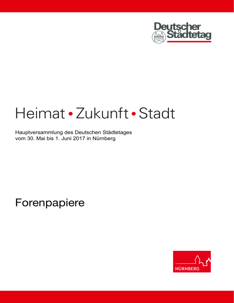 Heimat Zukunft Stadt Hauptversammlung des Deutschen Städtetages vom 30. Mai bis 1. Juni 2017 in Nürnberg Forenpapiere 2 Forenpapiere Inhalt Inhaltsverzeichnis Forum A: Soziales Leben in der Stadt: Wie ändert sich unser Zusammenleben? Seite 4 Forum B: Mobiles Leben in der Stadt: nachhaltig, klimaschonend, flexibel Seite 8 Forum C: Lebendige Innenstädte: Zukunft von Stadt und Handel Seite 12 Forum D: Kulturelles Leben in der Stadt: vielfältig, weltoffen, identitätsstiftend Seite 18 Forum E: Heimat • Zukunft • Stadt – auch eine Frage des Geldes! Seite 24 Interfraktionelle Frauensitzung Gender Mainstreaming und Diversity im Kontext kommunaler Gleichstellungspolitik Seite 28 Forenpapiere 3 Forum A Forum A: Soziales Leben in der Stadt: Wie ändert sich unser Zusammenleben? Mittwoch, 31. Mai 2017 14:30 bis 15:30 Uhr Veranstaltungsort:Nürnberg Messe (NCC Ost), Messezentrum 1, 90471 Nürnberg Der Raum wird vor Ort bekannt gegeben. Gesprächsrunde:Dr. Dieter Salomon Oberbürgermeister der Stadt Freiburg im Breisgau und Stellvertreter der Präsidentin des Deutschen Städtetages Eva-Maria Welskop-Deffaa Designierter Vorstand Sozial- und Fachpolitik Deutscher Caritasverband Moderatorin:Corinna Mielke Bayerischer Rundfunk Hauptgeschäftsstelle:Stefan Hahn Beigeordneter des Deutschen Städtetages im Dezernat Arbeit, Jugend, Gesundheit und Soziales Dr. Helmut Fogt Beigeordneter des Deutschen Städtetages im Dezernat Recht und Verwaltung Regina Offer Hauptreferentin des Deutschen Städtetages im Dezernat Arbeit, Jugend, Gesundheit und Soziales 4 Forenpapiere Forum A Soziales Leben in der Stadt: Wie ändert sich unser Zusammenleben? Gesellschaftliche Veränderungen, wie z. B. die demografische Entwicklung, die Zunahme kultureller Vielfalt und die Individualisierung prägen das soziale Miteinander in den Städten ebenso wie ökonomische und technische Veränderungen durch Globalisierung und Digitalisierung. Die Zukunftsfähigkeit und langfristige Finanzierbarkeit unserer sozialen Sicherungssysteme Dr. Dieter Salomon Oberbürgermeister der Stadt Freiburg im Breisgau, Stellvertreter der Präsidentin des Deutschen Städtetages „Zusammen sind wir Heimat” ist das Kampagnenthema des Caritasverbandes 2017. Es geht uns darum, wo und wie wir zusammen arbeiten und lachen, gemeinsam Sport treiben und in Freundschaft miteinander verbunden sind – unabhängig von Alter und Herkunft, unabhängig von Einkommen und Geschlecht. Dafür setzt sich die Caritas ein: für eine offene Gesellschaft, in der wir Teilhabechancen für alle gestalten. Unser besonderes Augenmerk gilt den dynamischen Veränderungen, die mit der Digitalisierung verbunden sind. Wir wollen darauf achten, dass keine neuen Barrieren entstehen.“ beschäftigt die Menschen. Sie stellen sich aber auch die Frage, wie ein friedliches und den unterschied­ lichen Interessen gerecht werdendes Zusammenleben in der lokalen Gemeinschaft gelingen wird. Das Forum wird sich mit wichtigen Zukunftstrends und möglichen Konsequenzen für das Zusammenleben vor Ort beschäftigen. „Es ist eine zentrale Aufgabe der Städte, das soziale Zusammenleben der Bürgerinnen und Bürger aktiv zu gestalten durch eine Infrastruktur, die den Ansprüchen aller Generationen und Interessengruppen gerecht wird. Die Integration von Menschen mit Migrationshintergrund stellt eine besonders wichtige Aufgabe der Sozial- und Bildungspolitik dar. Die Kommunen brauchen dafür aber die Unterstützung von Bund und Ländern und eine auskömmliche Finanzausstattung.“ Eva-Maria Welskop-Deffaa Designierter Vorstand Sozialund Fachpolitik Deutscher Caritasverband Forenpapiere 5 Forum A Forenpapier für Forum A Die Zukunftsfähigkeit und langfristige Finanzierbarkeit unserer sozialen Sicherungssysteme beschäftigt die Menschen. Sie stellen sich aber auch die Frage, wie ein friedliches und den unterschiedlichen Interessen gerecht werdendes Zusammenleben in der lokalen Gemeinschaft gelingen wird. Der demografische Wandel gehört zu den früh prog­ nostizierten Veränderungen der gegenwärtigen Gesellschaft in vielen Industrienationen, ganz besonders aber auch in Deutschland. Im Jahr 2002 hat die vom Deutschen Bundestag eingesetzte Enquete-Kommis­sion „Demografischer Wandel“ eine umfassende Analyse der demografischen Veränderungen und ihrer Fol­gen für das Gefüge des Sozialstaates vorgelegt. Vier miteinander verknüpfte Zukunftstrends müssen auf ihre grundsätzliche Bedeutung für die Sozialsysteme in Deutschland analysiert werden: • Die Geburtenrate wird voraussichtlich auf einem niedrigen Niveau verharren. Gleichzeitig nimmt die Lebenserwartung der Menschen durch Fortschritte in der medizinischen Diagnostik, bei den Therapiemöglichkeiten und durch die weit entwickelte Gesundheitsvorsorge zu. • Eine zahlenmäßig kleinere Bevölkerung wird zu einer abnehmenden Bevölkerungsdichte mit stark ausgeprägten regionalen Unterschieden führen. • Die Verschiebungen in der Altersstruktur der Bevölkerung sind voraussichtlich sehr stark. Auch eine kontinuierliche Zuwanderung kann diese nicht ausgleichen, sondern bestenfalls abmildern. • Immer weniger junge Menschen stehen immer mehr älteren Menschen gegenüber, das Durchschnittsalter der erwerbsfähigen Bevölkerung und der Gesamtbevölkerung nimmt deutlich zu. Die Alterung der Gesellschaft als Herausforderung für den Sozialstaat Die Alterung der Gesellschaft wirkt sich einschneidend auf verschiedene Bereiche des Sozialstaates aus. Das zahlenmäßige Verhältnis zwischen Erwerbspersonen, die vergleichsweise hohe Beiträge und Steuern entrichten, auf der einen und Rentnern und Pensionären auf der anderen Seite verändert sich deutlich. Die unterschiedliche Belastung und Inanspruchnahme sozialpolitischer Leistungen kann zu politischen Konflikten zwischen Jungen und Alten sowie zwischen familialen und 6 Forenpapiere nicht-familialen Lebensformen führen. Die Sozialpolitik muss Antworten geben auf Fragen der Generationengerechtigk