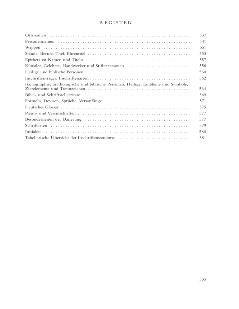 R egister Ortsnamen . . . . . . . . . . . . . . . . . . . . . . . . . . . . . . . . . . . . . . . . . . . . . . . . . . . . . . . . . . Personennamen . . . . . . . . . . . . . . . . . . . . . . . . . . . . . . . . . . . . . . . . . . . . . . . . . . . . . . . Wappen . . . . . . . . . . . . . . . . . . . . . . . . . . . . . . . . . . . . . . . . . . . . . . . . . . . . . . . . . . . . . Stände, Berufe, Titel, Ehrentitel . . . . . . . . . . . . . . . . . . . . . . . . . . . . . . . . . . . . . . . . . . Epitheta zu Namen und Titeln . . . . . . . . . . . . . . . . . . . . . . . . . . . . . . . . . . . . . . . . . . . Künstler, Gelehrte, Handwerker und Stifterpersonen . . . . . . . . . . . . . . . . . . . . . . . . . . . Heilige und biblische Personen . . . . . . . . . . . . . . . . . . . . . . . . . . . . . . . . . . . . . . . . . . . Inschriftenträger, Inschriftenarten . . . . . . . . . . . . . . . . . . . . . . . . . . . . . . . . . . . . . . . . . Ikonographie, mythologische und biblische Personen, Heilige, Embleme und Symbole, Zierelemente und Trennzeichen . . . . . . . . . . . . . . . . . . . . . . . . . . . . . . . . . . . . . . . . . . Bibel- und Schriftstellerzitate . . . . . . . . . . . . . . . . . . . . . . . . . . . . . . . . . . . . . . . . . . . . Formeln, Devisen, Sprüche, Versanfänge . . . . . . . . . . . . . . . . . . . . . . . . . . . . . . . . . . . . Deutsches Glossar . . . . . . . . . . . . . . . . . . . . . . . . . . . . . . . . . . . . . . . . . . . . . . . . . . . . . Reim- und Versinschriften . . . . . . . . . . . . . . . . . . . . . . . . . . . . . . . . . . . . . . . . . . . . . . Besonderheiten der Datierung . . . . . . . . . . . . . . . . . . . . . . . . . . . . . . . . . . . . . . . . . . . . Schriftarten . . . . . . . . . . . . . . . . . . . . . . . . . . . . . . . . . . . . . . . . . . . . . . . . . . . . . . . . . . Initialen . . . . . . . . . . . . . . . . . . . . . . . . . . . . . . . . . . . . . . . . . . . . . . . . . . . . . . . . . . . . . Tabellarische Übersicht der Inschriftenstandorte . . . . . . . . . . . . . . . . . . . . . . . . . . . . . . 537 541 551 553 557 558 560 562 564 569 571 575 577 577 579 580 581 535 Ortsnamen Afftendorf (Oftendorf ), ursprünglich bei Niederosterwitz 766 Aichelberg 382, 395, 397, 400, 401, 402, 403, 404, 405, 406, 407, 480, 485, 491, 493, 565 Albeck 13, 99, 323, 368, 453, 636, 650, 753 Altenmarkt, Karner 336†, 389†, 421 –, Pf k. 112, 115, 124, 139, 258†, 327†, 331, 332†, 360, 460, 461†, 465, 477, 551, 762 –, Ringmauer 180† Althofen, Fk. u. ehemal. Bürgerspitalk. 236, 296† –, Haus Burgstraße 9: 363 –, Pf k. 276†, 358†, 533, 534, 535†, 598 –,Salzburger Platz 6: 563 Alzey-Worms in RheinlandPfalz, Komturei 681 Annabichl, Schloß in Klagenfurt 565 Arnfels 413 Arnoldstein 226, 730, 749 Augsburg 223, 284, 378†, 435, 447, 456 Bad Kleinkirchheim 97 Bad St. Leonhard im Lavanttal 413 Baden bei Wien 372 –, Pf k. 436 Baierberg, Fk., 277† Bamberg, Bischof 85, 109, 399 –, Diözese 504 –, Rat 756 Blumenthal, Komturei 664 Brenitz-Kleinglödnitz, Fk. 303, 331, 360 Breslau 686 Brixen 58, 435, 498, 504, 518, 585 –, Bistum 435, 498, 577 Bruckendorf bei Launsdorf 738 Brückl, Pf k. St. Johannes d. T.· 256, 275, 278, 279, 286†, 287†, 340, 347, 348, 409 –, Fk. St. Lorenzen 40 –, Fk. Maria Magdalena 588, 605† –, Fk. St. Ulrich 292, 440†, 557, 562, 593 Bruneck 71, 528 –,Schloß Teissegg 528 Cilli 58, 638 Conegliano, St. Maria 339, 370 Cronberg im Taunus 253 Deinsberg, Pf k. 23, 25, 72†, 80, 125†, 481 Deutsch Griffen, Pf k. 129, 716 Dielach, Fk.122†, 582 Dieppurg (?) 686 Dobersberg, Fk. 391† Dobritsch, Pf k. 77, 288 Donauwörth, Komturei 620, 707 Dornhof, bei Frauenstein 456, 528, 561, 652† Drasendorf, Schloß 137, 536 Drasing, Schloß 518 Dürnfeld, Fk. 512 Dürnstein bei Friesach 257 Dürnstein, St. Stephan bei, Karner, 290 –, Fk. St. Jakob i. d. Wiese 724 Ebenthal, Schloß 22, 518 Eberstein 36, 157, 173, 206†, 242, 264, 342 –, Bildstock 613 –, Burgkapelle 438 –, Fk. St. Oswald 191† –,Schloß 509, 584, 645 –,Schloßkirche 283 Ehrenegg, Schloß 498 Ehrenhausen, Schloß 518 Feistritz ob Grades –, Haus Nr. 50: 666 –, Pf k. 297, 354 Feldkirchen 726 –, Amthof 536 –, Pf k. Stpf k. 99 Finkenstein, Burg 372 Flattnitz, Fk. 96, 333†, 760 Franken (Oberfranken) 342, 470, 638 –, Komturei 620, 646, 664, 679 Frauenstein 171, 298, 299, 414 –,Schloß, 298, 299, 382, 414 –,Schloßkapelle 280 Frauenstein bei Judenburg 242 Freudenthal, Komturei in Mähren 664, 679 Freyenthurn, Schloß in Klagenfurt 99, 565, 573, 717, 719 Friesach 46, 62, 93, 99, 507 –, Burghauptmannschaft 554 –, Deutschordenskirche 6, 11, 107†, 228, 238, 253, 304, 368, 604, 620, 646, 664, 681, 686, 707, 717, 719 –, Deut schorden skonvent 372, 679 –, Deutschordenshaus (?) 468† –, Deutschordensspital 638, 667 –, Dom i n i k a nerk i rche19, 184†, 257, 258†, 269, 378†, 450, 553 –, Dominikanerkloster 18, 22, 36, 39, 69†, 85, 109, 143, 171, 205, 216, 368, 429, 674 –, Fürstenhofgasse 7: 606, 607 –,Geyersberg 93, 368, 469, 614 –,Geyersberg, Kapelle 94 –, Hauptplatz 149, 181, 441, 594 –, Heiligblutkirche 51, 285, 680 –, Lapidarium bei der Stpf k. 186 –, Petersberg 187, 435 –, Fk. St. Peter am Petersberg 312 –,Schloß Lavant 435 –,Stadtmauer 375 –,Stadtmuseum 2, 101, 263, 668, 719 –,Stpf k. 7†, 10, 41, 58, 66, 73, 81, 88, 89†, 103, 141, 150, 157, 192, 212, 223, 229, 300, 349,361, 366, 392, 413, 415, 449, 469, 504, 572, 574, 599, 614, 689, 690 –, Virgilienberg, ehemal. Propsteik. hl. Virgil 53, 58, 68 537 Fügen, in Bayern 730 Fürstenfeld 413 Fulda, Abtei 386, 646 Gaisberg, Fk. 132†, 215, 224, 243, 254 –, Haus Nr. 12: 566 Gillitzstein, Gut 645, 726, 747 Glanegg 429, 673 –, Burg 242, 429 Glantschach 163 –, Pf k. 84 Glödnitz, Amthof 281†, 657 –, Pf k. 93, 151†, 215, 224, 445†, 617†, 723†, 750† Gmünd, Stadt 239, 545 Gö