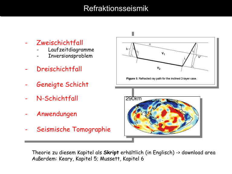 Refraktionsseismik - Zweischichtfall - Dreischichtfall - Geneigte Schicht - N-Schichtfall - Anwendungen - Seismische Tomographie - Laufzeitdiagramme Inversionsproblem Theorie zu diesem Kapitel als Skript erhältlich (in Englisch) -> download area Außerdem: Keary, Kapitel 5; Mussett, Kapitel 6 Refraktionsprofil Direkte Welle i Refraktion Tiefe h Reflektion v1 D v2 v1 < v2 Geometrie des Reflexions/Refraktionsexperiments. Drei Phasen werden bei größeren Distanzen beobachtet: die direkte Welle, die reflektierte Welle und die refraktierte Welle. Refraktionsexperiment: Ankunftszeiten Direkte Welle Reflektierte Welle Refraktierte Welle t dir D / v1 t refl 2 (D / 2) 2 h 2 v1 t refr 2h cos ic D D i t refr v1 v2 v2 Interzeptzeit Zweischichtfall Laufzeitdiagramm 120 100 T I m e (s) h=30km v1=5km/s v2=8km/s Intercept time 80 Reflected wave 60 40 Refracted wave 20 Direct wave 0 0 50 100 150 200 250 300 350 400 450 500 Distance (km) Dies würde einem einfachen Modell der Kruste und des oberen Mantels entsprechen. Kritische Distanz: Überholdistanz Die kritische Distanz Dc ist die Entfernung, bei der die refraktierte Welle gemäß der Strahlentheorie erstmals beobachtet werden kann (tatsächlich wird sie wegen finitem Frequenzgehalt schon bei kleineren Entfernungen beobachtet). Die kritische Distanz ergibt sich aus kritische Distanz D c 2h tan ic der kritische Winkel ic ist gegeben durch das Snellius Gesetz. Wenn wir die Laufzeit der direkten Welle mit der Laufzeit der refraktierten Welle gleichsetzen ergibt sich die Überholdistanz v2 v1 D ü 2h v2 v1 Das Inversionsproblem Erdmodell aus Laufzeitkurven • • • • • Bestimme v1 aus der Steigung (1/ v1 ) der direkten Welle Bestimme v2 aus der Steigung (1/ v2 ) der refraktierten Welle Bestimme kritischen Winkel aus v1 und v2. Lies Interzeptzeit ti aus Laufzeitkurve der refraktierten Welle Bestimme Tiefe h mit h oder • Ermittle Überholdistanz bestimme h mit D ü 2h aus v2 v1 v2 v1 v1ti 2 cos ic Laufzeitkurve und Dreischichtfall Refraction profile 3-layer case v1 < v2 < v3 D i12 v1 h1 i13 v2 v3 h2 i23 Wir brauchen Ankunftszeiten für • Direkte Welle • Refraktionen Figure 3: Geometry of 3-layer refraction experiment. Dreischichtenfall Ankunftszeiten Direkte Welle Refraktion in Schicht 2 Refraktion in Schicht 3 t1 D / v1 t2 2h1 cos i12 D D t i2 v1 v2 v2 t3 2h1 cos i13 2h2 cos i23 D D t i3 v1 v2 v3 v3 ti3 mit ... sin i13 sin i23 sin i33 1 v1 v2 v3 v3 Dreischichtfall Laufzeitkurven 1/v2 1/v1 ti3 ti2 1/v3 Figure 4: Travel-time diagram for the 3-layer case Das Inversionsproblem Dreischichtfall • • • Bestimme Geschwindigkeiten v1-3 aus Steigungen (1/v1-3) der Laufzeitkurven Lies Interzeptzeit ti2 der Refraktion in Schicht 2. Bestimme Höhe h1 mit der Gleichung für t2 damit , v1t i 2 h1 2 cos i12 where i12 arcsin v1 v2 • Lies Interzeptzeit ti3 der Refraktion in Schicht 3. • Berechne mit h1 eine Zwischeninterzeptzeit t* 2h cos i13 t t 1 v1 * • i3 where i13 arcsin v1 v3 Mit t* berechne h2 der Schicht 2 v2 t * h2 2 cos i23 mit i23 arcsin v2 v3 Geneigte Schicht Mit dieser asymmetrischen Anordnung benötigen wir Schüsse von beiden Seiten um h+ und h- zu bestimmen. Geneigte Schicht Laufzeiten t refr 2h cos ic sin( ic ) 1 D ti D v1 v1 v2 t refr 2h cos ic sin( ic ) 1 D t i D v1 v1 v2 Geneigte Schicht Laufzeitkurven Inversionproblem Geneigte Schicht • • • • Bestimme Geschwindigkeiten v1 and v2+/- aus den Steigungen der Laufzeitkurven. Bestimme and v2 über: sin( ic ) v1 v ic arcsin 1 v2 v2 sin( ic ) v1 v1 i arcsin c v 2 v 2 v (i ) (i ) i v2 1 2 sin i (i ) (i ) 2 Lies Interzeptzeiten ti+ and ti- aus den Laufzeitkurven. Bestimme die Distanz von der Schichtgrenze mit h h v1t i 2 cos ic v1t i 2 cos ic Zeichne Kreise um die Schusspunkte mit Radius h+/- und finde die Tangente dazu -> Schichtgrenze Der n-Schicht-Fall t2 t3 2h1 cos i12 D D t i2 v1 v2 v2 2h1 cos i13 2h2 cos i23 D D t i3 v v v v3 12 3 ti3 Dies lässt sich erweitern auf n Schichten: D n 1 2hi cos iin tn vn i 1 vi vi iin sin ( ) vn 1 Kontinuierliche Geschwindigkeitsmodelle t(p) Darstellung Hier ist p der Strahlparameter, also die Steigung der Laufzeitkurve, t ist der yAchsenabschnitt der Laufzeitkurve (Interzeptzeit) Verborgene Schichten – Verwerfungen Strahlen in komplexen Modellen Realistisches Reservoir Modell (Marmousi) Vergleich mit Simulation Beispiel: Erdkruste Continental crust (a) oceanic crust (b) Mit entsprechenden Laufzeiten The Erdkruste: Minerale und Geschwindigkeiten Erdkruste: Typen S shields, C Caledonian provinces, V Variscan provinces, R rifts, O orogens Die Erdkruste: Refraktionsexperimente Profil über N-Amerika: PmP Moho Reflektion Pn Moho Refraktion Pg Direkte P-Welle Globales Krustenmodell Krustendicke in km kompiliert aus seismischen Daten Moho Depth Heute: Krustenmodelle mit Rauschen! (Stehly et al., GJI, 2009) Rayleigh Wellen Geschwindigkeit (Stehly et al., GJI, 2009) Moho topo unter den Alpen (Stehly et al., GJI, 2009) Peaceful nuclear explosions (PNEs) PNE figures from Nielsen et al. 2002 Beobachtete Seismogramme (reduzierte Zeit) Synthetische (berechnete) Seismogramme Seismogramme mit streuendem oberen Mantel Globale Seismologie Laufzeiten PREM; 1D P-S Geschwindigkeiten und Dichte PREM: Preliminary Reference Earth Model (Dziewonski and Anderson, 1981) Seismische Tomographie . Angenommen wir haben eine Menge Laufzeitmessungen (verschiedene Messstationen, verschiedene Erdbeben, verschiedene seismische Phasen) Im Allgemeinen suchen wir das Erdmodell m, welches die Differenz der beobachteten mit den berechneten Laufzeiten minimiert T obs traveltimes Ttheory (m) Min! Für kugelsymmetrische Medien kann dieses Problem analytisch gelöst werden. Seismische Tomographie Die 3D Variationen der seismischen Geschwindigkeiten enthalten wertvolle Informationen über die Dynamik des Erdinnen. Seismische Tomographie zielt darauf ab, die Perturbationen der Geschwindigkeiten um ein Referenzmodell zu finden. Gibt es Unterschiede zur medizinischen Tomographie? Globale T