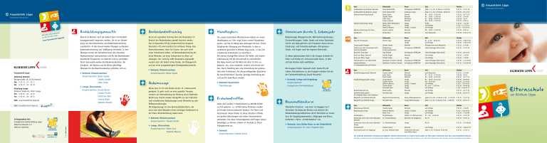 Frauenklinik Lippe Kurs ReferentIn Raum Zeit Telefon Kreißsaalführung Klinikum Detmold Team Geburtshilfe Vortragsraum MEDICUM jeden 1./3. Mi. im Monat, 19.00 Uhr 0 52 31 . 72 23 18 Kreißsaalführung Klinikum Lemgo Team Geburtshilfe Kreißsaal Lemgo jeden 2./4. Do. im Monat, 18.00 Uhr 0 52 61 . 26 41 63 Geburtsvorbereitung Demold Beata Szydlo Claudia Sander Jutta Twete Susann Grabsch Demold Detmold Blomberg Detmold Mi., 19.00 - 21.00 Uhr Mi., 19.00 - 21.00 Uhr Di., 18.00 - 20.00 Uhr Mo., 19.00 - 21.00 Uhr 0 52 31 . 30 77 59 0 52 31 . 2 44 89 0 52 36 . 10 63 0 52 32 . 8 06 44 Geburtsvorbereitung Lemgo Bärbel Heien-Weidemann Maren Just Stefanie Wessels Lemgo Lemgo Lemgo / Extertal Di/Do auf Anfrage auf Anfrage 0 52 61 . 1 36 38 0 170 . 4 77 27 01 0 170 . 7 03 10 03 Geburtsvorbereitung für Paare Susann Grabsch Detmold Mo., 19.00 - 21.00 Uhr 0 52 32 . 8 06 44 Gipsbäuche Danka Dasic Detmold nach Absprache 0 52 54 . 6 40 47 17 Kurs ReferentIn Raum Zeit Telefon Yoga für Schwangere Martina Hark Detmold Lemgo Di., 17.00 - 18.00 Uhr auf Anfrage 0 52 61 . 2 88 97 85 0 52 61 . 2 88 97 85 Craniosacrale Therapie Claudia Sander Detmold Einzeltermine nach Absprache 0 52 31 . 2 44 89 Ernährung in der Schwangerschaft / Gestationsdiabetes Diabetologe / Ernährungsberaterin Vortragsraum MEDICUM siehe Homepage Elternschule 0 52 31 . 72 23 18 Rauchfrei Schwanger Ingo Briegel Vortragsraum MEDICUM siehe Homepage Elternschule 0 52 31 . 26 42 94 Rund ums Baby, Detmold Claudia Krüger Detmold auf Anfrage 0 52 61 . 1 39 06 Rund ums Baby, Lemgo Claudia Krüger Lemgo auf Anfrage 0 52 61 . 1 39 06 Homöopathie in der Geburtshilfe Apotheker Christian Schmidt Vortragsraum MEDICUM siehe Homepage Elternschule 0 52 31 . 9 10 20 00 Selbstmedikation in Schwangerschaft und Stillzeit Apotheker Christian Schmidt Vortragsraum MEDICUM siehe Homepage Elternschule 0 52 31 . 9 10 20 00 Kurs ReferentIn Raum Zeit Telefon Rückbildungsgymnastik Detmold Claudia Sander Jutta Twete Beata Szydlo Detmold Blomberg Detmold nach Absprache Di., 20.15 - 21.30 Uhr Do., 19.00 - 20.40 Uhr 0 52 31 . 2 44 89 0 52 36 . 10 63 0 52 31 . 30 77 59 Rückbildungsgymnastik Lemgo Ursula Becker Claudia Fischer Stefanie Wessels Yvonne Blank Christiane Sehr Lemgo Lemgo Lemgo / Extertal Lemgo Lemgo Mi., 19.30 - 20.45 Uhr Mo., 19.45 Uhr auf Anfrage Di., 9.45 - 11.00 Uhr auf Anfrage 0 52 61 . 28 96 87 0 52 61 . 21 72 22 0 170 . 7 03 10 03 0 52 65 . 94 58 38 0 162 . 9 48 42 73 Beckenbodentraining Beata Szydlo Detmold auf Anfrage 0 52 31 . 30 77 59 Stillinformationsabend für werdende Eltern und Großeltern Henriette Hall Lemgo auf Anfrage 0 52 61 . 26 52 27 Babytreff und Stillcafé Detmold Regina Schirmer-Reining Evang. Bildungszentrum jeden 2./4. Mo. im Monat, 9.30 - 11.30 Uhr 0 52 31 . 72 22 30 Babytreff und Stillcafé Lemgo Henriette Hall Lemgo Wochenstation jeden 1./3. Di. im Monat, 9.30 - 11.00 Uhr 0 52 61 . 26 52 27 Kurs ReferentIn Raum Zeit Telefon Babymassage Detmold Claudia Sander Detmold auf Anfrage 0 52 31 . 2 44 89 Babymassage Lemgo Stefanie Wessels Maren Just Lemgo / Extertal Lemgo auf Anfrage auf Anfrage 0 170 . 7 03 10 03 0 52 61 . 77 02 88 Handlingkurs Physiotherapie Station 23, Wöchnerinnen Di. + Do., 11.00 Uhr 0 52 31 . 72 22 30 Gemeinsam durch das erste Lebensjahr Detmold Ev. Familienbildung Detmold und Umgebung Mi./Fr. 0 52 31 . 97 66 41 Gemeinsam durch das erste Lebensjahr Lemgo Ev. Familienbildung Lemgo Mi./Fr. 0 52 31 . 9 76 68 98 Frühchentreff Familie Schult Detmold auf Anfrage 0 52 31 . 3 08 22 75 Reanimationskurs für Säuglinge Dr. med. Elisabeth Vallo Kinderklinik Detmold, Jens-Müller-Raum jeden 3. Di. im Monat, 19.30 Uhr 0 52 31 . 72 45 11 Patienteninformation en formation Aktuelle In n unter: rse zu den Ku ippe.de enklinik-l u www.fra KLINIKUM LIPPE Etwa 8-10 Wochen nach der Geburt kann mit Rückbildungsgymnastik begonnen werden. Sie ist zur Vermeidung von Harninkontinenz und Gebärmuttersenkung unerlässlich. In den Kursen werden Übungen zur Beckenbodenwahrnehmung und -kräftigung vermittelt. In den Übungen lernen die Teilnehmerinnen die einzelnen Muskelschichten wahrzunehmen und für den Beckenboden belastende Situationen zu erkennen und zu vermeiden. Durch Gymnastik werden die Rückenmuskulatur, die Schultern, der Nacken und die Beine gekräftigt. Übungen für die Bauchmuskulatur schließen sich an. GMBH > Detmold, Diakonissenhaus Ansprechpartner:Beata Szydlo Claudia Sander Jutta Twete Frauenklinik Lippe Abteilung Detmold Röntgenstraße 18, 32756 Detmold Fon 0 52 31 . 72 - 23 11 Fax 0 52 31 . 72 - 23 53 > Lemgo, Elternschule Ansprechpartner:Ursula Becker Claudia Fischer Christiane Sehr Yvonne Blank Stefanie Wessels Abteilung Lemgo Rintelner Straße 85, 32657 Lemgo Fon 0 52 61 . 26 - 41 61 Fax 0 52 61 . 26 - 46 51 Web www.frauenklinik-lippe.de Mail [email protected] Durch ein spezielles Training kann die Muskulatur im Bereich des Beckenbodens gezielt trainiert werden. Das ist besonders Erfolg versprechend bei jüngeren Menschen mit einer leichten bis mittleren Drang- bzw. Stressinkontinenz. Auch für Frauen, die noch nicht unter Inkontinenz leiden, ist Beckenbodentraining die beste Methode, um einer Inkontinenz im Alter vorzubeugen. Das Training sollte besonders angewandt werden nach der Geburt eines Kindes, bei Übergewicht und bei einer anlagebedingten Bindegewebsschwäche. > Detmold, Diakonissenhaus Ansprechpartner: Beata Szydlo > Detmold Frauenklinik Physiotherapie Dieser Kurs ist für alle Kinder ab der 12. Lebenswoche geeignet. Es geht nicht um eine spezielle Therapie, sondern um Unterstützung der Bindung durch liebevolle Berührung. Erlernt werden Handgriffe aus der indischen und schwedischen Babymassage sowie Elemente aus der Reflexzonentherapie. Die Babymassage ist eine Kommunikationsform, die auch nach dem Babyalter einen wichtigen Stellenwert in der Eltern-Kind-Beziehung haben kann. > Detmold, Diakonissenhaus Ansprechpartner:Claudia Sander In Kooperation mit: Evangelische Familienbildung Lippe Diakonie ambula