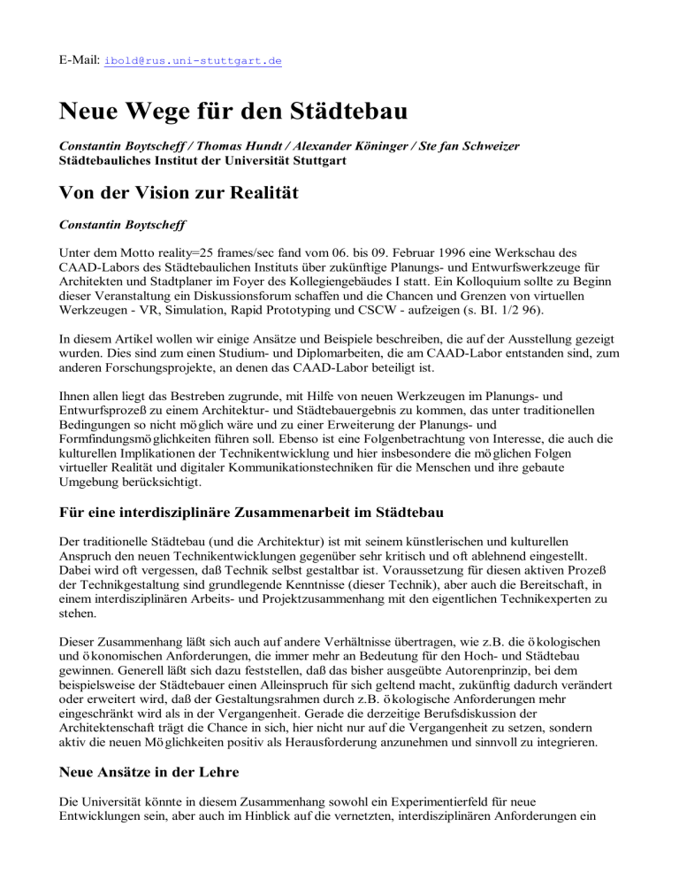 E-Mail: [email protected] Neue Wege für den Städtebau Constantin Boytscheff / Thomas Hundt / Alexander Köninger / Ste fan Schweizer Städtebauliches Institut der Universität Stuttgart Von der Vision zur Realität Constantin Boytscheff Unter dem Motto reality=25 frames/sec fand vom 06. bis 09. Februar 1996 eine Werkschau des CAAD-Labors des Städtebaulichen Instituts über zukünftige Planungs- und Entwurfswerkzeuge für Architekten und Stadtplaner im Foyer des Kollegiengebäudes I statt. Ein Kolloquium sollte zu Beginn dieser Veranstaltung ein Diskussionsforum schaffen und die Chancen und Grenzen von virtuellen Werkzeugen - VR, Simulation, Rapid Prototyping und CSCW - aufzeigen (s. BI. 1/2 96). In diesem Artikel wollen wir einige Ansätze und Beispiele beschreiben, die auf der Ausstellung gezeigt wurden. Dies sind zum einen Studium- und Diplomarbeiten, die am CAAD-Labor entstanden sind, zum anderen Forschungsprojekte, an denen das CAAD-Labor beteiligt ist. Ihnen allen liegt das Bestreben zugrunde, mit Hilfe von neuen Werkzeugen im Planungs- und Entwurfsprozeß zu einem Architektur- und Städtebauergebnis zu kommen, das unter traditionellen Bedingungen so nicht möglich wäre und zu einer Erweiterung der Planungs- und Formfindungsmöglichkeiten führen soll. Ebenso ist eine Folgenbetrachtung von Interesse, die auch die kulturellen Implikationen der Technikentwicklung und hier insbesondere die möglichen Folgen virtueller Realität und digitaler Kommunikationstechniken für die Menschen und ihre gebaute Umgebung berücksichtigt. Für eine interdisziplinäre Zusammenarbeit im Städtebau Der traditionelle Städtebau (und die Architektur) ist mit seinem künstlerischen und kulturellen Anspruch den neuen Technikentwicklungen gegenüber sehr kritisch und oft ablehnend eingestellt. Dabei wird oft vergessen, daß Technik selbst gestaltbar ist. Voraussetzung für diesen aktiven Prozeß der Technikgestaltung sind grundlegende Kenntnisse (dieser Technik), aber auch die Bereitschaft, in einem interdisziplinären Arbeits- und Projektzusammenhang mit den eigentlichen Technikexperten zu stehen. Dieser Zusammenhang läßt sich auch auf andere Verhältnisse übertragen, wie z.B. die ökologischen und ökonomischen Anforderungen, die immer mehr an Bedeutung für den Hoch- und Städtebau gewinnen. Generell läßt sich dazu feststellen, daß das bisher ausgeübte Autorenprinzip, bei dem beispielsweise der Städtebauer einen Alleinspruch für sich geltend macht, zukünftig dadurch verändert oder erweitert wird, daß der Gestaltungsrahmen durch z.B. ökologische Anforderungen mehr eingeschränkt wird als in der Vergangenheit. Gerade die derzeitige Berufsdiskussion der Architektenschaft trägt die Chance in sich, hier nicht nur auf die Vergangenheit zu setzen, sondern aktiv die neuen Möglichkeiten positiv als Herausforderung anzunehmen und sinnvoll zu integrieren. Neue Ansätze in der Lehre Die Universität könnte in diesem Zusammenhang sowohl ein Experimentierfeld für neue Entwicklungen sein, aber auch im Hinblick auf die vernetzten, interdisziplinären Anforderungen ein berufsvorbereitendes Erfahrungsfeld für die Studenten. In der Forschung setzt sich dieses interdisziplinäre Denken immer mehr durch (siehe WUMS). Für das Studium heißt dies z.B. mit anderen Fachdisziplinen an einen Projekt zusammen zu arbeiten. Auch dazu können digitale Werkzeuge (z.B. CSCW) Unterstützung bieten. Interessant ist hier auch das Bestreben der Universität, im Multimediabereich zu neuen Lehrformen zu kommen. Hier soll auch nochmal auf unser Projekt audice mit der ETH Zürich hingewiesen werden, bei dem mit computerunterstützten Kommunikationsmitteln (CSCW, Videokonferenz in ATM-Netzen) universitätsübergreifende Lehrkooperation entwickelt und erprobt werden sollen (s. BI. 12 95). Dafür müssen die inhaltlichen und organisatorischen Voraussetzungen geschaffen werden. In der Zwischenzeit können wir in den Nischen, die unsere Universität bietet, Erfahrungen sammeln und entsprechende Formen für die Zusammenarbeit entwickeln. Dazu möchten wir in diesem Beitrag aufrufen und würden uns freuen, wenn Interessenten und Gleichgesinnte sich mit uns in Verbindung setzen. Projektbeschreibungen Im folgenden werden zunächst Ansätze aus der Lehre aufgezeigt. Beschrieben werden hier eine Diplomarbeit für ein Bauelementesystem (L.M.N.T.) und eine Studienarbeit über umweltrelevante Planungsdaten im Städtebau. Für zwei weitere Projekte werden Darstellungen gezeigt und WWW-Infos gegeben. Zu einem ist dies eine Diplomarbeit (Verteilte Realität, s. Abb. 1) und ein Preview eines Filmprojektes (Blackdome, s. Abb. 2), das am CAAD-Labor gegenwärtig bearbeitet wird. Beide Arbeiten zeigen mit unterschiedlichen Mitteln einen kritischen Blick in die Zukunft der Stadt und ihrer Bewohner. Abb. 1: Head mounted display aus Verteilte Realität, Einführung in den Weltenbau, Diplomarbeit von Ingo Zirngibl: www-info http://www.architektur.uni-stuttgart.de:1200/users/iz/WELTENBAU/weltenbau.html Abb. 2: Ansicht einer Stadt von Morgen, Preview aus dem Filmprojekt Blackdome von Andreas Illenseer, Ron Kern und Ingo Zirngibl: www-info http://www.architekur.uni-stuttgart.de:1200/jang Daran schließt sich die Beschreibung von zwei Forschungsprojekten, die ebenfalls am CAAD-Labor bearbeitet werden, an (3D-GIS für den Städtebau und Wege zu einer um-weltverträglichen Mobilität am Beispiel der Region Stuttgart - WUMS). L.M.N.T. (eLeMeNTe) Thomas Hundt Bausystem Mittelpunkt der Arbeit war die Entwicklung eines flexiblen, erweiterbaren Systems von Bauelementen zur Errichtung temporärer Flächen und Räume für unterschiedliche Nutzungsanforderungen. Das objektorientierte Bausystem besteht aus drei Primärelementen bzw. Klassen: 1. Flächenaggregat 2. Raumaggregat und 3. Hülle. Sie können durch differenzierte Ausstattung und Installation ihrer Nutzung angepaßt und mittels additiver Schnittstellen zusammengefügt werden. Dabei können sie sowohl z