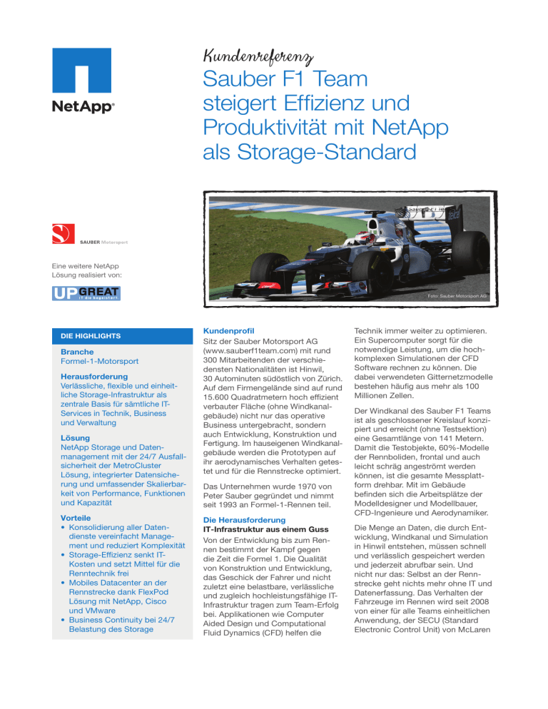 Kundenreferenz Sauber F1 Team steigert Effizienz und Produktivität mit NetApp als Storage-Standard Eine weitere NetApp Lösung realisiert von: Foto: Sauber Motorsport AG DIE Highlights Branche Formel-1-Motorsport Herausforderung Verlässliche, flexible und einheitliche Storage-Infrastruktur als zentrale Basis für sämtliche ITServices in Technik, Business und Verwaltung Lösung NetApp Storage und Datenmanagement mit der 24/7 Ausfallsicherheit der MetroCluster Lösung, integrierter Datensicherung und umfassender Skalierbarkeit von Performance, Funktionen und Kapazität Vorteile • Konsolidierung aller Datendienste vereinfacht Management und reduziert Komplexität • Storage-Effizienz senkt ITKosten und setzt Mittel für die Renntechnik frei • Mobiles Datacenter an der Rennstrecke dank FlexPod Lösung mit NetApp, Cisco und VMware • Business Continuity bei 24/7 Belastung des Storage Kundenprofil Sitz der Sauber Motorsport AG (www.sauberf1team.com) mit rund 300 Mitarbeitenden der verschiedensten Nationalitäten ist Hinwil, 30 Autominuten südöstlich von Zürich. Auf dem Firmengelände sind auf rund 15.600 Quadratmetern hoch effizient verbauter Fläche (ohne Windkanalgebäude) nicht nur das operative Business untergebracht, sondern auch Entwicklung, Konstruktion und Fertigung. Im hauseigenen Windkanalgebäude werden die Prototypen auf ihr aerodynamisches Verhalten getestet und für die Rennstrecke optimiert. Das Unternehmen wurde 1970 von Peter Sauber gegründet und nimmt seit 1993 an Formel-1-Rennen teil. Die Herausforderung IT-Infrastruktur aus einem Guss Von der Entwicklung bis zum Rennen bestimmt der Kampf gegen die Zeit die Formel 1. Die Qualität von Konstruktion und Entwicklung, das Geschick der Fahrer und nicht zuletzt eine belastbare, verlässliche und zugleich hochleistungsfähige ITInfrastruktur tragen zum Team-Erfolg bei. Applikationen wie Computer Aided Design und Computational Fluid Dynamics (CFD) helfen die Technik immer weiter zu optimieren. Ein Supercomputer sorgt für die notwendige Leistung, um die hochkomplexen Simulationen der CFD Software rechnen zu können. Die dabei verwendeten Gitternetzmodelle bestehen häufig aus mehr als 100 Millionen Zellen. Der Windkanal des Sauber F1 Teams ist als geschlossener Kreislauf konzipiert und erreicht (ohne Testsektion) eine Gesamtlänge von 141 Metern. Damit die Testobjekte, 60%-Modelle der Rennboliden, frontal und auch leicht schräg angeströmt werden können, ist die gesamte Messplattform drehbar. Mit im Gebäude befinden sich die Arbeitsplätze der Modelldesigner und Modellbauer, CFD-Ingenieure und Aerodynamiker. Die Menge an Daten, die durch Entwicklung, Windkanal und Simulation in Hinwil entstehen, müssen schnell und verlässlich gespeichert werden und jederzeit abrufbar sein. Und nicht nur das: Selbst an der Rennstrecke geht nichts mehr ohne IT und Datenerfassung. Das Verhalten der Fahrzeuge im Rennen wird seit 2008 von einer für alle Teams einheitlichen Anwendung, der SECU (Standard Electronic Control Unit) von McLaren „Ohne NetApp und nur mit herkömmlicher Technologie liesse sich ein derartiges Datacenter kaum realisieren, und wenn, wäre der Ressourcenaufwand mit Sicherheit höher.“ Magnus Frey Head of IT, Sauber Motorsport AG Electronics Systems, erfasst und per Funk teils nahezu in Echtzeit ausgelesen und in das zentrale Datacenter der Teams übertragen. Bereits im Jahr 2007 hatte sich die Sauber Motorsport AG für StorageLösungen von NetApp entschieden. Der Wunsch nach einer konsolidierten IT-Infrastruktur, die sich mühelos stetig steigenden Anforderungen anpasst, liess sich mit der Unified-Architektur am besten umsetzen. Das Datenwachstum liegt bei nur zirka 15% jährlich, da der Datenbestand schnell veraltet und wieder gelöscht wird. Pendant im Hauptgebäude einen ausfallsicheren Storage Cluster mit automatischem Failover bildet und aktuell rund 200 Terabyte Daten vorhält. NetApp MetroCluster Software sorgt dafür, dass die beiden Systeme auch kilometerweit voneinander getrennt stehen können und die Datenkommunikation dennoch reibungslos funktioniert. Die Sauber Motorsport AG wollte buchstäblich alle IT-Services nur noch über eine einzige Plattform bereitstellen, die zahlreichen Einzellösungen ablösen und so die Effizienz der IT erhöhen. Der Empfehlung des damaligen Team-Eigentümers BMW, sich doch auch NetApp Lösungen anzusehen, hat sich als wegweisend erwiesen. Auf diesem Cluster sind mittlerweile sämtliche Applikationsdaten – CATIA, Windows Fileservices, Microsoft Exchange, Datenbanken und auch die SAP Landschaft – konsolidiert abgelegt. Die Server wurden mit VMware Lösungen virtualisiert und sind mittels VMware vMotion in das Hochverfügbarkeitskonzept eingebunden. Das Storage-Design wurde so ausgelegt, dass die Daten über kreuz gesichert werden – zum einen mit der NetApp Snapshot Technologie für den FileBestand und zum anderen mit NetApp SnapManager für Applikationen wie Microsoft SQL Server, Oracle und SAP. Die Lösung NetApp Storage als Standard Effizienz hat beim Sauber F1 Team Priorität. Kurze Wege gewährleisten optimale Arbeitsabläufe. So verbindet eine geschlossene Brücke den Windkanal mit dem Bereich, in dem das Konstruktionsbüro und die IT untergebracht sind. Als zentraler Storage mit 460 Terabyte Bruttokapazität ist ein NetApp FAS3240 System implementiert, das zusammen mit seinem „Am MetroCluster hängt im Prinzip die ganze Firma. Würde er stehen, wäre es in Hinwil plötzlich ziemlich still“, stellt Magnus Frey, Head of IT, Sauber Motorsport AG, fest. Die 24/7 Hochverfügbarkeit des Systems ist vor allem während der Saison ein absolutes Muss: Dann ist auch der Windkanal fast rund um die Uhr in Betrieb, so dass die erzeugten Daten permanent verarbeitet und gespeichert werden müssen. Die Umgebung hat rund 250 Nutzer. An knapp einem Drittel der Arbeitsplätzen wird mit CATIA gearbeitet und häufig mit zwei Rechnern gleichzeitig, wenn etwa auf einem System ei