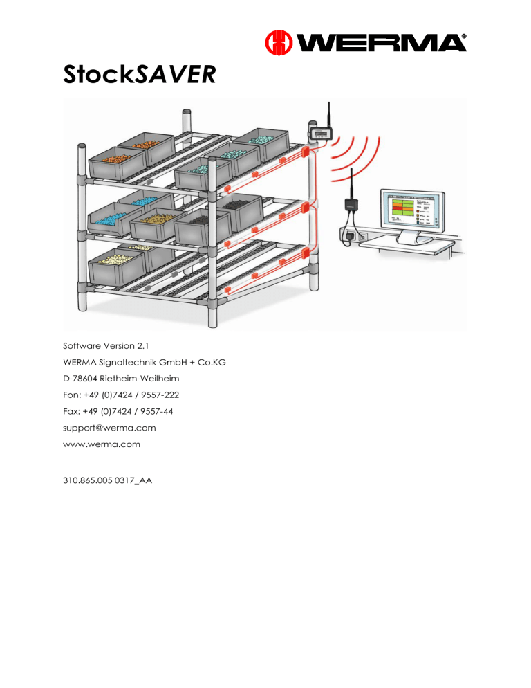 StockSAVER Software Version 2.1 WERMA Signaltechnik GmbH + Co.KG D-78604 Rietheim-Weilheim Fon: +49 (0)7424 / 9557-222 Fax: +49 (0)7424 / 9557-44 [email protected] www.werma.com 310.865.005 0317_AA Inhaltsverzeichnis Inhaltsverzeichnis 1 Über dieses Dokument ..................................................................................................................... 5 1.1 Zielgruppen ........................................................................................................................................ 5 2 Sicherheitshinweise ........................................................................................................................... 6 2.1 Bestimmungsmäßiger Gebrauch ................................................................................................... 6 2.2 Allgemeine Sicherheitshinweise ..................................................................................................... 6 3 Produktbeschreibung ....................................................................................................................... 7 3.1 Übersicht der Hardwarekomponenten ........................................................................................ 8 3.2 SensorBox ............................................................................................................................................ 9 3.3 Übersicht: SmartBox ........................................................................................................................ 10 3.3.1 SmartBox Bedienelemente ...................................................................................................... 10 3.3.2 SmartBox Displaymeldungen .................................................................................................. 10 3.3.3 SmartBox Anschlüsse ................................................................................................................. 11 3.4 Übersicht: Transceiver .................................................................................................................... 12 3.5 Barcode Scanner (optional) ......................................................................................................... 13 3.6 Übersicht der Softwaremodule .................................................................................................... 14 4 Getting Started: Übersicht der Installation und Inbetriebnahme .......................................... 15 5 Hardware am Regal montieren ................................................................................................... 16 5.1 Vor der Montage ............................................................................................................................ 16 5.1.1 5.2 5.2.1 5.3 Geräte und Komponenten auspacken ................................................................................ 16 Hardware installieren...................................................................................................................... 17 Sensoren montieren .................................................................................................................. 17 SensorBox montieren ...................................................................................................................... 18 5.3.1 SensorBox verkabeln ................................................................................................................. 18 5.3.2 Bus verkabeln ............................................................................................................................. 19 5.4 SmartBox montieren ....................................................................................................................... 20 5.5 Transceiver montieren .................................................................................................................... 21 5.6 Funktionstest ..................................................................................................................................... 22 5.7 Software installieren ........................................................................................................................ 23 5.7.1 Systemanforderungen .............................................................................................................. 23 5.7.2 Netzwerkstabilität und –sicherheit .......................................................................................... 25 5.7.3 Übersicht: Systemarchitektur ................................................................................................... 25 5.7.4 Werma StockSAVER installieren .............................................................................................. 27 5.7.5 Erweiterte Server Installation .................................................................................................... 29 5.7.6 Client auf weitere PCs installieren .......................................................................................... 30 5.8 Inbetriebnahme der Hardware .................................................................................................... 31 5.8.1 Regal verkabeln......................................................................................................................... 31 5.8.2 Transceiver anschließen und konfigurieren .......................................................................... 31 5.8.3 SmartBox anschließen und konfigurieren.............................................................................. 33 5.8.4 SmartBox und Transceiver am Regal anschließen .............................................................. 36 StockSAVER Handbuch - Software Version 2.1 2 Inhaltsverzeichnis 5.8.5 Regale konfigurieren ................................................................................................................. 37 5.8.6 Busverkabelung vornehmen ..........................................................