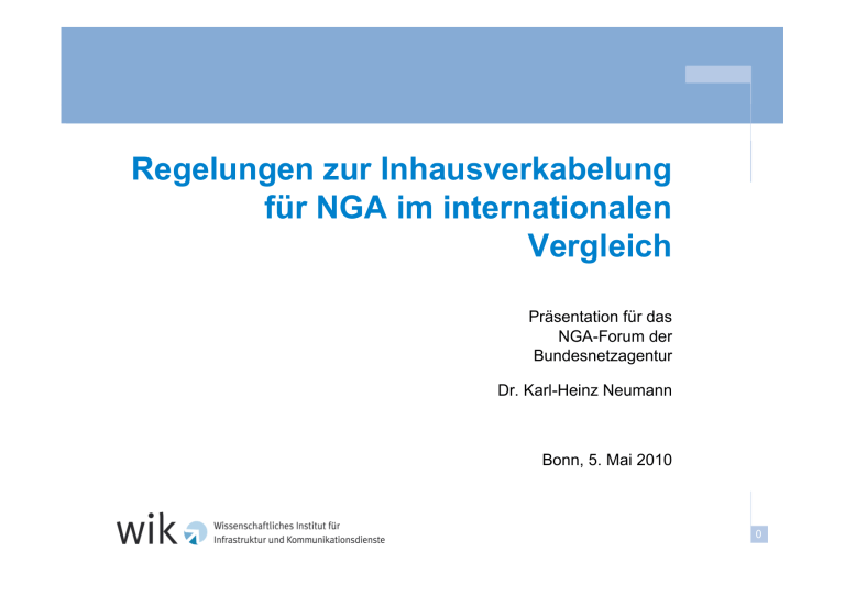 Regelungen zur Inhausverkabelung für NGA im internationalen Vergleich Präsentation für das NGA-Forum der Bundesnetzagentur Dr. Karl-Heinz Neumann Bonn, 5. Mai 2010 0 Gliederung 1. Hausverkabelung – Gesetzliche/regulatorische Handlungsbereiche 2. Länderbeispiele 3. Hausverkabelung – Neue Instrumente 1 1. Hausverkabelung – Gesetzliche/ regulatorische Handlungsbereiche • Modernisierung der Inhausverkabelung - Vorsehen von standardisierten Leerrohrsystemen ggf. Bauvorschriften - Kabelstandards (DIN/DKE) • Rechteverteilung Mieter/Hauseigentümer beim Zugang zu Netzbetreibern ggf. Mietrecht • Zugang von Netzbetreibern zum Haus • Zugang von Netzbetreibern zu bestehender Inhausverkabelung • Zugang von Netzbetreibern zu neu verlegter Inhausverkabelung 2 2. Länderbeispiele • Frankreich • Korea • Kroatien • Norwegen • Portugal • Schweiz • Spanien 3 2. Länderbeispiele Frankreich (1) • Gesetzgebung zur Regelung von Zugangsfragen für Inhausverkabelung (Juni 2009) - Verpflichtung zum Sharing von Inhausverkabelung (für Glasfaser) - Zugang an einen Konzentrationspunkt außerhalb des Gebäudes; Ausnahmeentscheidung durch NRB möglich - Zugangsverpflichtung symmetrisch für alle Netzbetreiber • Spezifikation der symmetrischen Verpflichtung durch ARCEP (Dezember 2009) auf telekommunikationsrechtlicher Basis - Verpflichtung bezieht sich auf Gebiete mit hoher Anschlussdichte (148 Städte mit 5,5 Mio. Haushalten) - Bei Gebäuden mit weniger als 12 Wohnungen muss der Zugangspunkt außerhalb des Gebäudes liegen 4 2. Länderbeispiele Frankreich (2) - Auf Nachfrage muss der ausbauende Netzbetreiber eine weitere Glasfaser in jede Wohnung des versorgten Gebäudes legen (Multifibre-Ansatz) - Ausbauabsicht und vorgesehene Zugangspunkte müssen vorab veröffentlicht werden - Zugangstarife müssen diskriminierungsfrei und kostenorientiert sein - Gegenwärtig Verhandlungen über Kooperationsverträge zur Inhausverkabelung - ARECP hat Hinweise für Hauseigentümer herausgegeben, um sie über Rechte und Verpflichtungen sowie Vorteile der Glasfaser zu informieren • Für weniger dicht besiedelte Gebiete soll bis Ende 2010 eine Lösung entwickelt werden (wahrscheinlich Unbundling) 5 2. Länderbeispiele Korea (1) Bereits 1999 wurde ein “Building Certification System” implementiert Quelle: Ministry of Information & Communication, 2003 6 2. Länderbeispiele Korea (2) • Elemente des Building Certification Systems - Zertifizierung von Häusern und Apartments mit Blick auf Ausstattung mit Internetanschluss - Das Zertifizierungssystem ist ein de-facto Standard geworden - Das System incentiviert Hauseigentümer/Wohnungsbaugesellschaften moderne Inhausverkabelung zu installieren 7 2. Länderbeispiele Kroatien • Verordnung über Inhausverkabelung (Dez. 2009) - Technische Bedingungen für Design, Errichtung, Upgrade, Nutzung und Wartung - Hauseigentümer muss frei zwischen Netzbetreibern wählen können - Netzbetreiber erhalten Zugang zum Gebäude zu gleichen und nicht-diskriminierenden Bedingungen - Gebäudeinstallationen müssen Breitbandzugang ermöglichen 8 2. Länderbeispiele Norwegen • Regulatorische Verpflichtung für SMP-Betreiber "nur" bezogen auf Inhausverkabelung in Kupfer • Gesetzgebung, die Betreibern den Zugang zu Inhausverkabelung von Privaten (Wohnungsbaugesellschaften, Industrieparks usw.) sichert, unabhängig von der Access-Technologie 9 2. Länderbeispiele Portugal • Gesetzliche Lösung (Mai 2009), die verhindert, dass GlasfaserRoll-out eines Erstinvestors zur Monopolisierung des Hauszugangs führt • Vorgaben zum Sharing oder zum Upgrade neuer Inhausverkabelung • Erster Netzbetreiber, der ein Gebäude erreicht, muss mindestens zwei Glasfasern pro Wohnung verlegen und ODF mit anderen teilen • Ein zweiter Netzbetreiber muss 50% der Kosten der Inhausverkabelung und der gemeinsam genutzten Einrichtungen tragen. Ein Dritter 33% usw. 10 2. Länderbeispiele Schweiz • "Runder Tisch" der Regulierungsbehörde BAKOM; Ein Thema: Inhausverkabelung - Technische Empfehlung der Arbeitsgruppe beschreibt Architektur, Nomenklatur und Standard des Glasfaserkabels - Ausbauender Netzbetreiber verlegt vier Fasern pro Wohnung - Noch unklar, wer Kosten der Verlegung trägt (Eigentümer oder Netzbetreiber) 11 2. Länderbeispiele Spanien • Regelungen der CMT vom Februar 2009 zur Inhausverkabelung - Symmetrische Verpflichtung für alle Netzbetreiber - Wettbewerbern muss Zugang zur Inhausglasfaserverkabelung gewährt werden - Erstinvestor hat die Rolle eines Netzmanagers der installierten Verkabelung - Verpflichtungen beziehen sich nur auf Glasfasernetze - Verpflichtung bezieht sich nur auf Gebäude ohne Common Telecommunications Infrastructure (vor 1998 errichtet) • Sharing point ergibt sich aus dem Standort des OLT des Erstinvestors: Gebäude oder in einem Schacht auf öffentlichem Grund 12 3. Hausverkabelung – Neue Instrumente • Gesetzliche Auflagen für Hausbesitzer bzgl. - IT-Pass - Leerrohrsystemen - Duldung von Ausbauarbeiten durch Netzbetreiber - Rechte von Mietern zur freien Betreiberwahl • Symmetrische Regulierungsauflagen für Betreiber bzgl. Zugang zur Inhausverkabelung • Multi-fibre-Ansatz für Inhausverkabelung 13 WIK Wissenschaftliches Institut für Infrastruktur und Kommunikationsdienste GmbH Dr. Karl-Heinz Neumann Postfach 2000 53588 Bad Honnef Deutschland Tel.: +49 (0) 2224-9225-10 Fax: +49 (0) 2224-9225-68 eMail: [email protected] www. wik. org