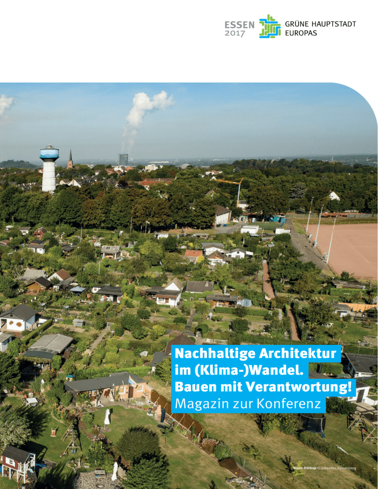 Nachhaltige Architektur im (Klima-)Wandel. Bauen mit Verantwortung! Magazin zur Konferenz Essen-Frintrop © Johannes Kassenberg Dieses Magazin begleitet die Konferenz „Nachhaltige Architektur im (Klima-)Wandel. Bauen mit Verantwortung! Grüne Hauptstadt Europas – Essen 2017: Nachhaltige Architektur im (Klima-)Wandel. Bauen mit Verantwortung! 3 Herausgeber STADT ESSEN Projektbüro „Grüne Hauptstadt Europas – Essen 2017“ Brunnenstraße 8 · 45128 Essen Telefon: 0201 88-82301 E-Mail: [email protected] www.essengreen.capital Ansprechpartner Sebastian Schlecht, Architekt AKNW Projektmanagement Grüne Hauptstadt Europas – Essen 2017 E-Mail: [email protected] Konzept, fachliche Begleitung sbca Aufbau Haus Prinzenstraße 84.2 10969 Berlin Telefon: 0 30 / 69 53 70 80 Telefax: 0 30 / 69 53 70 8-20 E-Mail: [email protected] Grafik und Gestaltung BÜROHALLO, Alexander Lech, Dessau-Roßlau www.buerohallo.de Druck Druckerei Wieprich, Dessau Projektpartner Architektenkammer Nordrhein-Westfalen Bauindustrieverband Nordrhein-Westfalen Drees & Sommer HOCHTIEF AG Ingenieurkammer-Bau Nordrhein-Westfalen Kölbl Kruse GmbH Ministerium für Bauen, Wohnen, Stadtentwicklung und Verkehr des Landes Nordrhein-Westfalen Ministerium für Klimaschutz, Umwelt, Landwirtschaft, Natur- und Verbraucherschutz des Landes Nordrhein-Westfalen thyssenkrupp AG Die Konferenz „Nachhaltige Architektur im (Klima-)Wandel. Bauen mit Verantwortung!“ wird im Rahmen des Projekts „Grüne Hauptstadt Europas – Essen 2017“ vom Bundesministerium für Umwelt, Naturschutz, Bau und Reaktorsicherheit gefördert. Universitätsviertel der Stadt Essen © Rupert Oberhäuser Das Magazin zur Konferenz Nachhaltiges und klimagerechtes Bauen ist ein gesellschaftlich relevantes Thema, das derzeit den Großteil der beteiligten Akteurinnen und Akteure ebenso beschäftigt wie Wissenschaft und Forschung – doch selten sitzen sie zusammen, um darüber zu diskutieren. Die Konferenz zur „Nachhaltigen Architektur im (Klima-) Wandel. Bauen mit Verantwortung!“ ist eine Gelegenheit, die Verantwortung in der Planung und im Bauwesen von der Verwaltung bis zur Bauwirtschaft zu thematisieren. Die Grüne Hauptstadt Europas – Essen 2017 hat für die Konferenz eine große Bandbreite an Referenten und Projektpartnern gewinnen können – ein Schritt in einen konstruktiven Dialog. Fachbeiträge, Inputs, die vier Diskussionsrunden und die Exkursionen der Konferenz nehmen das verantwortungsvolle, nachhaltige und klimagerechte Bauen in den Blick. Die Leitfrage ist, wie zukunftsfähige Gebäude entstehen, und unter welchen Voraussetzungen negative Auswirkungen auf Umwelt und Klima reduziert oder sogar umgekehrt werden können. Mit dieser programmatischen Themensetzung sowie der Partner- und Akteurskonstellation soll die Konferenz zu einem offenen Diskurs beitragen und auch unbequemere Aspekte wie die Spanne zwischen Theorie und Praxis, zwischen Positionierung und Zusammenarbeit in den Blick nehmen. So soll ein echter Know-how-Transfer entstehen, der die üblichen Fronten zwischen Stadtentwicklung und Bauwesen aufweicht und im besten Fall ein konstruktives Ergebnis erzeugt. Dieses Magazin stellt aktuelle Bauten und Vorhaben der Grünen Hauptstadt Europas – Essen 2017 ebenso vor wie die einzelnen Projektpartner und eine Auswahl ihrer konkreten Bauprojekte. Im Anschluss an die Konferenz wird das Magazin zu einer Dokumentation fortentwickelt, das die Ergebnisse dieser Tage abbildet und als Grundlage für eine weitere Zusammenarbeit dienen soll. Grüne Hauptstadt Europas – Essen 2017: Nachhaltige Architektur im (Klima-)Wandel. Bauen mit Verantwortung! 4 Grüne Hauptstadt Europas – Essen 2017: Nachhaltige Architektur im (Klima-)Wandel. Bauen mit Verantwortung! 5 Willkommen Mit dem Titel „Grüne Hauptstadt Europas“ wird die Stadt Essen durch die Europäische Kommission als eine europäische Stadt ausgezeichnet, die nachweislich hohe Umweltstandards erreicht hat und fortlaufend ehrgeizige Ziele für die weitere Verbesserung des Umweltschutzes und der nachhaltigen Entwicklung verfolgt. Erstmalig in der Geschichte der Grünen Hauptstadt Europas hat mit Essen eine Stadt der Montanindustrie den Titel gewonnen. Die erfolgreiche Transformationsgeschichte einer Kohle- und Stahlstadt zur grünsten Stadt in Nordrhein-Westfalen ist Vorbild für viele Städte Europas im Strukturwandel. Wir möchten den Titel „Grüne Hauptstadt Europas“ nutzen, um Menschen zusammenzubringen, Wissen zu teilen und voneinander zu lernen – um Essen in eine noch sozialere, klimafreundlichere und lebenswertere Stadt zu verwandeln. Mit der Konferenz „Nachhaltige Architektur im (Klima-) Wandel. Bauen mit Verantwortung!“ legt die Stadt Essen einen besonderen Schwerpunkt auf das Thema nachhaltiges und klimagerechtes Bauen. Die Konferenz soll den Diskurs über nachhaltiges und klimagerechtes Bauen der Zukunft vor allem durch die Thematisierung der Schnittstellen von Architektur und Bauwesen sowie Fragestellungen der Qualitätssicherung in einem komplexen Arbeitsfeld bereichern. Dafür werden Akteure aus Verwaltung, Bauwirtschaft und Planungspraxis an einen Tisch gebracht. Ich freue mich daher besonders über die Partner der Konferenz, die an diesen 1,5 Tagen einen konstruktiven Dialog mit allen am Planen und Bauen Beteiligten ermöglichen. Auf den folgenden Seiten stellen sich unsere Kooperationspartner mit ihren Projekten, Ideen und Arbeiten rund um das Thema nachhaltiges Bauen vor. Ich wünsche Ihnen eine erfolgreiche Konferenz mit spannenden Diskussionen! Simone Raskob Umwelt- und Baudezernentin der Stadt Essen Grüne Mitte Universitätsviertel © Johannes Kassenberg Grüne Hauptstadt Europas – Essen 2017: Nachhaltige Architektur im (Klima-)Wandel. Bauen mit Verantwortung! 6 Grüne Hauptstadt Europas – Essen 2017: Nachhaltige Architektur im (Klima-)Wandel. Bauen mit Verantwortung! © Stadt Essen »Was wir uns auf die Fahne geschrieben haben« Die Selbstverpflichtungen de