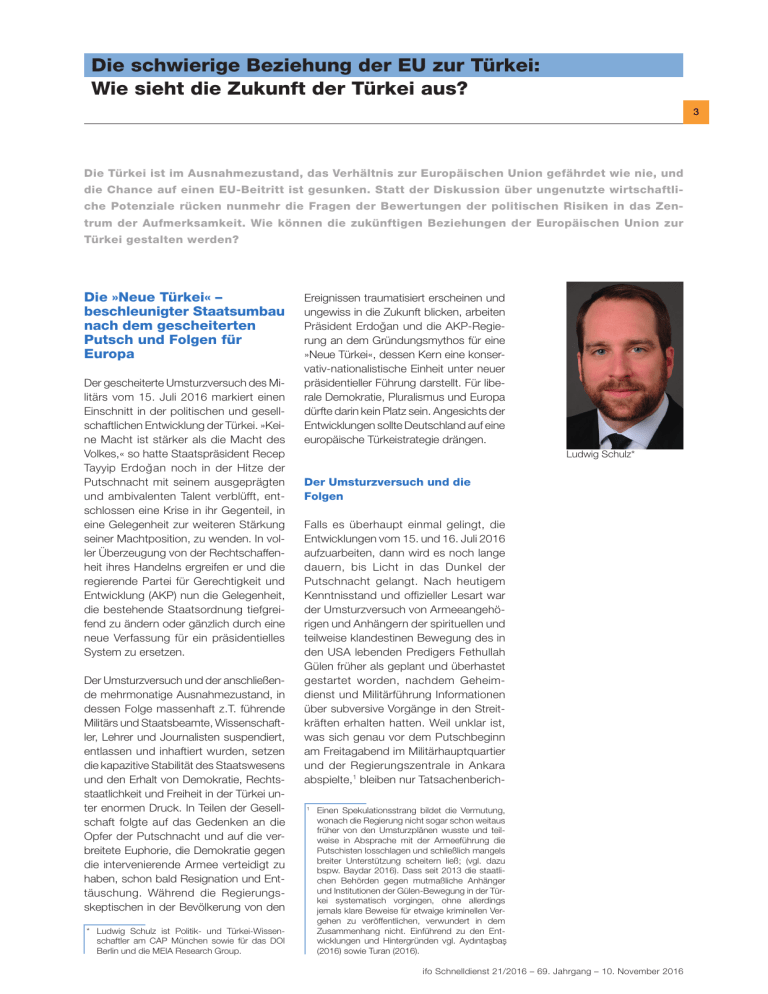 Die schwierige Beziehung der EU zur Türkei: Wie sieht die Zukunft der Türkei aus? Zur Diskussion gestellt Die Türkei ist im Ausnahmezustand, das Verhältnis zur Europäischen Union gefährdet wie nie, und die Chance auf einen EU-Beitritt ist gesunken. Statt der Diskussion über ungenutzte wirtschaftliche Potenziale rücken nunmehr die Fragen der Bewertungen der politischen Risiken in das Zentrum der Aufmerksamkeit. Wie können die zukünftigen Beziehungen der Europäischen Union zur Türkei gestalten werden? Die »Neue Türkei« – be­schleunigter Staatsumbau nach dem gescheiterten Putsch und Folgen für Europa Der gescheiterte Umsturzversuch des Mi­ litärs vom 15. Juli 2016 markiert einen Einschnitt in der politischen und gesell­ schaftlichen Entwicklung der Türkei. »Kei­ ne Macht ist stärker als die Macht des Volkes,« so hatte Staatspräsident Recep Tayyip Erdoǧan noch in der Hitze der Putschnacht mit seinem ausgeprägten und ambivalenten Talent verblüfft, ent­ schlossen eine Krise in ihr Gegenteil, in eine Gelegenheit zur weiteren Stärkung seiner Machtposition, zu wenden. In vol­ ler Überzeugung von der Rechtschaffen­ heit ihres Handelns ergreifen er und die regierende Partei für Gerechtigkeit und Entwicklung (AKP) nun die Gelegenheit, die bestehende Staatsordnung tiefgrei­ fend zu ändern oder gänzlich durch eine neue Verfassung für ein präsidentielles System zu ersetzen. Der Umsturzversuch und der anschließen­ de mehrmonatige Ausnahmezustand, in dessen Folge massenhaft z.T. führende Militärs und Staatsbeamte, Wissenschaft­ ler, Lehrer und Journalisten suspendiert, entlassen und inhaftiert wurden, setzen die kapazitive Stabilität des Staatswesens und den Erhalt von Demokratie, Rechts­ staatlichkeit und Freiheit in der Türkei un­ ter enormen Druck. In Teilen der Gesell­ schaft folgte auf das Gedenken an die Opfer der Putschnacht und auf die ver­ breitete Euphorie, die Demokratie gegen die intervenierende Armee verteidigt zu haben, schon bald Resignation und Ent­ täuschung. Während die Regierungs­ skeptischen in der Bevölkerung von den * Ludwig Schulz ist Politik- und Türkei-Wissen­ schaftler am CAP München sowie für das DOI Berlin und die MEIA Research Group. Ereignissen traumatisiert erscheinen und ungewiss in die Zukunft blicken, arbeiten Präsident Erdoǧan und die AKP-Regie­ rung an dem Gründungsmythos für eine »Neue Türkei«, dessen Kern eine konser­ vativ-nationalistische Einheit unter neuer präsidentieller Führung darstellt. Für libe­ rale Demokratie, Pluralismus und Europa dürfte darin kein Platz sein. Angesichts der Entwicklungen sollte Deutschland auf eine europäische Türkeistrategie drängen. Ludwig Schulz* Der Umsturzversuch und die Folgen Falls es überhaupt einmal gelingt, die Entwicklungen vom 15. und 16. Juli 2016 aufzuarbeiten, dann wird es noch lange dauern, bis Licht in das Dunkel der Putschnacht gelangt. Nach heutigem Kenntnisstand und offizieller Lesart war der Umsturzversuch von Armeeangehö­ rigen und Anhängern der spirituellen und teilweise klandestinen Bewegung des in den USA lebenden Predigers Fethullah Gülen früher als geplant und überhastet gestartet worden, nachdem Geheim­ dienst und Militärführung Informationen über subversive Vorgänge in den Streit­ kräften erhalten hatten. Weil unklar ist, was sich genau vor dem Putschbeginn am Freitagabend im Militärhauptquartier und der Regierungszentrale in Ankara abspielte,1 bleiben nur Tatsachenberich­ Einen Spekulationsstrang bildet die Vermutung, wonach die Regierung nicht sogar schon weitaus früher von den Umsturzplänen wusste und teil­ weise in Absprache mit der Armeeführung die Putschisten losschlagen und schließlich mangels breiter Unterstützung scheitern ließ; (vgl. dazu bspw. Baydar 2016). Dass seit 2013 die staatli­ chen Behörden gegen mutmaßliche Anhänger und Institutionen der Gülen-Bewegung in der Tür­ kei systematisch vorgingen, ohne allerdings jemals klare Beweise für etwaige kriminellen Ver­ gehen zu veröffentlichen, verwundert in dem Zusammenhang nicht. Einführend zu den Ent­ wicklungen und Hintergründen vgl. Aydıntaşbaş (2016) sowie Turan (2016). 1 ifo Schnelldienst 21/2016 – 69. Jahrgang – 10. November 2016 3 4 Zur Diskussion gestellt te zur Plausibilisierung der Abläufe: so etwa, dass mit An­ bruch der Dunkelheit Jets der Luftwaffe im Tiefflug über dem Zentrum der Hauptstadt brausten, das Parlaments­ gebäude und weitere öffentliche Gebäude beschossen wur­ den und in Istanbul Armeeeinheiten die Bosporusbrücke und den Taksim-Platz abriegelten. Putschisten hätten in der Nacht versucht, Präsident Erdoǧan, der sich mit Familie und Stab an der Ägäisküste aufgehalten hatte, zu töten, doch konnte dieser nach Istanbul entkommen. Am kaum bewachten Atatürk-Flughafen wurde er von zahlreichen An­ hängern empfangen, wo er seine zuvor schon per Video­ anruf und Fernsehen übertragende Botschaft an das Volk wiederholte, den öffentlichen Raum von den Soldaten zu­ rückzuerobern und die Demokratie zu verteidigen. »Keine Macht ist stärker als die Macht des Volkes«, erklärte er vor euphorisierten Anhängern (vgl. Arango und Yeginsuju 2016). In dieser chaotischen Nacht elektrisierte Erdoǧans Selbstinszenierung als unbeugsamer Anführer des Volkes und als demokratisch legitimierter Präsident die Massen, die zu Tausenden auf die Straßen und Plätze strömten und sich den Soldaten entgegenstellten. bei garantiert. Zudem setzte die Regierung die Europäischen Menschenrechtskonvention nach deren Art. 15 teilweise au­ ßer Kraft. Seither werfen Menschenrechtsorganisationen Staatsbediensteten immer wieder vor, Inhaftierte zu foltern, und beklagen den systematischen Bruch von Häftlingsrech­ ten (vgl. Human Right Watch 2016). Vertreter der Regie­ rungspartei weisen die Foltervorwürfe stets mit Verweis auf ihre traditionelle »Null-Toleranz-Politik« zurück und erklären, Verfehlungen juristisch 