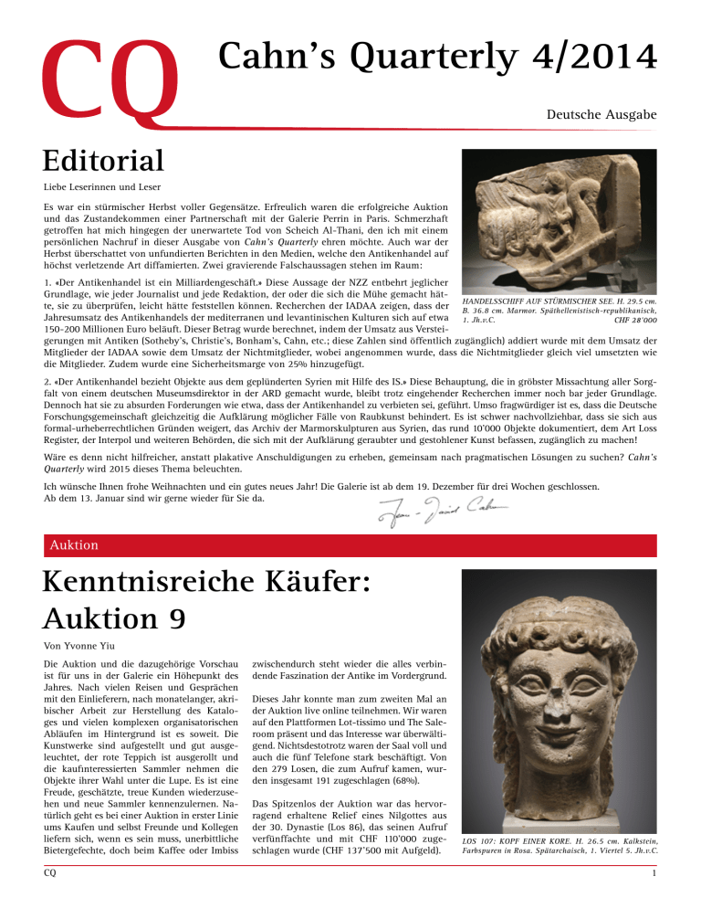 Cahn’s Quarterly 4/2014 Deutsche Ausgabe Editorial Liebe Leserinnen und Leser Es war ein stürmischer Herbst voller Gegensätze. Erfreulich waren die erfolgreiche Auktion und das Zustandekommen einer Partnerschaft mit der Galerie Perrin in Paris. Schmerzhaft getroffen hat mich hingegen der unerwartete Tod von Scheich Al-Thani, den ich mit einem persönlichen Nachruf in dieser Ausgabe von Cahn’s Quarterly ehren möchte. Auch war der Herbst überschattet von unfundierten Berichten in den Medien, welche den Antikenhandel auf höchst verletzende Art diffamierten. Zwei gravierende Falschaussagen stehen im Raum: 1. «Der Antikenhandel ist ein Milliardengeschäft.» Diese Aussage der NZZ entbehrt jeglicher Grundlage, wie jeder Journalist und jede Redaktion, der oder die sich die Mühe gemacht hätHANDELSSCHIFF AUF STÜRMISCHER SEE. H. 29.5 cm. te, sie zu überprüfen, leicht hätte feststellen können. Recherchen der IADAA zeigen, dass der B. 36.8 cm. Marmor. Späthellenistisch-republikanisch, Jahresumsatz des Antikenhandels der mediterranen und levantinischen Kulturen sich auf etwa 1. Jh.v.C. 150-200 Millionen Euro beläuft. Dieser Betrag wurde berechnet, indem der Umsatz aus Versteigerungen mit Antiken (Sotheby’s, Christie’s, Bonham’s, Cahn, etc.; diese Zahlen sind öffentlich zugänglich) addiert wurde mit dem Umsatz der Mitglieder der IADAA sowie dem Umsatz der Nichtmitglieder, wobei angenommen wurde, dass die Nichtmitglieder gleich viel umsetzten wie die Mitglieder. Zudem wurde eine Sicherheitsmarge von 25% hinzugefügt. 2. «Der Antikenhandel bezieht Objekte aus dem geplünderten Syrien mit Hilfe des IS.» Diese Behauptung, die in gröbster Missachtung aller Sorgfalt von einem deutschen Museumsdirektor in der ARD gemacht wurde, bleibt trotz eingehender Recherchen immer noch bar jeder Grundlage. Dennoch hat sie zu absurden Forderungen wie etwa, dass der Antikenhandel zu verbieten sei, geführt. Umso fragwürdiger ist es, dass die Deutsche Forschungsgemeinschaft gleichzeitig die Aufklärung möglicher Fälle von Raubkunst behindert. Es ist schwer nachvollziehbar, dass sie sich aus formal-urheberrechtlichen Gründen weigert, das Archiv der Marmorskulpturen aus Syrien, das rund 10’000 Objekte dokumentiert, dem Art Loss Register, der Interpol und weiteren Behörden, die sich mit der Aufklärung geraubter und gestohlener Kunst befassen, zugänglich zu machen! Wäre es denn nicht hilfreicher, anstatt plakative Anschuldigungen zu erheben, gemeinsam nach pragmatischen Lösungen zu suchen? Cahn’s Quarterly wird 2015 dieses Thema beleuchten. Ich wünsche Ihnen frohe Weihnachten und ein gutes neues Jahr! Die Galerie ist ab dem 19. Dezember für drei Wochen geschlossen. Ab dem 13. Januar sind wir gerne wieder für Sie da. Auktion Kenntnisreiche Käufer: Auktion 9 Von Yvonne Yiu Die Auktion und die dazugehörige Vorschau ist für uns in der Galerie ein Höhepunkt des Jahres. Nach vielen Reisen und Gesprächen mit den Einlieferern, nach monatelanger, akribischer Arbeit zur Herstellung des Kataloges und vielen komplexen organisatorischen Abläufen im Hintergrund ist es soweit. Die Kunstwerke sind aufgestellt und gut ausgeleuchtet, der rote Teppich ist ausgerollt und die kaufinteressierten Sammler nehmen die Objekte ihrer Wahl unter die Lupe. Es ist eine Freude, geschätzte, treue Kunden wiederzusehen und neue Sammler kennenzulernen. Natürlich geht es bei einer Auktion in erster Linie ums Kaufen und selbst Freunde und Kollegen liefern sich, wenn es sein muss, unerbittliche Bietergefechte, doch beim Kaffee oder Imbiss CQ zwischendurch steht wieder die alles verbindende Faszination der Antike im Vordergrund. Dieses Jahr konnte man zum zweiten Mal an der Auktion live online teilnehmen. Wir waren auf den Plattformen Lot-tissimo und The Saleroom präsent und das Interesse war überwältigend. Nichtsdestotrotz waren der Saal voll und auch die fünf Telefone stark beschäftigt. Von den 279 Losen, die zum Aufruf kamen, wurden insgesamt 191 zugeschlagen (68%). Das Spitzenlos der Auktion war das hervorragend erhaltene Relief eines Nilgottes aus der 30. Dynastie (Los 86), das seinen Aufruf verfünffachte und mit CHF 110’000 zugeschlagen wurde (CHF 137’500 mit Aufgeld). LOS 107: KOPF EINER KORE. H. 26.5 cm. Kalkstein, Farbspuren in Rosa. Spätarchaisch, 1. Viertel 5. Jh.v.C. 1 Cahn’s Quarterly 4/2014 war ein Lächeln auf seinem Gesicht nicht zu übersehen. Ich vermute deshalb, dass er sehr genau registrierte, wie er von gewissen Häusern manipuliert wurde, weil er immer dieselbe Bieternummer benutzte. Ich bedauerte dies zutiefst und erklärte ihm auch, was da vorging, doch wiederum war nur ein feines Lächeln die Antwort. Mir scheint, es könnte seine Replik auf diesen Vertrauensbruch sein, dass er 8-stellige Schulden bei diesen Häusern auftürmte und nicht beglich. Geschäftlich war er mir gegenüber, und er war ein wichtiger Kunde, immer korrekt und er war auch bereit, sich für Fehler zu entschuldigen. Nachruf Erinnerungen an Sheikh Saud bin Mohammed Al-Thani (1966-2014) Von Jean-David Cahn Die Nachricht von Sheikh Saud bin Mohammed Al-Thanis unerwartetem Tod hat mich zutiefst getroffen. Noch vor wenigen Wochen hatte ich mit ihm in London an der Frieze Masters gesprochen. Ich kenne den Sheikh seit über 15 Jahren und war von seiner schillernden Persönlichkeit beeindruckt und fasziniert. Trotz kulturell und gesellschaftlich bedingter Schranken gab es immer wieder Momente des impliziten Verstehens, wo der Mensch und nicht das Geld oder die Macht spürbar war. Ich möchte deshalb einige persönliche Erinnerungen an Sheikh Al-Thani hier festhalten und mit ihnen einen Kontrapunkt zu den reisserischen und geldversessenen Berichten in den Medien setzten. Ich bin Sheikh Al-Thani an der TEFAF Maastricht zum ersten Mal begegnet, als mein Vater noch dort ausstellte. Er kam mit grossem Gefolge und wirkte aufgrund seiner traditionellen Tracht sehr exotisch. Uns gegenüber war er freundlich, aber höflich