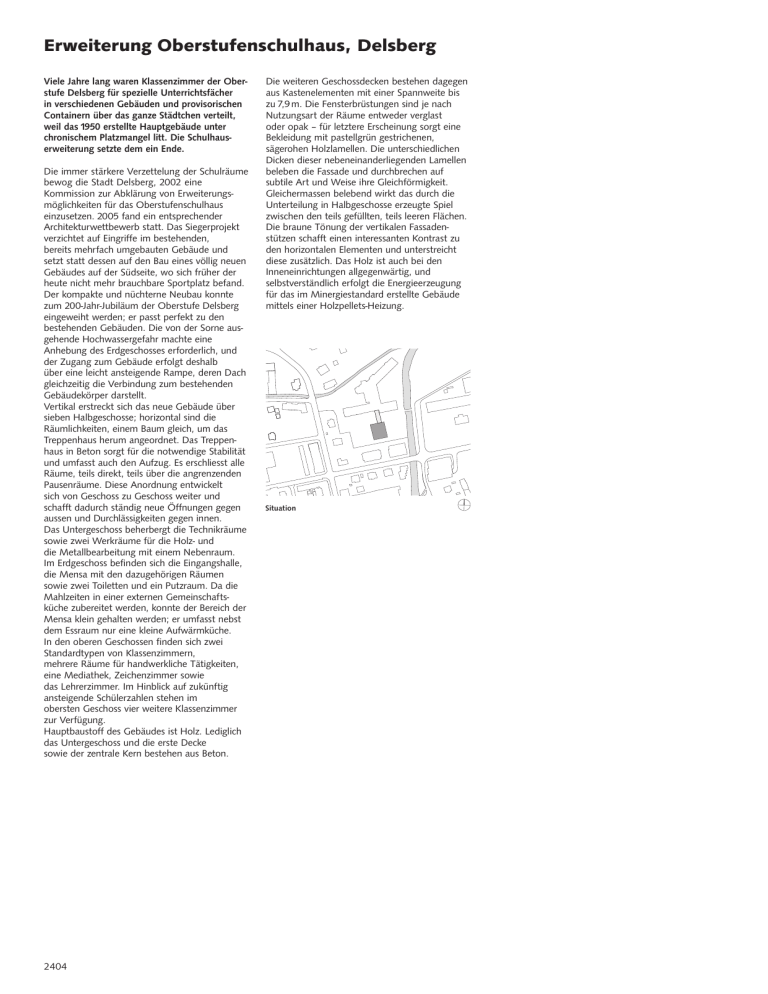 Erweiterung Oberstufenschulhaus, Delsberg Viele Jahre lang waren Klassenzimmer der Oberstufe Delsberg für spezielle Unterrichtsfächer in verschiedenen Gebäuden und provisorischen Containern über das ganze Städtchen verteilt, weil das 1950 erstellte Hauptgebäude unter chronischem Platzmangel litt. Die Schulhauserweiterung setzte dem ein Ende. Die immer stärkere Verzettelung der Schulräume bewog die Stadt Delsberg, 2002 eine Kommission zur Abklärung von Erweiterungsmöglichkeiten für das Oberstufenschulhaus einzusetzen. 2005 fand ein entsprechender Architekturwettbewerb statt. Das Siegerprojekt verzichtet auf Eingriffe im bestehenden, bereits mehrfach umgebauten Gebäude und setzt statt dessen auf den Bau eines völlig neuen Gebäudes auf der Südseite, wo sich früher der heute nicht mehr brauchbare Sportplatz befand. Der kompakte und nüchterne Neubau konnte zum 200-Jahr-Jubiläum der Oberstufe Delsberg eingeweiht werden; er passt perfekt zu den bestehenden Gebäuden. Die von der Sorne ausgehende Hochwassergefahr machte eine Anhebung des Erdgeschosses erforderlich, und der Zugang zum Gebäude erfolgt deshalb über eine leicht ansteigende Rampe, deren Dach gleichzeitig die Verbindung zum bestehenden Gebäudekörper darstellt. Vertikal erstreckt sich das neue Gebäude über sieben Halbgeschosse; horizontal sind die Räumlichkeiten, einem Baum gleich, um das Treppenhaus herum angeordnet. Das Treppenhaus in Beton sorgt für die notwendige Stabilität und umfasst auch den Aufzug. Es erschliesst alle Räume, teils direkt, teils über die angrenzenden Pausenräume. Diese Anordnung entwickelt sich von Geschoss zu Geschoss weiter und schafft dadurch ständig neue Öffnungen gegen aussen und Durchlässigkeiten gegen innen. Das Untergeschoss beherbergt die Technikräume sowie zwei Werkräume für die Holz- und die Metallbearbeitung mit einem Nebenraum. Im Erdgeschoss befinden sich die Eingangshalle, die Mensa mit den dazugehörigen Räumen sowie zwei Toiletten und ein Putzraum. Da die Mahlzeiten in einer externen Gemeinschaftsküche zubereitet werden, konnte der Bereich der Mensa klein gehalten werden; er umfasst nebst dem Essraum nur eine kleine Aufwärmküche. In den oberen Geschossen finden sich zwei Standardtypen von Klassenzimmern, mehrere Räume für handwerkliche Tätigkeiten, eine Mediathek, Zeichenzimmer sowie das Lehrerzimmer. Im Hinblick auf zukünftig ansteigende Schülerzahlen stehen im obersten Geschoss vier weitere Klassenzimmer zur Verfügung. Hauptbaustoff des Gebäudes ist Holz. Lediglich das Untergeschoss und die erste Decke sowie der zentrale Kern bestehen aus Beton. 2404 Die weiteren Geschossdecken bestehen dagegen aus Kastenelementen mit einer Spannweite bis zu 7,9 m. Die Fensterbrüstungen sind je nach Nutzungsart der Räume entweder verglast oder opak – für letztere Erscheinung sorgt eine Bekleidung mit pastellgrün gestrichenen, sägerohen Holzlamellen. Die unterschiedlichen Dicken dieser nebeneinanderliegenden Lamellen beleben die Fassade und durchbrechen auf subtile Art und Weise ihre Gleichförmigkeit. Gleichermassen belebend wirkt das durch die Unterteilung in Halbgeschosse erzeugte Spiel zwischen den teils gefüllten, teils leeren Flächen. Die braune Tönung der vertikalen Fassadenstützen schafft einen interessanten Kontrast zu den horizontalen Elementen und unterstreicht diese zusätzlich. Das Holz ist auch bei den Inneneinrichtungen allgegenwärtig, und selbstverständlich erfolgt die Energieerzeugung für das im Minergiestandard erstellte Gebäude mittels einer Holzpellets-Heizung. Situation 2405 2406 20 m Untergeschoss Erdgeschoss 1. Obergeschoss 2. Obergeschoss Ort Avenue de la Gare 9, 2800 Delsberg Bauherrschaft Service UETP Commune de Delémont Architektur GXM Architekten GmbH, Alexandra Gübeli & Yves Milani, Zürich; Mitarbeit: Virginie Reussner Bauleitung Robin Voyame Architecte, Delsberg Bauingenieur Mantegani & Wysseier AG, Biel Holzbauingenieur Indermühle Bauingenieure, Thun HLS-Ingenieur TP, AG für technische Planungen, Biel Elektroingenieur Atelier 21 Sàrl, Le Landeron Holzbau Zimmerei Kühni AG, Ramsei (Holzbau) und Guenat-Monnerat SA, Pleigne (Fenster und Fassade) Materialien Brettschichtholz 175 m3; Platten: Dreischichtplatten 27 mm 3000 m2, OSB 18 mm 750 m2, Holzfaserdämmplatten 22 mm 450 m2; Fassadenbekleidung: Schalung in Weisstanne 18 mm und 30 mm 590 m2 Baukosten (BKP 1–9) CHF 8,4 Mio. davon BKP 2 CHF 6,9 Mio. Gebäudevolumen SIA 416 8160 m3 Bauzeit Mai 2011 – Juni 2012 Fotograf Pierre Montavon, Delsberg 2407 Fassadenschnitt Aufbau Dach von oben: Extensivbegrünung Abdichtung Gefällsdämmung 80–160 mm Holzfaserdämmplatte 80 mm Dampfsperre Kastenelemente: Dreischichtplatten 27 mm Rippen 280 mm/Dämmung 30 mm/Vlies Dreischichtplatten 27 mm, perforiert Aufbau Decken von oben: Eingefärbter Kork 6 mm Zementunterlagsboden 90 mm Trennlage Trittschalldämmung 30 mm Kastenelemente: Dreischichtplatten 27 mm Rippen 360 mm/Kies/Folie/Dämmung 30 mm/Vlies Dreischichtplatten 27 mm, perforiert Aufbau Fassade von aussen: Schalung in Weisstanne 18–30 mm Lattung 55 mm Holzfaserplatte 22 mm Ständer 220 mm/Dämmung OSB 18 mm Lattung 107 mm Dreischichtplatte 2408 2409