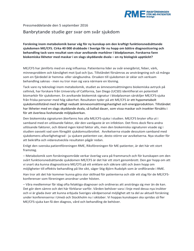 Pressmeddelande den 5 september 2016 Banbrytande studie ger svar om svår sjukdom Forskning inom metabolomik banar väg för ny kunskap om den kraftigt funktionsnedsättande sjukdomen ME/CFS. Cirka 40 000 drabbade i Sverige får nu hopp om bättre diagnosticering och behandling tack vare resultat som visar avvikande markörer i blodplasman. Forskarna fann biokemiska likheter med maskar i en slags skyddande dvala – en ny biologisk upptäckt? ME/CFS har jämförts med en evig influensa. Patienterna lider av svår energibrist, feber, värk, minnesproblem och känslighet mot ljud och ljus. Tillståndet försämras av ansträngning och så många som en fjärdedel är hemma- eller sängbundna. Orsaken till sjukdomen är oklar och verksam behandling saknas - men nu tror man sig vara närmare en lösning. Tack vare ny teknologi inom metabolomik, studiet av ämnesomsättningens biokemiska avtryck på cellnivå, har forskare från University of California, San Diego (UCSD) identifierat en potentiell biomarkör för sjukdomen. En avvikande biokemisk signatur i blodplasman särskiljer ME/CFS-sjuka från friska personer med hög säkerhet. Resultaten tyder på att ME/CFS är ett hypometabolt sjukdomstillstånd med kraftigt nedsatt ämnesomsättningshastighet och energiproduktion. Tillståndet har likheter med en slags skyddande dvala, så kallad dauer, som vissa maskar och insekter försätts i för att överleva livshotande miljöpåverkan. Den biokemiska signaturen återfanns hos alla ME/CFS-sjuka i studien. ME/CFS bryter ofta ut i samband med en utlösande faktor, där den vanligaste är en infektion. Det finns dock flera andra utlösande faktorer, och ibland ingen känd faktor alls, men den biokemiska signaturen visade sig i studien oavsett vad som föregått sjukdomsutbrottet. Avvikelserna visade dessutom samband med sjukdomens allvarlighetsgrad - ju sjukare patienten var, desto större var avvikelserna. Nya studier för att bekräfta och vidareutveckla resultaten pågår redan. Enligt den svenska patientföreningen RME, Riksföreningen för ME-patienter, är det här ett stort framsteg. – Metabolomik som forskningsområde verkar överlag vara på frammarsch och för kunskapen om den svårt funktionsnedsättande sjukdomen ME/CFS är det här ett stort genombrott. Den ger hopp om att vi snart ska kunna diagnosticera ME/CFS på ett enklare och säkrare sätt och även hopp om möjligheter till effektiv behandling på lite sikt, säger Stig-Björn Rudolph som är ordförande i RME. Han tror att det här kommer kunna göra stor skillnad för patienterna och slår ett slag för de ME/CFSkonferenser som föreningen anordnar under hösten. – Våra medlemmar får idag ofta felaktiga diagnoser och ordineras att anstränga sig mer än de kan. Det gör dem sämre och det här förklarar varför. Vården behöver vara i linje med dessa nya insikter och vi är glada över att kunna erbjuda Sveriges vårdpersonal möjlighet att ta del av aktuell forskning under konferenserna i Umeå och Stockholm nu i oktober. Vi hoppas kunskapen ska spridas så fler ME/CFS-sjuka kan få den diagnos, vård och behandling de behöver. Kontakt Stig-Björn Rudolph, Ordförande RME 073- 675 46 51, [email protected] Presskontakt Carolina Lindberg, RME 070-222 90 38, [email protected] Referenser Robert K. Naviaux et al. (2016) Metabolic features of chronic fatigue syndrome. Proc Natl Acad Sci U S A. 2016 Aug 29. pii: 201607571. DOI: 10.1073/pnas.1607571113. http://www.pnas.org/content/early/2016/08/24/1607571113.abstract https://health.ucsd.edu/news/releases/Pages/2016-08-29-chemical-signature-for-chronic-fatiguesyndrome-identified.aspx http://naviauxlab.ucsd.edu/science-item/chronic-fatigue-syndrome-research/ Studien i internationella medier http://www.huffingtonpost.com/entry/chronic-fatigue-syndrome-may-leave-a-chemical-signature-in-theblood_us_57c84eb1e4b078581f117fd5 http://thecarousel.com/health/chronic-fatigue-syndrome-breakthrough-boosts-cure-hopes/ https://inews.co.uk/essentials/news/health/chronic-fatigue-syndrome-identified-blood/ Fakta om ME/CFS ME/CFS klassas som en neurologisk sjukdom (WHO ICD-10 G93.3) och benämns av forskare på området ofta som neuroimmunologisk. Det finns uppåt 40 000 ME/CFS-sjuka i Sverige. Sjukdomen kan drabba både barn, män och kvinnor. I 75-80% av fallen börjar sjukdomen i samband med en infektion. De typiska symtomen är extrem energibrist, influensaliknande symptom och det som kallas för ansträngningsutlöst försämring (post-exertional malaise). De allra svårast sjuka är helt sängbundna och i dagsläget saknas botande behandling. År 2015 fastslog Institute of Medicine (IOM, USA) efter granskning av drygt 9000 studier att ME/CFS är en fysisk, kronisk multisystemsjukdom som ofta är svårt funktionsnedsättande. Källa: RME, www.rme.nu