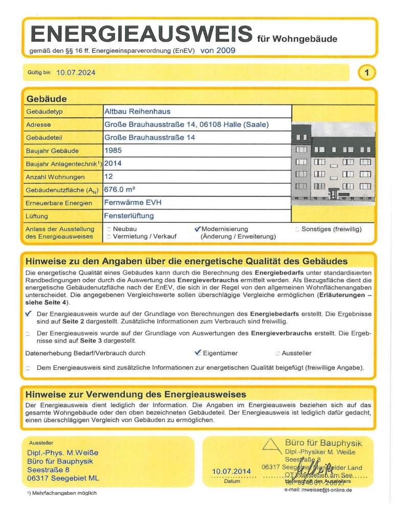 - att 3 . -AL . AVk viF ~w• ~~ yS OY ~ R~7 ~ 6M ~~ i~ ~~~~C, I S rr r Wohngebäude , i- : gemäß den §§ 16 ff. Energieeinsparverordnung (EnEV) von 2009 AMR,* AO Gultig b6 0 A- 4634e J 10.07.2024 _ _ -a ,ak : ~wM l., ~.~.. Gebäude Gebaudetyp Altbau Reihenhaus Adiesse Große Brauhausstraße 14, 06108 Halle (Saale Gebaudetell Große Brauhausstraße 14 Baujahr Gebäude 1985 Baujahr Anlagentechnik1) 2014 12 Anzahl Wahnlangen Gebaudenutzflache (AN) 676.0 m2 Erneuerbare Energien Fernwärme EVH Luftung Fensterlüftung Anlass der Ausstellung des Energieausw ei ses • Neubau • Vermietung / Verkauf tModernisierung (Änderung / Erweiterung) Sonstiges (freiwillig) Hinweise zu den Angaben über die energetische Qualität des Gebäudes Die energetische Qualität eines Gebäudes kann durch die Berechnung des Energiebeda rfs unter standardisierten Randbedingungen oder durch die Auswertung des Energieverbrauchs ermittelt werden. Als Bezugsfläche dient die energetische Gebäudenutzfläche nach der EnEV, die sich in der Regel von den allgemeinen Wohnflächenangaben unterscheidet. Die angegebenen Vergleichswerte sollen überschlägige Vergleiche ermöglichen (Erläuterungen — siehe Seite 4). ve Der Energieausweis wurde auf der Grundlage von Berechnungen des Energiebedarfs erstellt. Die Ergebnisse 0 sind auf Seite 2 dargestellt. Zusätzliche Informationen zum Verbrauch sind freiwillig. Der Energieausweis wurde auf der Grundlage von Auswertungen des Energieverbrauchs erstellt. Die Ergebnisse sind auf Seite 3 dargestellt. Datenerhebung Bedarf/Verbrauch durch ~f_ Eigentümer _ Aussteller Dem Energieausweis sind zusätzliche Informationen zur energetischen Qualität beigefügt (freiwillige Angabe). Hinweise zur Verwendung des Energieausweises Der Energieausweis dient lediglich der Information. Die Angaben im Energieausweis beziehen sich auf das gesamte Wohngebäude oder den oben bezeichneten Gebäudeteil. Der Energieausweis ist lediglich dafür gedacht, einen überschlägigen Vergleich von Gebäuden zu ermöglichen Büro für Bauphysik Aussteller Dipl.-Phys. M Weiße Büro für Bauphysik Seestraße 8 06317 Seegebiet ML i) Mehrfachangaben möglich 10.07.2014 Datum Dipl - Physikei M. Weiße Sees aß 06317 Seeg Ider Land QT teer® arrE. See é 8 4Eis-N5"lfPrs e-mail: mwaisseat-online.de r IMOMIMONONr,:e•., ~ . ~~Y.ohF,~: ?~ f ►~w. -‘144100.:- • ~_ aaRx is . ENER&EA!1JSWEIS fu, wonn9ebaude gemäß den §§ 16 ff. Energieeinsparverordnung (EnEV) 4 Adresse Gebaudeteil Große Brauhausstraße 14, 06108 Halle (Saale) Große Brauhausstraße 14 Berechneter Energiebedarf des Gebäudes 2 Energiebedarf cot- Emissionen Endenergiebedarf dieses Gebäudes 1) 19.7 kg/(m2.a 79.8 kWhl(m 2a) Effizienzklasse C 0 100 50 150 200 250 300 350 >=400 19.6 kWh/(m2a) Primärenergiebedarf dieses Gebäudes ("Gesamtenergieeffizienz") Anforderungen gemäß EnEV 2) Für Energiebedarfsberechnunden verwendetes Verfahren Primärenergiebedarf 19.6 Ist-Wert 82.1 kWh/(m 2 •a) Anforderungswert kWhi(m 2 a) If Verfahren nach DIN V 4108-6 und DIN V 4701-10 = Verfahren nach DIN V 18599 Eneresetische Qualität der Gebäudehülle H'T Ist-Wert Q 574 Wi(m 2. K) 0.630 W/(m2.K) Anforderungswert Sommerlicher Wärmeschutz (bei Neubau) Vereinfachungen nach § 9 Abs. 2 EnEV = eingehalten Endenergiebedarf Jährlicher Endenergiebedarf in kWhi(m 2 a) für Heizung Warmwasser Hilfsgeräte a) Energieträger Nah /Fernw.KWK, fossil 56.7 21.9 Strom-Mix 11- Gesamt in kWh/(m 2 .a) 78.6 1.2 1.2 r Ersatzmaßnahmen 3) Vergleichswerte Endenergiebedarf Anforderungen nach § 7 Nr. 2 EEWärmeG /MI6& 0 50 Die um 15 % verschärften Anforderungswerte sind eingehalten. Anforderungen nach § 7 Nr. 2 i. V. m. § 8 EEWärmeG ,t, ~ Primärenergiebedarf --- kWhl(m2.a). H'T Verschärfter Anforderungswert: 150 200 250 -ô .ô ~h G~J J ~ Qyi OjC ~~ Q> Ô 44/ Verschärfter Anforderungswert: Transmissionswärmeverlust çi~~ % verschärft. Die Anforderungswerte der EnEV sind um 100 300 350 111111111.1ri Z.L. .~.m~ .~, c` am Cov .~ Û v ~~~ ~S,ô . û m~ ~: ~` ,~ m ¢~~~ z400 ~ ~ ~` .-~ r c.~,` . ÿ oi ômô L~ , ~~ ,c c~ c 6, 0~ qq __- W/(m2.K). 9=i Erläuterungen zum Berechnungsverfahren Die Energieeinsparverordnung lässt für die Berechnung des Energiebedarfs zwei alternative Berechnungsverfahren zu. die im Einzelfall zu unterschiedlichen Ergebnissen führen können. Insbesondere wegen standardisierter Randbedingungen erlauben die angegebenen Werte keine Rückschlüsse auf den tatsächlichen Energieverbrauch. Die ausgewiesenen Bedarfswerte sind spezifische Werte nach der EnEV pro Quadratmeter Gebäudenutzfläche (A N ). 2)bei Neubau sowie bei Modernisierung im Fall des; 16 Abs. 1 Satz 2 EnEV l )freiwillige Angabe 4) ggf. einschließlich Kühlung nur bei Neubau im Falle der Anwendung von § 7 Nr. 2 Erneuerbare-Energien-Wärmegesetz 5 ) EFH: Einfamilienhäuser, MFH: Mehrfamilienhäuser 5) WRINIPPWIXO. M4. kHUJE :,:, : MEAUSWMS für Wohngebäude gemäß den §§ 16 ff. Energieeinsparverardnung (EnEV) -- Erfasster Energieverbrauch des Gebäudes g -Ft4011.111. .01* Adresse Gebaudeteil Große Brauhausstraße 14, 06108 Halle (Saale ) Große Brauhausstraße 14 Energieverbrauchskennwert 50 100 150 Energieverbrauch für Warmwasser: E1 200 250 enthalten 300 350 >=400 nicht enthalten D Das Gebäude wird auch gekühlt; der typische Energieverbrauch für Kühlung beträgt bei zeitgemäßen Geräten etwa 6 kWh je m 2 Gebäudenutzfläche und Jahr und ist im Energieverbrauchskennwert nicht enthalten. Verbrauchserfassung -- Heizung und Warmwasser Zeitraum Energieträger von bis Anteil Wam1 wasser [kWh] Energieverbrauch (kWh Klimafaktor Energieverbrauchskennwert in kWh/(m2.a) (zeitlich bereinigt. klimabereinigt) Heizung Warmwasser Kennwert [Durchschnitt Vergleichswerte Endenergiebedarf 0 50 100 150 200 250 300 350 ..b.1pJ .? .pm m 2400 111IP Û <Z7.h Z~ ~ ~ m ~~~ .â my = = a,i~m~c Q. ~ ~ r ~ ~~ ~ 1) Die modellhaft ermittelten Vergleichswerte beziehen sich auf Gebäude, in denen die Wärme für 