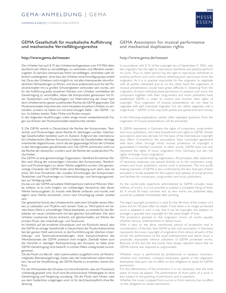2018 G E MA-AN M E LDU NG | G E MA CATERING & EVENTS | CATERING AND EVENTS GEMA Gesellschaft für musikalische Aufführung und mechanische Vervielfältigungsrechte GEMA Association for musical performance and mechanical duplication rights http://www.gema.de/messen http://www.gema.de/messen Der Urheber hat nach § 15 des Urheberrechtsgesetzes vom 9.9.1965 allein das Recht sein Werk zu vervielfältigen, zu verbreiten und öffentlich wiederzugeben. Es darf also niemand das Werk vervielfältigen, verbreiten oder öffentlich wiedergeben, ohne dass der Urheber seine Einwilligung dazu erteilt hat. Da es den Urhebern nicht möglich ist, mit allen Interessenten die erforderlichen Verhandlungen zu führen, und da es andererseits auch für die Musikveranstalter mit zu großen Schwierigkeiten verbunden sein würde, sich für die Aufführung jedes einzelnen Werkes vom Urheber unmittelbar die Genehmigung zu verschaffen, haben die Komponisten gemeinsam mit Ihren Textdichtern und Musikverlegern zur Wahrnehmung der ihnen nach dem Urheberrechts-gesetz zustehenden Rechte die GEMA gegründet. Die Musikveranstalter brauchen also nicht mit jedem einzelnen Urheber zu verhandeln, sondern sie haben nur mit einer einzigen Stelle – der GEMA – zu tun. So bleiben beiden Teilen Mühe und Kosten erspart. In den folgenden Ausführungen sollen einige immer wiederkehrende Fragen aus Kreisen der Musikveranstalter beantwortet werden: In accordance with § 15 of the copyright law of September 9, 1965, only the originator has the right to reproduce, distribute and publicly perform his work. Thus no other person has the right to reproduce, distribute or publicly perform such work without obtaining prior permission from the originator. As it is in practise impossible for the originator to negotiate with all parties interested and as on the other hand the organisers of musical presentations would have great difficulty in obtaining from the originator of every individual piece permission to present such work, the composers together with their song-writers and music publishers have established GEMA in order to control and monitor their rights of copyright. Thus organisers of musical presentations do not need to negotiate with each individual originator but can rather negotiate with a single body – GEMA. In this way both parties are spared time and money. 1. Die GEMA vertritt in Deutschland die Rechte der Komponisten, Textdichter und Musikverleger, deren Rechte ihr übertragen wurden. Gleichartige Gesellschaften bestehen auch im Ausland. Aufgrund des internationalen Urheberrechts (Berner Konvention) haben die Gesellschaften Verträge miteinander abgeschlossen, durch die der gegenseitige Schutz der Urheber in den Vertragsstaaten gewährleistet wird. Die GEMA vertritt also nicht nur die Rechte der deutschen, sondern auch die Rechte der ausländischen Musikurheber. Die GEMA ist eine gemeinnützige Organisation. Sämtliche Einnahmen fließen nach Abzug der notwendigen Unkosten den Komponisten, Textdichtern und Musikverlegern zu, deren Werke aufgeführt wurden. Der gemeinnützige Charakter der GEMA findet seine Bestätigung auch darin, dass sie einen Teil ihrer Einnahmen den sozialen Einrichtungen der Komponisten, Textdichter und Musikverleger zu Unterstützungs- und Versorgungszwekken zur Verfügung stellt. Da das von der GEMA verwaltete Weltrepertoire mehrere Millionen Werke umfasst, ist es nicht möglich, ein vollständiges Verzeichnis aller dieser Werke herauszugeben. Es müsste viele Bände umfassen und würde, weil täglich neue Werke erscheinen, schon nach Drucklegung wieder veraltet sein. Der gesetzliche Schutz des Urheberrechts steht dem Schöpfer seines Werkes zu Lebzeiten und 70 Jahre nach seinem Tode zu. Wird jedoch ein bereits freies Werk in schutzfähiger Weise bearbeitet, so entsteht für den Bearbeiter ein neues Urheberrecht mit den gleichen Schutzfristen. Der dem Urheber zuerkannte Schutz erstreckt sich gleichermaßen auf Werke der ernsten Musik, der Unterhaltungs- und Tanzmusik. Im Hinblick auf die erwähnte Schutzdauer und mit Rücksicht darauf, dass die GEMA als einzige Gesellschaft in Deutschland die Musikurheberrechte fast der ganzen Welt wahrnimmt, ist die Durchführung der üblichen Unterhaltungs- und Tanzmusikveranstaltungen ohne Inanspruchnahme des Werkbestandes der GEMA praktisch nicht möglich. Deshalb haben auch die Gerichte in ständiger Rechtsprechung den Einwand, es hätte einer GEMA-Genehmigung nicht bedurft, in solchen Fällen unbegründet zurückgewiesen. Ob die Musik von Berufs- oder Laienmusikern ausgeführt wird, ob Vereinsmitglieder, Betriebsangehörige, Gäste oder die Unternehmer selbst mitwirken, hat auf die Verpflichtung, die GEMA-Rechte zu erwerben, keinen Einfluss. Für die Wirksamkeit des Schutzes ist nicht erforderlich, dass ein Musikstück vollständig gespielt wird. Auch eine Bruchstückweise Wiedergabe ist ohne Genehmigung und Vergütung unzulässig. Ob die Musik nach Noten oder aus dem Gedächtnis vorgetragen wird, ist für die Erlaubnispflicht ohne Bedeutung. 1. GEMA represents in Germany the rights of composers, song-writers and music publishers, who have transferred such rights to GEMA. Similar associations exist also abroad. On the basis of the international copyright laws (Bern Convention) the associations have concluded agreement with each other, through which mutual protection of copyright is guaranteed in member countries. In other words, GEMA does not only represent the rights of music originators from Germany, but also the rights of foreign music originators. GEMA is a non-profit making organisation. All proceeds, after deduction of necessary expenses, are passed directly on to the composers, songwriters and music publishers, whose work is presented. The non-profit making character of GEMA is also confirmed by the fact, that part of their proceeds is mode available for the support and upkeep of social services and facilities for composers, song-writers and music publish