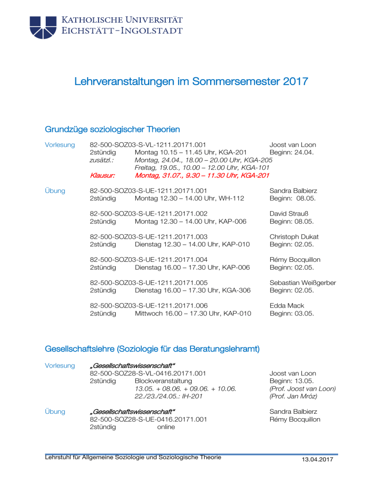 Lehrveranstaltungen im Sommersemester 2017 Grundzüge soziologischer Theorien Vorlesung 82-500-SOZ03-S-VL-1211.20171.001 Joost van Loon 2stündig Montag 10.15 – 11.45 Uhr, KGA-201 Beginn: 24.04. zusätzl.: Montag, 24.04., 18.00 – 20.00 Uhr, KGA-205 Freitag, 19.05., 10.00 – 12.00 Uhr, KGA-101 Klausur: Übung Montag, 31.07., 9.30 – 11.30 Uhr, KGA-201 82-500-SOZ03-S-UE-1211.20171.001 2stündig Montag 12.30 – 14.00 Uhr, WH-112 Sandra Balbierz Beginn: 08.05. 82-500-SOZ03-S-UE-1211.20171.002 2stündig Montag 12.30 – 14.00 Uhr, KAP-006 David Strauß Beginn: 08.05. 82-500-SOZ03-S-UE-1211.20171.003 2stündig Dienstag 12.30 – 14.00 Uhr, KAP-010 Christoph Dukat Beginn: 02.05. 82-500-SOZ03-S-UE-1211.20171.004 2stündig Dienstag 16.00 – 17.30 Uhr, KAP-006 Rémy Bocquillon Beginn: 02.05. 82-500-SOZ03-S-UE-1211.20171.005 2stündig Dienstag 16.00 – 17.30 Uhr, KGA-306 Sebastian Weißgerber Beginn: 02.05. 82-500-SOZ03-S-UE-1211.20171.006 2stündig Mittwoch 16.00 – 17.30 Uhr, KAP-010 Edda Mack Beginn: 03.05. Gesellschaftslehre (Soziologie für das Beratungslehramt) Vorlesung Übung „Gesellschaftswissenschaft“ 82-500-SOZ28-S-VL-0416.20171.001 2stündig Blockveranstaltung 13.05. + 08.06. + 09.06. + 10.06. 22./23./24.05.: IH-201 Joost van Loon Beginn: 13.05. (Prof. Joost van Loon) (Prof. Jan Mróz) „Gesellschaftswissenschaft“ Sandra Balbierz Rémy Bocquillon 82-500-SOZ28-S-UE-0416.20171.001 2stündig online Lehrstuhl für Allgemeine Soziologie und Soziologische Theorie 13.04.2017 Fortgeschrittene Soziologische Theorien Vorlesung “ANT and Beyond” 88-149-SOZ101-S-VL-0914.20171.001 2stündig Montag 14.00 – 15.30 Uhr, KAP-010 Seminar Joost van Loon Beginn: 24.04. „Sociology and Empirical Philosophy“ 88-149-SOZ101-S-SE-0914.20171.002 2stündig Dienstag 10.00 – 11.30 Uhr, KAP-010 Joost van Loon Beginn: 25.04. Wissenschaft und Ethik Seminar “Science and Applied Ethics” 82-500-3.3-S-VL/SE/UE/-1011.20171.001 2stündig Blockveranstaltung 07./08.07. + 14./15.07.: KAP-006 Marko Trajkovic Beginn: 07.07. Fortgeschrittene Prozessorientierte Soziologie / Fortgeschrittene Medienund Kultursoziologie Seminar „Process of Mediation” 88-149-SOZ103-S-SE-0914.20171.001 2stündig Dienstag 12.30 – 14.00 Uhr, KGA-303 Sandra Balbierz Beginn: 25.04. K’Universale Seminar „Ethics, Violence, Corruption and the Art of Disputation“ 00-000-KUNI1-S-SE-0811.20171.11 Marko Trajkovic 2stündig Blockveranstaltung Beginn: 28.04. 28./29.04.: KGA-104 + 05./06.05.: WH-203 Kolloquium für Doktoranden, Master- und Bachelor-Studierende S17-GGF-SOZ-30040.20171.001 82-500-SOZ29-S-KOL-0416.20171.001 1stündig Dienstag 15.00 – 15.45 Uhr, KAP-102 Joost van Loon Beginn: 25.04. Sprechstunden: • Dienstag, 14.00 – 15.00 Uhr, KAP-102 Mittwoch, 08.30 – 09.30 Uhr, KAP-102 Joost van Loon Joost van Loon • Donnerstag, 15.00 – 16.00 Uhr, KAP-101 Sandra Balbierz • Dienstag, 11.00 – 12.00 Uhr, KAP-101 Rémy Bocquillon • Dienstag, 10.00 – 11.00 Uhr, KAP-101 Christoph Dukat • Donnerstag, 14.00 – 15.00 Uhr, KAP-101 Edda Mack Lehrstuhl für Allgemeine Soziologie und Soziologische Theorie 13.04.2017