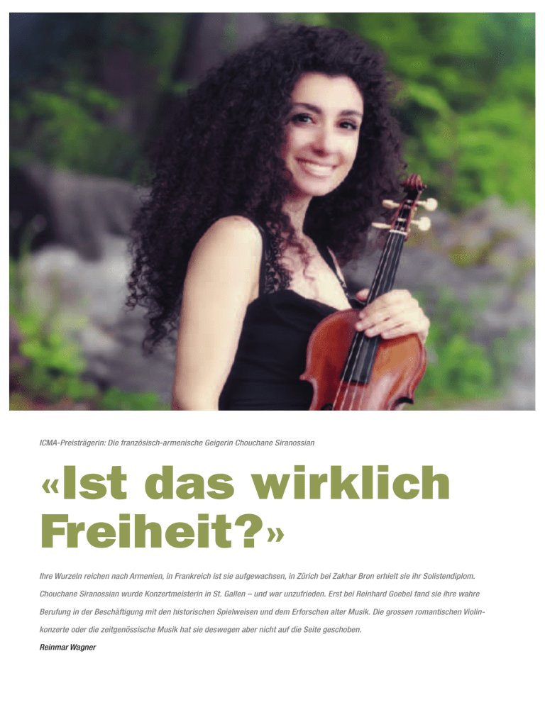 8 musik ICMA-Preisträgerin: Die französisch-armenische Geigerin Chouchane Siranossian «Ist das wirklich Freiheit?» Ihre Wurzeln reichen nach Armenien, in Frankreich ist sie aufgewachsen, in Zürich bei Zakhar Bron erhielt sie ihr Solistendiplom. Chouchane Siranossian wurde Konzertmeisterin in St. Gallen – und war unzufrieden. Erst bei Reinhard Goebel fand sie ihre wahre Berufung in der Beschäftigung mit den historischen Spielweisen und dem Erforschen alter Musik. Die grossen romantischen Violinkonzerte oder die zeitgenössische Musik hat sie deswegen aber nicht auf die Seite geschoben. Reinmar Wagner «Ich liebe die Stille auf einem Berggipfel, wenn kein Wind weht und wir sehen, wie klein wir sind» M&T: Auf Ihrer ersten CD zeigten Sie sich von zwei Seiten, als Barockgeigerin mit Musik und als Brückenbauerin zwischen den Kulturen mit zeitgenössischen Werken von französischen und libanesischen Komponisten und mit einem Lied vom mittelalterlichen armenischen Mystiker Grigor Narekatsi. Danach haben sie gleich zwei CDs aufgenommen, die unter der Affiche «Engel und Teufel» stehen, mit Musik unter anderem von Locatelli und Leclair, und mit einer davon den ICMA-Award gewonnen. Chouchane Siranossian: Die beiden wurden in ihrer Zeit so bezeichnet, Locatelli als Teufel, Leclair als Engel. Ein holländischer Kritiker, Jacob Wilhelm Lustig, hat ihr Spiel sehr genau beschrieben, und das wollte ich herausarbeiten. Es geht um «Engel und Teufel» aber natürlich spielt auch der Gegensatz «italienisch-französisch» eine grosse Rolle. M&T: Locatelli, den Virtuosen, ein Vorläufer von Paganini, haben die Geiger mittlerweile entdeckt. Leclair hingegen wird noch immer nur selten gespielt. Bilder: Tashko Tasheff musik Chouchane Siranossian: Dabei ist seine Musik eigentlich schwieriger zu spielen. Es ist eine andere Art von Virtuosität. Bei Locatelli darf es auch mal richtig krachen, das haben die Zeitgenossen auch so beschrieben. Leclair hingegen wird als kühler, eleganter, aber auch perfektionistischer geschildert. In dieser Musik darf man nicht zuviel demonstrieren wollen, sie muss immer auch ein bisschen zurückhaltend sein. Das ist Musik wie aus Porzellan. Leclair war ausgebildeter Tänzer und Tanzmeister, das spürt man in seiner Musik. Die Rhythmen der barocken Tänze sind eigentlich immer präsent, während Locatelli eine Vorliebe für lange Bögen und Messa di voce hat. Zwar ist Leclair auch vom italienischen Stil beeinflusst, er hat beim CorelliSchüler Giovanni Battista Somis in Turin studiert, aber er geht nie in die Extreme wie Locatellli. Er spiele das Langsame eher schnell, das Schnelle eher langsam, das haben die Zeitgenossen über ihn gesagt. der Alten Musik: Alle sind so neugierig, alle haben so viel gelesen und kommen doch immer wieder zu anderen Schlüssen für ihre Interpretationen. Das ist so spannend und lebendig, man hört nie auf, zu lernen. M&T: Es ist ja interessant, dass der Prozess der Suche nach dem Originalklang nicht mit den Pionieren wie Kuijken oder Harnoncourt stehen geblieben ist, sondern ständig weiter läuft. Chouchane Siranossian: Es gibt nie ein Ende. Harnoncourt hat gesagt, wir wissen vielleicht nicht, wie es wirklich geklungen hat, aber wir wissen sicher, wie es nicht geklungen hat. Goebel ist bei Bach oder auch bei Biber zum Beispiel sehr weit gekommen. Und jetzt ist unsere Generation dran, und unsere Zahl ist grösser denn je. Früher hiess es, die Musiker, die sich mit alter Musik beschäftigen, seien diejenigen, die es sonst nicht geschafft haben. Heute ist es umgekehrt, heute sind es die interessanten und offenen Leute, die sich in dieser Welt bewegen. M&T: Dass man das Virtuose bei einem Locatelli als Geiger geniesst, leuchtet ein. Fällt es Ihnen schwer, sich für Leclair zurück zu nehmen? Chouchane Siranossian: Nein, überhaupt nicht, das gehört ja zu seiner Musik, und die ist reich, voller Details und musikalisch hoch interessant. Vielleicht nicht ganz so leicht zu hören wie Locatelli, da ist natürlich viel mehr Zirkus. Aber ich mag sie beide, es ist einfach eine andere Facette von meinem Spiel. Sie haben sich gegenseitig auch stark beeinflusst. Leclair ist nach Amsterdam gereist, um mit Locatelli zu spielen, und er hat vor allem in der Harmonik von ihm gelernt, aber auch geigentechnische Elemente abgeschaut. Umgekehrt hat Locatelli die differenzierte und häufige Verwendung von Doppelgriffen von seinem französischen Kollegen übernommen. M&T: Weil man gemerkt hat, wie viel hinter den Noten steckt. Chouchane Siranossian: Man braucht eine Gebrauchsanweisung, das ist klar. Wenn man die alte Musik in der Art der modernen mit viel Vibrato und viel Bogen spielt, verliert man alles, was diese Musik reizvoll macht. Es ist eine andere Technik, eine ganz andere Sprache. Als ich bei Goebel angefangen habe, habe ich die Geige monatelang kaum berührt und nur gelesen, Manuskripte und Quellen studiert. Das war unglaublich spannend. Und dann hat Goebel gesagt: Jetzt bist du bereit. Es reicht eben nicht, Darmsaiten aufzuspannen, ein bisschen weniger Vibrato und Bogen zu nehmen. Man muss diese Sprache komplett neu lernen. M&T: Sie haben Barockvioline bei Reinhard Goebel studiert, der vor allem in der Barockmusik Deutschlands zu Hause ist. Wo haben Sie den französischen Barockstil gelernt? Chouchane Siranossian: Goebel hat sich schon auch mit französischer Barockmusik beschäftigt. Aber wir haben tatsächlich sehr viel deutsche Musik studiert, Schmelzer, Biber, Bach, Pisendel, und dann hat er gesagt: So, jetzt bist du bereit für die französische Musik, das ist das Schwierigste. Und das stimmt: Man muss alle Elemente, wie Striche, Verzierungen und Details perfekt beherrschen und ins Gleichgewicht bringen. Ich habe viele Aufnahmen gehört und alles gelesen, was ich finden konnte. Viel gelernt habe ich auch vom Flötisten Alexis Kossenko vom Ensemble «Les Ambassadeurs». Das ist das Schöne an der Szene M&T: Dennoch ist es erstaunlich, wie weit man dam
