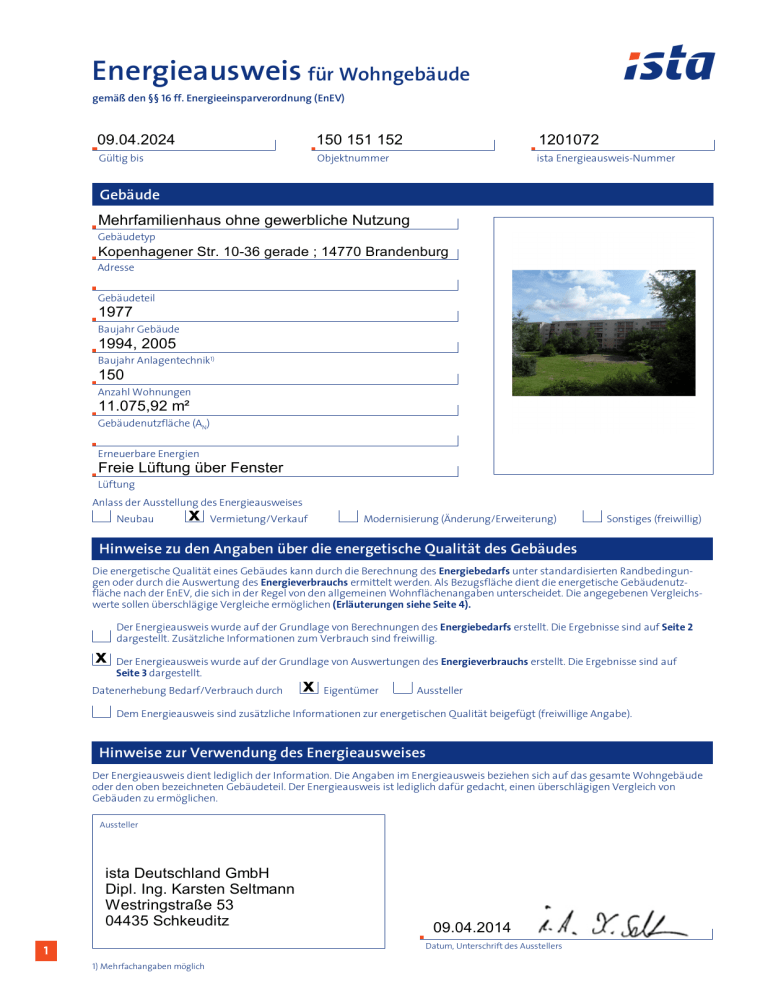 Energieausweis für Wohngebäude gemäß den §§ 16 ff. Energieeinsparverordnung (EnEV) 09.04.2024 150 151 152 1201072 Gültig bis Objektnummer ista Energieausweis-Nummer Gebäude Mehrfamilienhaus ohne gewerbliche Nutzung Gebäudetyp Kopenhagener Str. 10-36 gerade ; 14770 Brandenburg Adresse Gebäudeteil 1977 Baujahr Gebäude 1994, 2005 Baujahr Anlagentechnik1) 150 Anzahl Wohnungen 11.075,92 m² Gebäudenutzfläche (AN) Erneuerbare Energien Freie Lüftung über Fenster Lüftung Anlass der Ausstellung des Energieausweises Neubau x Vermietung/Verkauf Modernisierung (Änderung/Erweiterung) Sonstiges (freiwillig) Hinweise zu den Angaben über die energetische Qualität des Gebäudes Die energetische Qualität eines Gebäudes kann durch die Berechnung des Energiebedarfs unter standardisierten Randbedingungen oder durch die Auswertung des Energieverbrauchs ermittelt werden. Als Bezugsfläche dient die energetische Gebäudenutzfläche nach der EnEV, die sich in der Regel von den allgemeinen Wohnflächenangaben unterscheidet. Die angegebenen Vergleichswerte sollen überschlägige Vergleiche ermöglichen (Erläuterungen siehe Seite 4). Der Energieausweis wurde auf der Grundlage von Berechnungen des Energiebedarfs erstellt. Die Ergebnisse sind auf Seite 2 dargestellt. Zusätzliche Informationen zum Verbrauch sind freiwillig. x Der Energieausweis wurde auf der Grundlage von Auswertungen des Energieverbrauchs erstellt. Die Ergebnisse sind auf Seite 3 dargestellt. Datenerhebung Bedarf/Verbrauch durch x Eigentümer Aussteller Dem Energieausweis sind zusätzliche Informationen zur energetischen Qualität beigefügt (freiwillige Angabe). Hinweise zur Verwendung des Energieausweises Der Energieausweis dient lediglich der Information. Die Angaben im Energieausweis beziehen sich auf das gesamte Wohngebäude oder den oben bezeichneten Gebäudeteil. Der Energieausweis ist lediglich dafür gedacht, einen überschlägigen Vergleich von Gebäuden zu ermöglichen. Aussteller ista Deutschland GmbH Dipl. Ing. Karsten Seltmann Westringstraße 53 04435 Schkeuditz 1 09.04.2014 Datum, Unterschrift des Ausstellers 1) Mehrfachangaben möglich Energieausweis für Wohngebäude gemäß den §§ 16 ff. Energieeinsparverordnung (EnEV) Berechneter Energiebedarf des Gebäudes CO2 -Emissionen 1) 0 50 100 150 200 Anforderungen gemäß EnEV2) Primärenergiebedarf Ist-Wert kWh/(m2a) Anforderungswert 250 W/(m a) Anforderungswert Ist-Wert Sommerlicher Wärmeschutz (bei Neubau) Energiebedarf Energieträger Anforderungen nach § 7 Nr. 2 EEWärmeG > 400 Verfahren nach DIN V 4108-6 und DIN V 4701-10 kWh/(m2a) Verfahren nach DIN V 18599 Vereinfachungen nach § 9 Abs. 2 EnEV W/(m2a) eingehalten Jährlicher Endenergiebedarf in kWh/(m2a) für Heizung Warmwasser Hilfsgeräte4) Ersatzmaßnahmen3) 350 Für Energiebedarfsrechnungen verwendetes Verfahren Energetische Qualität der Gebäudehülle HT 2 300 kg/(m2a) Gesamt in kWh/(m2a) Vergleichswerte Endenergiebedarf Die um 15% verschärften Anforderungswerte 0 50 100 150 200 250 300 350 > 400 Anforderungen nach § 7 Nr. 2 i.V.m. § 8 EEWärmeG Die Anforderungswerte der EnEV sind um % verschärft. Primärenergiebedarf ss iv ha M us FH -N eu ba EF u H -N e EF ub H au gu e n t m er od get er isc ni h sie Du rt W rch oh sc M ng hn w FH e eb itt es n äu en er de tli ge ch tis c m h E od n w FH er ich es en ni t en er sie tli ge rt ch ti m sch od n er ich ni t sie rt sind eingehalten. Pa Diese Seite hat keine Relevanz für den verbrauchsorientierten Energieausweis. Energiebedarf 5) Verschärfter Anforderungswert kWh/(m2 a). Transmissionswärmeverlust HT Verschärfter Anforderungswert W/(m2K). Erläuterungen zum Berechnungsverfahren 2 Die Energieeinsparverordnung lässt für die Berechnung des Energiedbedarfs zwei alternative Berechnungsverfahren zu, die im Einzelfall zu unterschiedlicher Ergebnissen führen können. Insbesondere wegen standardisierter Randbedingungen erlauben die angegebenen Werte keine Rückschlüsse auf den tatsächlichen Energieverbrauch. Die ausgewiesenen Bedarfswerte sind spezifische Werte nach der EnEV pro Quadratmeter Gebäudenutzfläche (AN). 1) Freiwillige Angabe 2) bei Neubau sowie bei Modernisierung im Fall des § 16 Abs. 1 Satz 2 EnEV 3) nur bei Neubau im Falle der Anwendung von § 7 Nr. 2 Erneuerbare-Energien-Wärmegesetz 4) ggf. einschließlich Kühlung 5) EFH.Einfamilienhäuser, MFH: Mehrfamilienhäuser EAW-Nr. 1201072 Kopenhagener Str. 10-36 gerade ; 14770 Brandenburg Energieausweis für Wohngebäude gemäß den §§ 16 ff. Energieeinsparverordnung (EnEV) Erfasster Energieverbrauch des Gebäudes Energieverbrauchskennwert Dieses Gebäude: 108 kWh/(m²·a) 0 50 100 Energieverbrauch für Warmwasser: 150 x 200 enthalten 250 300 350 > 400 nicht enthalten Das Gebäude wird auch gekühlt; der typische Energieverbrauch für Kühlung beträgt bei zeitgemäßen Geräten etwa 6 kWh je m2 Gebäudenutzfläche und Jahr und ist im Energieverbrauchskennwert nicht enthalten. Verbrauchserfassung – Heizung und Warmwasser Zeitraum Energieträger Anteil Warmwasser [kWh] Klimafaktor Energieverbrauchskennwert in kWh/(m2·a) (zeitlich bereinigt, klimabereinigt) Heizung Warmwasser Kennwert von bis Energieverbrauch [kWh] Fern-/ Nahwärme 01.01.10 31.12.10 1.258.202 232.013 0.94 87 21 108 Fern-/ Nahwärme 01.01.11 31.12.11 1.061.495 218.086 1.17 89 20 109 Fern-/ Nahwärme 01.01.12 31.12.12 1.095.947 214.027 1.09 87 19 106 Durchschnitt 108 Vergleichswerte Endenergiebedarf 50 100 150 200 250 300 350 > 400 Pa ss iv ha M us FH -N eu ba EF u H -N eu EF ba H u gu e n t m er g od et er isch ni sie Du rt r W ch o s M hn ch ge nit w FH e es n bä t en er ud tli ge e ch tis m ch EF od n w H er ich es en ni t en er sie tli ge rt ch ti m sch od n er ich ni t sie rt 0 1) Die modellhaft ermittelten Vergleichswerte beziehen sich auf Gebäude, in denen die Wärme für Heizung und Warmwasser durch Heizkessel im Gebäude bereitgestellt wird. Soll ein Energieverbrauchskennwert verglichen werden, der keinen Warm