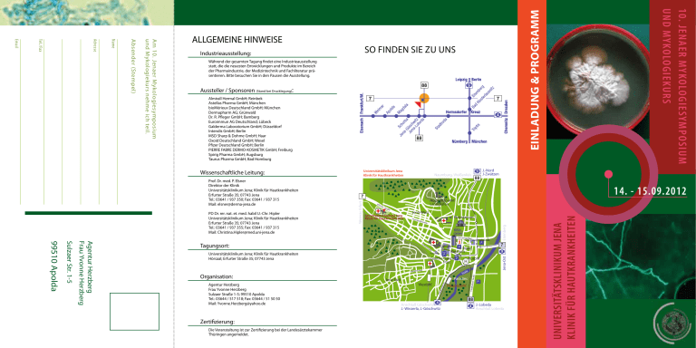 Einladung & Programm So finden Sie zu uns Während der gesamten Tagung findet eine Industrieausstellung statt, die die neuesten Entwicklungen und Produkte im Bereich der Pharmaindustrie, der Medizintechnik und Fachliteratur präsentieren. Bitte besuchen Sie in den Pausen die Ausstellung. Aussteller / Sponsoren (Stand bei Drucklegung): Almirall Hermal GmbH; Reinbek Astellas Pharma GmbH; München bioMérieux Deutschland GmbH; München Dermapharm AG; Grünwald Dr. R. Pfleger GmbH; Bamberg Euroimmun AG Deutschland; Lübeck Galderma Laboratorium GmbH; Düsseldorf Intendis GmbH; Berlin MSD Sharp & Dohme GmbH; Haar Oxoid Deutschland GmbH; Wesel Pfizer Deutschland GmbH; Berlin PIERRE FABRE DERMO-KOSMETIK GmbH; Freiburg Spirig Pharma GmbH; Augsburg Taurus Pharma GmbH; Bad Homburg Universitätsklinikum Jena Klinik für Hautkrankheiten Erfu rter Aussichtspunkt Landgrafen Stra ße Universitätsklinikum Jena Klinik für Hautkrankheiten Jena-West Hum Planetarium bold tstra ße Botan. Garten Fürstengraben th Universitätsklinikum Jena; Klinik für Hautkrankheiten Hörsaal; Erfurter Straße 35; 07743 Jena P Goethe-Galerie P Post Magdelstieg Zertifizierung: Die Veranstaltung ist zur Zertifizierung bei der Landesärztekammer Thüringen angemeldet. Westbhf. 4 Anschluß Göschwitz J.-Winzerla, J.-Göschwitz Paradiesbhf. er Straße Jena-Süd Stadtroda Agentur Herzberg Frau Yvonne Herzberg Sulzaer Straße 1-5; 99510 Apolda Tel.: 03644 / 517 518; Fax: 03644 / 51 50 50 Mail: [email protected] le Saa Paradies 88 4 7 9 Busbhf. H r. Organisation: P Campus P tra Markt ße Zentrum Volkshaus ers Kah lais che St Agentur Herzberg Frau Yvonne Herzberg Sulzaer Str. 1-5 99510 Apolda Uni-Hauptgebäude Tagungsort: Lu Eisenberg PD Dr. rer. nat. et. med. habil U.-Chr. Hipler Universitätsklinikum Jena; Klinik für Hautkrankheiten Erfurter Straße 35; 07743 Jena Tel.: 03641 / 937 355; Fax: 03641 / 937 315 Mail: [email protected] J.-Nord J-Zwätzen 9 88 14. - 15.09.2012 7 Weimar, Erfurt Prof. Dr. med. P. Elsner Direktor der Klinik Universitätsklinikum Jena; Klinik für Hautkrankheiten Erfurter Straße 35; 07743 Jena Tel.: 03641 / 937 350; Fax: 03641 / 937 315 Mail: [email protected] Naumburg, Weißenfels Jena-Ost Wissenschaftliche Leitung: P J.-Lobeda Anschluß Lobeda Universitätsklinikum Jena Klinik für Hautkrankheiten Industrieausstellung: 10. Jenaer Mykologiesymposium und Mykologiekurs Am 10. Jenaer Mykologiesymposium und Mykologiekurs nehme ich teil. Absender (Stempel) Name Adresse Tel./Fax Email ALLGEMEINE HINWEISE Traditionell findet alle 2 Jahre im September unser Jenaer Mykologie-Symposium statt, nunmehr zum 10. Mal. Auch diesmal haben wir wieder namhafte Referenten gewinnen können, die uns das Neueste aus den verschiedenen Gebieten der Dermatomykologie berichten werden. Themen sind u.a. Schimmelpilzinfektionen, Vulvovaginalcandidosen, Differentialdiagnosen von Mykosen, Pilzerkrankungen bei Kindern und ein Update praxisrelevanter mykologischer Forschungsergebnisse. Abgerundet wird das Programm durch Fallberichtsvorstellungen, die den Stellenwert moderner Diagnostika und Medikamente in der dermatologischen Infektiologie beleuchten. Der naturwissenschaftlich orientierte Vortrag über das „geheime Liebesleben der Pilze“ wird Ihnen einen ganz ungewohnten Blick auf die Pilze ermöglichen. In Ergänzung zu unserem Symposium freuen wir uns, einen Qualitätssicherungskurs mit dem Titel: „Vom Erreger zur Diagnose – praktisches Vorgehen bei der Differenzierung von Dermatomykoseerregern“ anbieten zu können. Ziel und Zweck dieses Kurses ist es, den Leistungsstandard der Dermatologen in Bezug auf die Bearbeitung mykologischer Fragestellungen darzustellen, zu sichern und zu dokumentieren. Selbstverständlich werden auch praktischen Mikroskopierübungen Teil des Kurses sein. Wir hoffen, damit Ihr Interesse wecken zu können und zugleich mit dieser zertifizierten Fortbildungstagung einen Beitrag zur Qualitätssicherung in der Mykologie zu leisten. Programm Freitag, 14.09.2012 Mykologiekurs 14.00 - 18.00 Uhr Vom Erreger zur Diagnose – praktisches Vorgehen bei der Differenzierung von Dermatomykoseerregern P. Nenoff (Mölbis) / F. Seyfarth (Jena) Samstag, 15.09.2012 Wissenschaftlicher Teil 09.00 – 09.05 Uhr 09.05 – 09.20 Uhr Ein besonderes Geschenk F. Seyfarth (Jena) / Y. Gräser (Berlin) / U.C. Hipler (Jena) 09.20 – 09.40 Uhr Epidemiologie von und diagnostische Möglichkeiten bei invasiven Schimmelpilzinfektionen am Universitätsklinikum Jena M. Baier (Jena) / W. Pfister (Jena) 09.40 – 09.55 Uhr 09.55 – 10.15 Uhr PD Dr. U.-Chr. Hipler Laborleiterin der Univ.-Hautklinik Vulvovaginalcandidosen mit Candida glabrata – eine klinische Herausforderung S. Metz (Jena) / U.C. Hipler (Jena) Mykose oder? – Kasuistische Beiträge zur Differentialdiagnostik U. Wollina (Dresden) 10.15 – 10.35 Uhr Dermatomykosen bei Kindern M. Schaller (Tübingen) 10.35 – 11.15 Uhr PAUSE 11.15 – 11.30 Uhr Fallbericht einer Infektion mit Microsporum persicolor – Hätten Sie es gewusst? C. Roediger / F. Seyfarth / Y. Gräser / U.C. Hipler (Jena) 11.30 – 11.50 Uhr Trichophyton thuringiense [H. A. Koch 1969] – ein geophiler Dermatophyt aus Mitteldeutschland P. Nenoff, I. Winter, C. Krüger, J. Herrmann, N. Rangno, J. C. Simon, Y. Gräser (Mölbis, Leipzig, Dresden) Wir freuen uns, Sie zu einem spannenden und lehrreichen Symposium in Jena begrüßen zu dürfen. Prof. Dr. P. Elsner Direktor der Univ.-Hautklinik Begrüßung U.C. Hipler (Jena) / P. Elsner (Jena) 11.50 – 12.10 Uhr Mykologie update – was ist praxisrelevant? P. Mayser (Giessen) 12.10 – 12.30 Uhr Das geheime Liebesleben der Pilze J. Wöstemeyer (Jena) ab 12.30 Uhr GEMEINSAMER IMBISS Referenten: OA Dr. med. Michael Baier Universitätsklinikum Jena Medizinische Universitätslaboratorien Institut für Medizinische Mikrobiologie Erlanger Allee 101 07743 Jena Dr. med. Christiane Roediger Universitätsklinikum Jena Klinik für Hautkrankheiten Klinik für Hautkrankheiten E