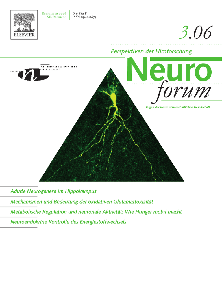 September 2006 XII. Jahrgang D 13882 F ISSN 0947-0875 3.06 Adulte Neurogenese im Hippokampus Mechanismen und Bedeutung der oxidativen Glutamattoxizität Metabolische Regulation und neuronale Aktivität: Wie Hunger mobil macht Neuroendokrine Kontrolle des Energiestoffwechsels 7 Ma rc h2 9– Ap ri l1 ,2 00 Se Ca ve ll f of nth the Gö o rA t Ge tin rm gen bs an tra Ne Mee cts uro tin sc i g en ce So c ie ty Main Speakers Symposia � Niels Birbaumer (Tübingen, Germany) Breaking the Silence: Brain-Computer-Interface Research and Paralysis � Active Sensing: How Nervous Systems Explore the External World � � � Benedikt Grothe (Munich, Germany) New Concepts in Sound Localization – Inhibition Matters � � � Uwe Heinemann (Berlin, Germany) � Mechanisms of Memory Consolidation in the Hippocampal Formation (Otto Creutzfeldt Lecture) � � � � Hans Lassmann (Vienna, Austria) Success and Failure of Translational Research: The Example of Multiple Sclerosis � � � Gilles Laurent (Pasadena, USA) � Population Dynamics and Synaptic Connectivity in Circuits for Olfactory Learning (Ernst Florey Lecture) � Olfactory Development: Common Principles and Differences across Phyla rg Recent Advances in the Use of Cell Penetrating Peptides ibu Real-Time Voltage-Sensitive Dye Imaging of Cortical Network Activities across Sensory Modalities Fre � h, � � ha � � Neuronal Dendrites: Synaptic Function, Plasticity and Information Processing kk � Microglia: Role in Neurodegeneration and Repair Molecular Aspects of Synapse Function and Dysfunction in the Mammalian Brain Ni Molecular Regulation of Wnt/beta Catenin Signaling in Antero-Posterior Axial Patterning Genetics and Molecular Mechanisms of Parkinson’s Disease Glia Development: Molecular Control of Specification, Migration, Differentiation and Myelination of Oligodendrocytes and SchwannCells ido � Generating Rhythmic Movement: From Microcircuits to Complex Motor Programs u :G � � Christoph Niehrs (Heidelberg, Germany) Functional Role of Nucleotide Signaling in the Nervous System Gene Silencing by RNA Interference in Models of De- and Regeneration ng � Do We Know What the Early Visual System Computes? Experience-Induced Plasticity in the Olfactory Pathway: From Single Neurons to Neural Odor Representation du Intrinsic Electrical Properties of Neurons: Their Role in Global Brain Function (Roger Eckert Lecture) Compositionality: Neuronal Basis of Complex Behavior Computational Models of Vision bil � Cell Intrinsic Mechanisms in the Regulation of Neural Development Ab � � Rodolfo Llinas (New York, USA) Brain Tumors Cannabinoids and the Nervous System: Different Views on Multiple Actions Chaired by Prof. Dr. Kerstin Krieglstein and Prof. Dr. Klaus-Peter Hoffmann Spatial Congnition: From Rodents to Humans Structure and Function of the Vertebrate Retina Synchronization of Circadian and Neuronal Oscillators The Cortical Nerve Impulse The Drosophila NMJ: Unravelling Principal Mechanisms of Synapse Formation, Function and Plasticity Homepage: http://www.neuro.uni-goettingen.de Local Organization /Exhibition Registration and Prof. Dr. Kerstin Krieglstein Abstract Submission Georg-August Universität The Deadline for submission of Abteilung Neuroanatomie poster abstracts and registration is Kreuzbergring 36 October 1, 2006. For abstract D-37075 Göttingen submission and registration please Phone: +49 551 39 7052 visit the meeting’s website: Fax: +49 551 39 14016 http://www.neuro.uni-goettingen.de eMail: [email protected] Neurowissenschaftliche Stipends Gesellschaft e.V. The German Neuroscience Society provides Geschäftsstelle stipends for young qualified investigators. Meino Alexandra Gibson The deadline for application is October 1, 2006. Max Delbrück Center for Please send the application including Molecular Medicine � short CV Robert Roessle Str. 10 � copy of the abstract D-13125 Berlin � list of publications Phone: +49 30 9406 3336 � letter of recommendation from a senior scientist Fax: +49 30 9406 3819 eMail: [email protected] to Neurowissenschaftliche Gesellschaft e.V. (Geschäftsstelle) cto be :O lin e ad 210 De Gestaltung: Eta Friedrich, www.et-a.de r1 ,2 00 6 http://nwg.glia.mdc-berlin.de 3/06 INHALT INHALT 175 HAUPTARTIKEL Zum Titelbild: Reife Körnerzelle. Die Neurone wurden während einer Patch-ClampAbleitung mit Biocytin gefüllt und hinterher mit FITC-konjugiertem Avidin fluoreszenzmarkiert, siehe Artikel auf S. 212. n ....... Neurowissenschaftliche Gesellschaft Vorstand der Amtsperiode 2005/2007 Präsident: Prof. Dr. Klaus-Peter Hoffmann, Bochum Josef Bischofberger und Christoph Schmidt-Hieber Adulte Neurogenese im Hippokampus 212 Jan Lewerenz und Axel Methner Mechanismen und Bedeutung der oxidativen Glutamattoxizität 222 Dieter Wicher Metabolische Regulation und neuronale Aktivität: Wie Hunger mobil macht 228 Jens C. Brüning, Eva Rother und Bengt F. Belgardt Neuroendokrine Kontrolle des Energiestoffwechsels 234 ARTIKEL DES QUARTALS Matthias Wittlinger, Rüdiger Wehner und Harald Wolf The ant odometer: stepping on stilts and stumps 240 Vizepräsident: Prof. Dr. Mathias Bähr, Göttingen Schatzmeister: Prof. Dr. Andreas Draguhn, Heidelberg Generalsekretär: Prof. Dr. Helmut Kettenmann, Berlin Sektionssprecher Computational Neuroscience: Prof. Dr. Klaus Pawelzik, Bremen Entwicklungsneurobiologie/Neurogenetik: Prof. Dr. Sigrun Korsching, Köln Klinische Neurowissenschaften: Prof. Dr. Hans-Peter Hartung, Düsseldorf Kognitive Neurowissenschaften: Prof. Dr. Niels Birbaumer, Tübingen Verhaltensneurowissenschaften (kommissarisch): Prof. Dr. Uwe Homberg, Marburg Molekulare Neurobiologie: Prof. Dr. Hans Werner Müller, Düsseldorf Neuropharmakologie und -toxikologie: Prof. Dr. Werner J. Schmidt, Tübingen Systemneurobiologie: Prof. Dr. Hermann Wagner, Aachen FORSCHUNGSFÖRDERUNG Das Kompetenznetz Demenzen – Durch vernetzte Forschung besser erkennen, behandeln, helfen 242 Graduiertenkolleg 1258 D