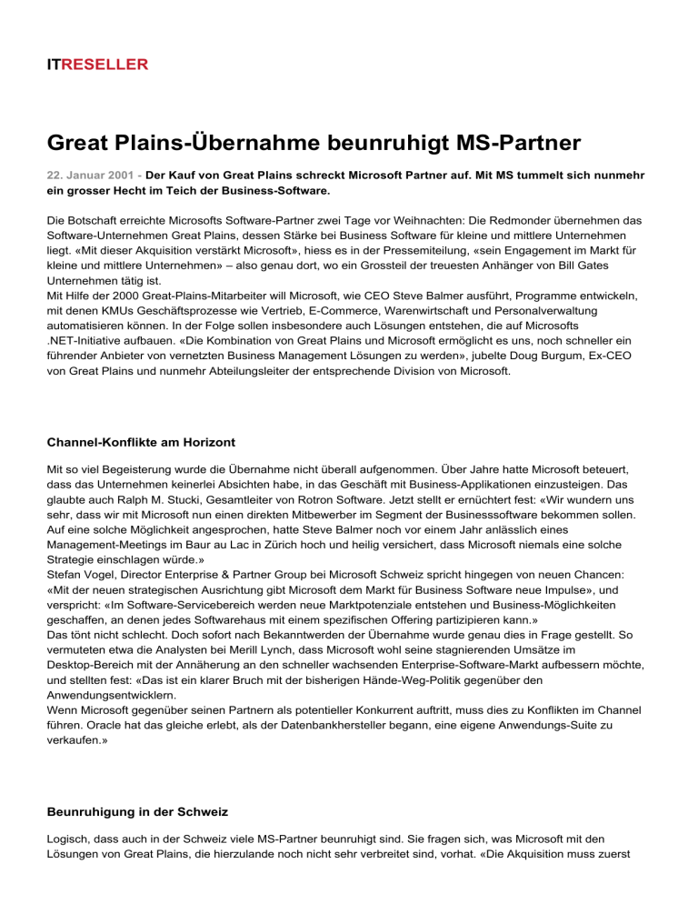 ITRESELLER Great Plains-Übernahme beunruhigt MS-Partner 22. Januar 2001 - Der Kauf von Great Plains schreckt Microsoft Partner auf. Mit MS tummelt sich nunmehr ein grosser Hecht im Teich der Business-Software. Die Botschaft erreichte Microsofts Software-Partner zwei Tage vor Weihnachten: Die Redmonder übernehmen das Software-Unternehmen Great Plains, dessen Stärke bei Business Software für kleine und mittlere Unternehmen liegt. «Mit dieser Akquisition verstärkt Microsoft», hiess es in der Pressemiteilung, «sein Engagement im Markt für kleine und mittlere Unternehmen» – also genau dort, wo ein Grossteil der treuesten Anhänger von Bill Gates Unternehmen tätig ist. Mit Hilfe der 2000 Great-Plains-Mitarbeiter will Microsoft, wie CEO Steve Balmer ausführt, Programme entwickeln, mit denen KMUs Geschäftsprozesse wie Vertrieb, E-Commerce, Warenwirtschaft und Personalverwaltung automatisieren können. In der Folge sollen insbesondere auch Lösungen entstehen, die auf Microsofts .NET-Initiative aufbauen. «Die Kombination von Great Plains und Microsoft ermöglicht es uns, noch schneller ein führender Anbieter von vernetzten Business Management Lösungen zu werden», jubelte Doug Burgum, Ex-CEO von Great Plains und nunmehr Abteilungsleiter der entsprechende Division von Microsoft. Channel-Konflikte am Horizont Mit so viel Begeisterung wurde die Übernahme nicht überall aufgenommen. Über Jahre hatte Microsoft beteuert, dass das Unternehmen keinerlei Absichten habe, in das Geschäft mit Business-Applikationen einzusteigen. Das glaubte auch Ralph M. Stucki, Gesamtleiter von Rotron Software. Jetzt stellt er ernüchtert fest: «Wir wundern uns sehr, dass wir mit Microsoft nun einen direkten Mitbewerber im Segment der Businesssoftware bekommen sollen. Auf eine solche Möglichkeit angesprochen, hatte Steve Balmer noch vor einem Jahr anlässlich eines Management-Meetings im Baur au Lac in Zürich hoch und heilig versichert, dass Microsoft niemals eine solche Strategie einschlagen würde.» Stefan Vogel, Director Enterprise & Partner Group bei Microsoft Schweiz spricht hingegen von neuen Chancen: «Mit der neuen strategischen Ausrichtung gibt Microsoft dem Markt für Business Software neue Impulse», und verspricht: «Im Software-Servicebereich werden neue Marktpotenziale entstehen und Business-Möglichkeiten geschaffen, an denen jedes Softwarehaus mit einem spezifischen Offering partizipieren kann.» Das tönt nicht schlecht. Doch sofort nach Bekanntwerden der Übernahme wurde genau dies in Frage gestellt. So vermuteten etwa die Analysten bei Merill Lynch, dass Microsoft wohl seine stagnierenden Umsätze im Desktop-Bereich mit der Annäherung an den schneller wachsenden Enterprise-Software-Markt aufbessern möchte, und stellten fest: «Das ist ein klarer Bruch mit der bisherigen Hände-Weg-Politik gegenüber den Anwendungsentwicklern. Wenn Microsoft gegenüber seinen Partnern als potentieller Konkurrent auftritt, muss dies zu Konflikten im Channel führen. Oracle hat das gleiche erlebt, als der Datenbankhersteller begann, eine eigene Anwendungs-Suite zu verkaufen.» Beunruhigung in der Schweiz Logisch, dass auch in der Schweiz viele MS-Partner beunruhigt sind. Sie fragen sich, was Microsoft mit den Lösungen von Great Plains, die hierzulande noch nicht sehr verbreitet sind, vorhat. «Die Akquisition muss zuerst genehmigt werden», wiegelt Vogel ab, «danach werden wir uns mit den hiesigen Great Plains-Verantwortlichen zusammensetzen und über die weiteren Schritte diskutieren.» «Offensichtlich ist es der Schweizer Microsoft Niederlassung auch nicht so ganz wohl bei der Sache», meint Stucki, «Wir haben bei Microsoft nachgefragt, aber nur dünne und allgemeine Antworten erhalten.» Noch vertrauen die hiesigen Entwickler auf ihre Fähigkeit, ihre Programme besser und individueller betreuen zu können als ein grosses internationales Haus wie Microsoft. Claudio Hintermann, VR-Vorsitzender von Abacus Research, führt etwa aus: «Das Problem bei der Internationalisierung von betriebswirtschaftlicher Software liegt bei den länderspezifischen Eigenheiten. Sie können je nach Land einen wesentlichen Anteil einer Software ausmachen und werden oft unterschätzt. Zudem ändern sich die Anforderungen an die Software laufend, was die Lokalisierung und Individualisierung noch weiter erschwert. Wie schwierig es sein kann, betriebswirtschaftliche Software in einem anderen Land als dem eigenen zum Laufen zu bringen, musste Microsoft letztes Jahr mit ‘Money’ erfahren. Ob da eine weltweite Markteinführung der bedeutend komplexeren Great Plains Software glücken kann, steht für mich noch in den Sternen.» Individuelle Betreuung als Rettungsanker Peter Sidler, Marketingleiter bei der St. Galler Winware, weist darauf hin, dass der Trend, die Kunden direkt an die grossen Hersteller zu binden, nicht neu sei und bei der Hardware schon länger existiere: «Auch wenn Software natürlich mehr Kundenbetreuung verlangt, so ist diese Entwicklung mittelfristig doch eine ernstzunehmende Bedrohung für die unabhängigen Softwarehäuser. Es wird von Microsoft und seinen Marketingaktivitäten abhängen, wie sich die Sache entwickelt.» Auch er setzt seine Hoffnungen darauf, dass betriebswirtschaftliche Software viele Anpassungen benötigt: «Diese speziellen Applikationen wird Microsoft nicht abdecken können. Wie gross ihr Anteil allerdings sein wird, ist heute schwer abzuschätzen. Jedenfalls wird die Entwicklung nicht so schnell gehen» In die gleiche Richtung argumentiert auch Stucki für seine Rotron Software: «Wir vertrauen in unsere Stärken und in unsere Marktpräsenz mit dem Produkt europa3000. Wir werden versuchen, in der Zwischenzeit unseren Vorsprung weiter auszubauen und mit perfekten Produkten Marktanteile hinzuzugewinnen.» Vogel von Microsoft Schweiz beteuert indes: « Wir verstehen die Bedenken von lokalen Anbietern und Entwicklern. Doch der Business Software Bereich ist ein Segment mit grosser K