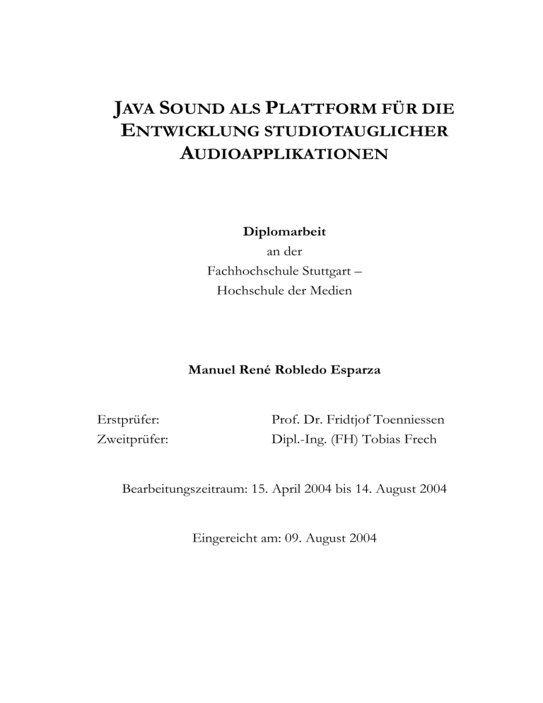 JAVA SOUND ALS PLATTFORM FÜR DIE ENTWICKLUNG STUDIOTAUGLICHER AUDIOAPPLIKATIONEN Diplomarbeit an der Fachhochschule Stuttgart – Hochschule der Medien Manuel René Robledo Esparza Erstprüfer: Zweitprüfer: Prof. Dr. Fridtjof Toenniessen Dipl.-Ing. (FH) Tobias Frech Bearbeitungszeitraum: 15. April 2004 bis 14. August 2004 Eingereicht am: 09. August 2004 Erklärung 2 Erklärung Hiermit erkläre ich, dass ich die vorliegende Diplomarbeit selbständig angefertigt habe. Es wurden nur die in der Arbeit ausdrücklich benannten Quellen und Hilfsmittel benutzt. Wörtlich oder sinngemäß übernommenes Gedankengut habe ich als solches kenntlich gemacht. Ort, Datum Unterschrift "Currently, we are enabling multimedia in the computer desktop market by adding true sound support in the Java 2 platform. In the future, we would like to see our Java Sound API technology used in professional, consumer and Internet audio applications." Michael Bundschuh, Java Media Manager, 1999 "1.5 ist die erste Version, die studiotaugliche Anwendungen ermöglicht." Florian Bömers, Java Sound Chefentwickler, 2004 Kurzfassung 4 Kurzfassung Die vorliegende Arbeit versucht, die Eignung von Java Sound als Basisplattform für die Entwicklung studiotauglicher Audioanwendungen zu evaluieren. Dafür werden die Besonderheiten der Audioprogrammierung mit Sampling- und MIDI-Daten erarbeitet und daraus Anforderungen an Audiosoftware für den Studiobereich abgeleitet. Es wird kritisch überprüft, inwieweit Java und Java Sound theoretisch geeignet sind, diese Anforderungen zu erfüllen. Gegenstand der Überprüfung ist dabei sowohl das Java Sound API als auch dessen Implementierungen. Im praktischen Teil werden zwei Sampleeditoren und einige PlugIns entwickelt, um aus der praktischen Erfahrung weitere Ergebnisse zu gewinnen. Abschließend wird eine Gesamtbewertung der Studiotauglichkeit von Java Sound vorgenommen und ein Zukunftsausblick gegeben. Schlagwörter: Java Sound, Audio, MIDI, Studio, professionell Abstract This work is intended to evaluate the suitability of the Java Sound framework for being used as a basis for the development of professional audio applications that can be used in a studio environment. The main principles of audio programming including sampling and MIDI are shown. The main requirements for audio software in studio environments will then be derived from those principles, followed by a theoretical verification of Java’s and Java Sound’s ability to fulfil those requirements. Both the Java Sound API and its implementations will be taken into account. In the practical part of this work, two sample editors and some plug-ins are developed to gather additional results from the practical experience. At the end the results are summarized in a rating about Java Sound’s suitability as a development platform for professional audio applications and an outlook into future development of Java Sound is given. Keywords: Java Sound, Audio, MIDI, Studio, professional Inhaltsverzeichnis 5 Inhaltsverzeichnis Erklärung ................................................................................................................................................... 2 Kurzfassung................................................................................................................................................ 4 Abstract ...................................................................................................................................................... 4 Inhaltsverzeichnis ...................................................................................................................................... 5 Abbildungsverzeichnis............................................................................................................................... 7 Tabellenverzeichnis ................................................................................................................................... 7 Verzeichnis der Codebeispiele .................................................................................................................. 7 Abkürzungsverzeichnis ............................................................................................................................. 8 Vorwort..................................................................................................................................................... 10 I. Einleitung ......................................................................................................................................... 11 II. Ziel und Aufbau dieser Arbeit........................................................................................................ 12 III. Audioprogrammierung ................................................................................................................... 13 1. Von analog zu digital ........................................................................................................................ 13 1.1. Analoge Audiotechnik.............................................................................................................. 13 1.2. Digitalisierung.......................................................................................................................... 14 1.2.1 1.2.2 1.2.3 1.2.4 Sampling.............................................................................................................................................. 14 Musiknoten als digitale Klangdaten (MIDI) ........................................................................................ 17 Vereinbarkeit von Sampling und MIDI ............................................................................................... 18 Digitale Audioformate ......................................................................................................................... 18 1.3. Digitale Klangverarbeitung ....................................................................