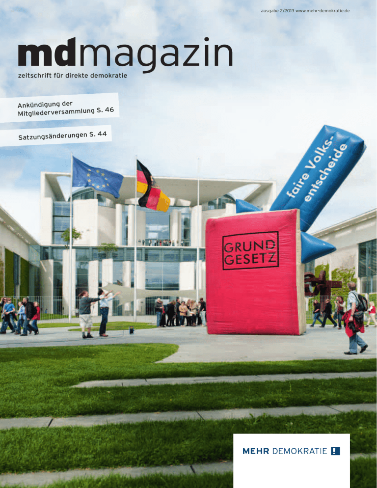 ausgabe 2/2013 www.mehr-demokratie.de zeitschrift für direkte demokratie Ankündigung der g S. 46 Mitgliederversammlun Satzungsänderungen S. 44 mdmagazin | Nr. 97 | 2/2013 INHALT Wahlrecht 4 Diese Reform reicht uns nicht! 9Leserbrief Bundestagswahlrecht Die nun beschlossene Reform ist ausreichend, aber mutlos. Bundesweiter Volksentscheid 10 Die Demokratie-Baustelle anpacken 14 Unser Team für die Wahlkreisaktionen diskussion 16 Fraktionszwang und Ochsentour Bundesländer Seite 4 22Ländertelegramm 24 Volksentscheid - bundesweit! Alles Wissenswerte über die Kampagne zur Bundestagswahl ab Seite 10 Volksbegehrensbericht 2012 erscheint! International 25 Impressionen vom Weltsozialforum 30 Begegnungen in Mitteleuropa Rezension 33 Politik als Beruf mit Transparenz OMNIBUS für Direkte Demokratie 34 Nichtwählen reicht nicht aus – Wählen auch nicht! 2. Interview mit Johannes Stüttgen md intern 36 Nachlass für eine demokratische Zukunft 37 Termine vor Ort/ Personalia 38 Viel Diskussion in Erfurt 41 Meldungen der Abstimmungsleitung 42 Wortlaut des Gesetzentwurfs 44Satzungsänderungen Titelfoto Michael von der Lohe 46 Ankündigung der Bundesmitgliederversammlung Urabstimmung über Gesetzentwurf Mit überwältigender Mehrheit angenommen: Mehr Demokratie einigt sich auf Gesetzentwurf Seite 38 und 42 2 mdmagazin | Nr. 97 | 2/2013 Editorial Liebe Leserinnen und Leser, gerade sind die Teams mit unseren beiden „Aktionselementen“ aufgebrochen. Eines sehen Sie auf der Titelseite – bestplatziert vor dem Kanzleramt!, das andere finden Sie auf Seite 37. Mehr als 80 Städte werden sie anfahren. Hinein in den Wahlkampf! Aktive tingeln in den Wahlkreisen von Veranstaltung zu Veranstaltung. Und am 17. August startet „Der aufrechte Gang“. Eine Gruppe wird von Hattingen aus die 600 Kilometer nach Berlin laufen. Ankunft zu den Koalitionsverhandlungen. Es soll unmissverständlich deutlich werden: Der bundesweite Volksentscheid gehört in den Koalitionsvertrag der neuen Regierung! Ralf-Uwe Beck Bundesvorstandssprecher Mehr Demokratie wird in diesem Jahr 25 Jahre alt. Das bedeutet auch ein Vierteljahrhundert des Gesprächs über den bundesweiten Volksentscheid. Es gehört zum Grundrauschen in unserem Verein und hört sich für mich an wie das Klappern einer Mühle. Ein schönes Geräusch. Tatsächlich klappern wir all die Vorbehalte ab, die einem Ausbau der direkten Demokratie im Wege stehen. Wir reden dabei über Menschenwürde, darüber, dass jeder Mensch als fähig anzusehen ist, Verantwortung zu übernehmen, dass wir frei sein sollten, die Bedingungen, unter die uns die Gesellschaft stellt, selbst verändern zu können. Wir zitieren die Erfahrungen mit der direkten Demokratie in anderen Ländern und mittlerweile auch die in unseren Kommunen und Bundesländern. Diese Zeitschrift hilft dabei. Sie beleuchtet die Situation in anderen Ländern, holt neue Facetten der Diskussion an die Oberfläche, sie zeigt, wie viele Menschen aus Mehr Demokratie einen quicklebendigen, nimmermüden Verein machen. Danke an all die Redakteurinnen und Redakteure, die das über die Jahre geleistet haben und leisten. Wir werden weiter reden in diesem Sommer, alle Kandidatinnen und Kandidaten einladen, mit uns ins Gespräch zu kommen – auch jenen Abgeordneten der CDU, der mir jüngst schrieb, er habe noch „kein wirklich stichhaltiges Argument gehört, Volksentscheide auch auf Bundesebene einzuführen“. Das spornt an, weiter zu reden, auch wenn die Worte schon Asche im Mund sind. Wir werden reden, nicht überreden, aber überzeugen, bis im Bundestag eine Zwei-Drittel-Mehrheit den bundesweiten Volksentscheid einführt. Sie, liebe Leserin, lieber Leser, können dabei helfen: Sprechen Sie die Kandidierenden in Ihrem Wahlkreis an – an Infoständen und bei Wahlveranstaltungen. Volksentscheid – endlich auch bundesweit! Auch in diesem Sinne wünsche ich Ihnen einen guten Sommer! Ihr Ralf-Uwe Beck Bundesvorstandsssprecher mdmagazin | Nr. 97 | 2/2013 3 wahlrecht diese reform reicht uns nicht! Das neue Bundestagswahlrecht löst die drängenden Probleme – mehr aber auch nicht, meint das langjährige Mitglied des AK Wahlrecht, Paul Tiefenbach. Text Dr. Paul Tiefenbach, Mehr Demokratie Fotos Mehr Demokratie, Henning Homann (flickR) Am 21. Februar 2013 hat der Bundestag ein neues Wahlrecht verabschiedet. Alle Parteien bis auf DIE LINKE stimmten dafür. Der Bundestag reagierte damit auf eine Entscheidung des Bundesverfassungsgerichts aus dem Vorjahr, in der das damals geltende Wahlrecht in zentralen Punkten als verfassungswidrig eingestuft wurde (siehe mdmagazin Nr. 94). Dieses 2011 beschlossene Wahlrecht war seinerseits eine Reaktion auf ein Urteil des Bundesverfassungsgerichts von 2008. Damals schon hatte das Gericht Änderungen verlangt. Diese erfolgten dann auch, lösten aber nach Auffassung der Richter/innen das Problem nur teilweise. Das Gericht bemängelte weiterhin zwei Punkte: 1. Es könne nach wie vor der Effekt des negativen Stimmgewichts auftreten. Damit ist gemeint, dass unter bestimmten, sehr eingeschränkten Bedingungen ein Votum für eine Partei dazu führen kann, dass diese Partei weniger Sitze erhält statt mehr – ein schwer nachvollziehbares Kuriosum, das damit zu tun hat, dass für die Ermittlung der Sitzkontingente für die Bundesländer nicht die Zahl der Wahlberechtigten ausschlaggebend war, sondern die Zahl der Wähler/innen. 4 2. Der zweite Punkt betrifft die so genannten Überhangmandate. Damit ist gemeint, dass eine Partei in einem Bundesland mehr Direktmandate mit der Erststimme erringt, als ihr nach ihrem Zweitstimmenergebnis zustünden. Bis zur deutschen Einheit gab es insgesamt nur 17 solcher Mandate, seit der Wiedervereinigung addiert sich ihre Zahl bereits auf 80. Grund dafür ist die wachsende Bedeutung der kleinen Parteien sowie die Schwäche der SPD bei der letzten Bundestagswahl. 2009 gab es die Rekordzahl von 24 Überhangmandaten – alle für die CDU/CSU. Bei den drei Bundestagswahlen vo