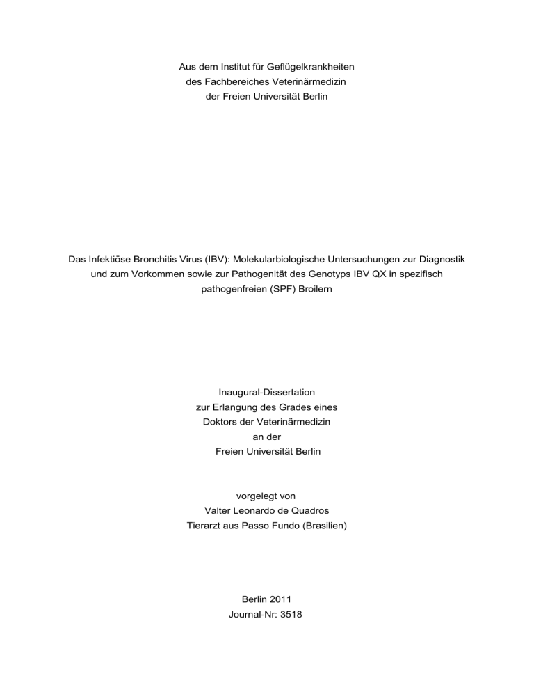 Aus dem Institut für Geflügelkrankheiten des Fachbereiches Veterinärmedizin der Freien Universität Berlin Das Infektiöse Bronchitis Virus (IBV): Molekularbiologische Untersuchungen zur Diagnostik und zum Vorkommen sowie zur Pathogenität des Genotyps IBV QX in spezifisch pathogenfreien (SPF) Broilern Inaugural-Dissertation zur Erlangung des Grades eines Doktors der Veterinärmedizin an der Freien Universität Berlin vorgelegt von Valter Leonardo de Quadros Tierarzt aus Passo Fundo (Brasilien) Berlin 2011 Journal-Nr: 3518 Gedruckt mit Genehmigung des Fachbereichs Veterinärmedizin der Freien Universität Berlin Dekan: Univ.-Prof. Dr. Leo Brunnberg Erster Gutachter: Univ.-Prof. Dr. Dr. Hafez Mohamed Hafez Zweiter Gutachter: Univ.-Prof. Dr. Klaus Osterrieder Dritter Gutachter: Univ.-Prof. Dr. Dieter Ebner Deskriptoren (nach CAB-Thesaurus): poultry diseases, coronavirus, infectious bronchitis virus, molecular biology, epidemiology, experimental infection, genotypes, strain, real time PCR, RT-PCR Tag der Promotion: 12.10.2011 Bibliografische Information der Deutschen Nationalbibliothek Die Deutsche Nationalbibliothek verzeichnet diese Publikation in der Deutschen Nationalbibliografie; detaillierte bibliografische Daten sind im Internet über <http://dnb.ddb.de> abrufbar. ISBN: 978-3-86387-116-1 Zugl.: Berlin, Freie Univ., Diss., 2011 Dissertation, Freie Universität Berlin D 188 Dieses Werk ist urheberrechtlich geschützt. Alle Rechte, auch die der Übersetzung, des Nachdruckes und der Vervielfältigung des Buches, oder Teilen daraus, vorbehalten. Kein Teil des Werkes darf ohne schriftliche Genehmigung des Verlages in irgendeiner Form reproduziert oder unter Verwendung elektronischer Systeme verarbeitet, vervielfältigt oder verbreitet werden. Die Wiedergabe von Gebrauchsnamen, Warenbezeichnungen, usw. in diesem Werk berechtigt auch ohne besondere Kennzeichnung nicht zu der Annahme, dass solche Namen im Sinne der Warenzeichen- und Markenschutz-Gesetzgebung als frei zu betrachten wären und daher von jedermann benutzt werden dürfen. This document is protected by copyright law. No part of this document may be reproduced in any form by any means without prior written authorization of the publisher. Alle Rechte vorbehalten | all rights reserved Choriner Str. 85 - 10119 Berlin Mensch und Buch Verlag 2012 [email protected] – www.menschundbuch.de Inhaltsverzeichnis I INHALTVERZEICHNIS 1. EINLEITUNG UND ZIELE DER ARBEIT ……………….…………………...……….. 1 2. LITERATURÜBERSICHT ………………………………………………………………. 2 2.1 Das Infektiöse Bronchitis Virus (IBV) ……………………….………...……….. 2 2.1.1 Taxonomie ……………………..………..………….…………………………... 2 2.1.2 Morphologie und Genom ………………………………..…………………….. 2 2.1.3 Strukturproteine …………………………………………..…………………..... 3 2.1.4 Genotypen …………………………………………………..………………….. 4 2.2 Die Infektiöse Bronchitis des Huhns (IB) ………………...……..…………….. 6 2.2.1 Geschichte ………………………………….……………….………………….. 6 2.2.2 Vorkommen und wirtschaftliche Bedeutung …………………….…………... 7 2.2.3 Epidemiologie und Pathogenese …………………………………………….. 8 2.2.4 Klinische Erscheinungen sowie pathologisch anatomische und histologische Veränderungen ……………………………...……………….. 2.2.5 Diagnose ………………………………………………………………………... 11 2.2.5.1 Erregernachweis …………………………………..……………………… 11 2.2.5.1.1 Virusisolierung ……………………………………………………….. 11 2.2.5.1.2 Antigennachweis …………………………………………………….. 12 2.2.5.1.3 Genomnachweis …………………………………………….……….. 12 2.2.5.2 Antikörpernachweis ……………………………...……………………….. 17 2.2.6 Bekämpfung ………………………………….…………………………………. 18 3. MATERIAL UND METHODEN ………………………………………………………… 20 3.1 Material ………………………..…………………...………………………………... 20 3.1.1 Verwendete Virus- und Bakterienstämme, Feldproben ……………………. 20 3.1.2 Spezifisch Pathogen Freie (SPF) Hühnereier und permanente Zellen …... 21 3.1.3 SPF Tiere ……………………………………………………………………….. 21 3.1.4 Antiseren ………………………………………………………………………... 21 3.1.5 Primer …………………………………………………………………………… 21 3.1.6 Puffer und Lösungen …………………………………………………………... 21 3.1.6.1 Allgemeine Puffer und Lösungen …………………...…………………... 21 3.1.6.2 Medien und Lösungen für die Zellkultur ………………………………... 22 3.1.6.3 Medien und Lösungen für die Klonierung ……………………………… 22 3.1.6.4 Puffer und Lösungen für Gelelektrophorese ……………………….… 24 9 II Inhaltsverzeichnis 3.1.7 Kits …………………………...………………………………………………….. 25 3.1.8 Sonstige Reagenzien und Chemikalien ……………………………...……… 27 3.1.9 Verbrauchsmittel …………………………………………...…………………... 28 3.1.10 Geräte und Laborhilfsmittel ………………………………………………….. 28 3.1.11 Software ……………………………………...………………………………... 30 3.2 Beschreib