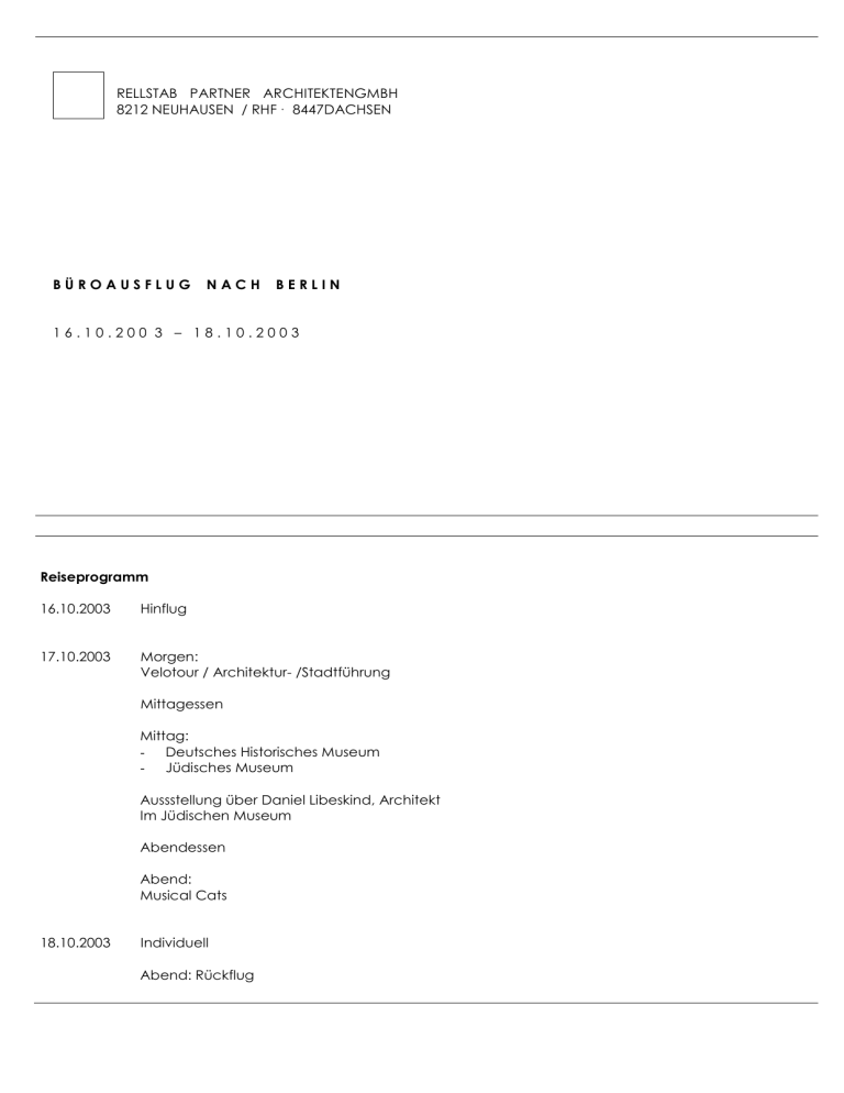 RELLSTAB PARTNER ARCHITEKTENGMBH 8212 NEUHAUSEN / RHF 8447DACHSEN BÜROAUSFLUG NACH BERLIN 16.10.200 3 – 18.10.2003 Reiseprogramm 16.10.2003 Hinflug 17.10.2003 Morgen: Velotour / Architektur- /Stadtführung Mittagessen Mittag: - Deutsches Historisches Museum - Jüdisches Museum Aussstellung über Daniel Libeskind, Architekt Im Jüdischen Museum Abendessen Abend: Musical Cats 18.10.2003 Individuell Abend: Rückflug Schweizer Botschaft Berlin – Tiergarten Diener & Diener 2000 – 2001 Die Entscheidung, das Haus zur Botschaft auszubauen, ergab organisatorisch die Schwierigkeit, ganz unterschiedliche Bereiche der Mission wie die Kanzlei und die Residenz auf engstem Raum nebeneinander mit getrennten Erschließungen anzuordnen. Nach der jetzigen Planung des Baseler Büros Diener & Diener - es konnte sich in einem Konkurrenzverfahren gegen sieben weitere Teilnehmer durchsetzen - soll der einst als elegantes Stadtpalais errichtete Bau weitgehend unverändert erhalten und genutzt werden - insbesondere seine teilweise prächtigen Repräsentations- und Residenzräume im Erdgeschoss und dem ersten Obergeschoss. An seiner Ostseite ist ein traufgleicher Erweiterungsbau von 22 Metern Höhe vorgesehen, der sich als eigenständige Architektur darstellt. In ihm sind auf fünf Etagen die diplomatischen und konsularischen Dienste untergebracht. Der naturbeige Sichtbeton-Neubau versucht durch seine Fassadenkomposition den festgefügten Ausdruck des Altbaus zu dynamisieren, um so das optische Gewicht zum neuen offenen Eingangshof zu verschieben. Der Schweizer Künstler Helmut Federle ergänzt das Ensemble durch eine Brandwandgestaltung. Auf die bestehende westliche Außenwand wird eine zweite Schicht aus ca. 60 cm dickem Beton gelegt, die an den Fenstern um 45 cm zurückspringt. Die Blindfenster sollen die triste Wand eindeutig als zum Palais gehörend erklären - und nicht zu einem abwesenden Nachbarhaus. Paul–Loebe–Haus und Marie–Elisabeth–Lüders–Haus Berlin – Mitte Stephan Braunfels 1997 – 2001 Das Bauwerk ist der größte Sichtbetonbau der Stadt, leider nicht so hell und sauber verarbeitet, wie es sich der Architekt gewünscht hätte. So wirkt die Fassade rohbauähnlich und wird wohl in den nächsten Jahren nachgebessert werden. Das Parlamentshaus wird dann heller grau als derzeit. Braunfels tröstete: "Fast alle Häuser in Berlin sind grau" Beton habe er verwendet, um den Kontrast zur sonstigen Leichtigkeit der Fassade deutlich zu machen, die zu 80 Prozent aus Glas bestehe. Der Bau besteht aus 21 runden Sitzungssälen für Ausschüsse, 450 Büros für deren Sekretariate und 510 Büros für die Abgeordneten, die sich um die verglasten Außenhöfe, die von oben kammartig wirken, gruppieren. Die Besuchergalerien in den Sälen ermöglichen, dass die Öffentlichkeit Kenntnis von der Arbeit der meisten Ausschüsse nehmen kann. Je drei doppelstöckige Sitzungssäle sind in den Rotunden untergebracht. Einem Abgeordneter stehen 19,5 qm pro Bürozimmer zu, er kann aber mit seinen Mitarbeitern insgesamt drei Räume nutzen. Ein Drittel aller Abgeordneten ist hier untergebracht. Auf der Westseite, wo das grosse Vordach Richtung Kanzleramt weist, befindet sich der Besucherdienst des Bundestags mit Vortragsräumen. In der Ost-Rotunde am anderen Ende des Baus werden zwei Restaurants eingerichtet, eines für den Bundestag und eines für seine Besucher. Über den Restaurants kann man von der Terrasse des 260 qm großen Europa-Saals die Spree und das Gegenüber genießen. Dort entstand das Marie-Elisabeth-Lüders-Haus. Gestalterisch bilden beide Häuser eine Einheit und sind unterirdisch miteinander verbunden. Viel Beton ragt auch in die achtgeschossige, fast 200 Meter lange Halle, die den Neubau in Ost-West-Richtung durchzieht und durch große Glasflächen den Blick aufs helle Kanzleramt und die Rohbauten des Marie-Elisabeth-Lüders-Hauses gewährt. Das glasgedeckte Rasterdach wirft bei Sonnenschein markante Schattenmuster. Die Abgeordneten und ihre Mitarbeiter können auf offenen Galerien wandeln mit Blick auf die Spree einerseits und auf grüne Höfe und den Reichstag andererseits. Umbau Reichstag (Kuppel) Berlin – Tiergarten Sir Norman Foster 1994 – 1999 Einer von Norman Foster renommiertesten Aufträgen beschäftigte sich mit dem Wiederaufbau des berühmten, von Paul Wallot 1884 begonnenen Abgeordnetenhauses, dem Reichstag. Zuerst durch ein Feuer und dann durch den Krieg verwüstet, verlor der Reichstag 1954 seine 76m hohe Kuppel. Nach einem ersten Entwurf, bei dem er einen 33 000 m2 grossen Baldachin vorschlug, gewann Foster den Auftrag gegen Santiago Calatrava und den niederländischen Architekten De Bruijn. Eine Reihe von bauhistorischen Zeugnissen, wie Granatspuren, verbranntes Holz und Graffiti, sollen erhalten bleiben, so dass der Reichstag zu einem lebendigen Museum wird. Fosters Entwurf sah ausserdem eine Energieversorgung vor, die sich ausschliesslich erneuerbarer Energiequellen bedient. Darüber hinaus wurde besonderer Wert auf eine natürliche Luftzirkulation gelegt. Ein drehbares Sonnenschutzschild ermöglicht den Einfall natürlichen Lichtes in den Plenarsaal bei gleichzeitigem Schutz vor zu starker Sonneneinstrahlung, während spiralförmige Rampen eine erhöhte Besucherplattform mit der wichtigsten Dachebene verbinden. Es gilt die goldene Architekten-Regel: Kein Bauwerk ohne Mängel. Beim Reichstag waren es gleich 6000 Beanstandungen, die zu einem intensiven Briefwechsel zwischen dem britischen Star-Architekten Norman Foster und der Bundesbaugesellschaft Berlin (BBB) führten. Sir Norman Foster ist einer der produktivsten zeitgenössischen Architekten, der seine Aufgeschlossenheit gegenüber neuen Technologien mit einem profundem Interesse an der sozialen und ökologischen Bedeutung seiner Bauten verbindet. Angefangen bei Hongkongs neuem Flughafen, Umbau des Berliner Reichtages oder des British Museum in London bis hin zum Entwurf der grössten landgestützten Brücke der Welt in 
