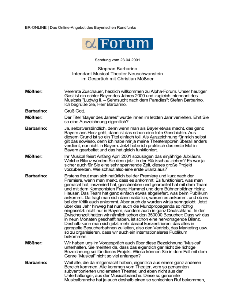 BR-ONLINE | Das Online-Angebot des Bayerischen Rundfunks Sendung vom 23.04.2001 Stephan Barbarino Intendant Musical Theater Neuschwanstein im Gespräch mit Christian Mößner Mößner: Barbarino: Mößner: Barbarino: Mößner: Barbarino: Mößner: Barbarino: Verehrte Zuschauer, herzlich willkommen zu Alpha-Forum. Unser heutiger Gast ist ein echter Bayer des Jahres 2000 und zugleich Intendant des Musicals "Ludwig II. – Sehnsucht nach dem Paradies": Stefan Barbarino. Ich begrüße Sie, Herr Barbarino. Grüß Gott. Der Titel "Bayer des Jahres" wurde ihnen im letzten Jahr verliehen. Ehrt Sie so eine Auszeichnung eigentlich? Ja, selbstverständlich, denn wenn man als Bayer etwas macht, das ganz Bayern ans Herz geht, dann ist das schon eine tolle Geschichte. Aus diesem Grund ist so ein Titel einfach toll. Als Auszeichnung für mich selbst gilt das sowieso, denn ich habe mir ja meine Theatersporen überall anders verdient, nur nicht in Bayern. Jetzt habe ich praktisch das erste Mal in Bayern gearbeitet und das hat gleich funktioniert. Ihr Musical feiert Anfang April 2001 sozusagen das einjährige Jubiläum. Welche Bilanz würden Sie denn jetzt in der Rückschau ziehen? Es war ja sicher auch für Sie eine sehr spannende Zeit, dieses große Projekt vorzubereiten. Wie schaut also eine erste Bilanz aus? Erstens freut man sich natürlich bei der Premiere und kurz nach der Premiere, wenn man merkt, dass es ankommt: Es funktioniert, was man gemacht hat, inszeniert hat, geschrieben und gearbeitet hat mit dem Team und mit dem Komponisten Franz Hummel und dem Bühnenbildner Heinz Hauser. Das Team hat ganz einfach etwas abgeliefert, was beim Publikum ankommt. Da fragt man sich dann natürlich, warum es ankommt und ob es bei der Kritik auch ankommt. Aber auch da wurden wir ja sehr gelobt. Jetzt über das Jahr hinweg hat nun auch die Mundpropaganda so richtig eingesetzt: nicht nur in Bayern, sondern auch in ganz Deutschland. In der Zwischenzeit hatten wir nämlich schon den 350000 Besucher: Dass wir das in neun Monaten geschafft haben, ist schon eine hervorragende Bilanz. Deshalb kann man sich jetzt mehr darauf konzentrieren, das alles in geregelte Besucherbahnen zu leiten, also den Vertrieb, das Marketing usw. so zu organisieren, dass wir auch ein internationaleres Publikum bekommen. Wir haben uns im Vorgespräch auch über diese Bezeichnung "Musical" unterhalten. Sie meinten da, dass das eigentlich gar nicht die richtige Bezeichnung sei für dieses Projekt. Wieso können Sie in dem Fall mit dem Genre "Musical" nicht so viel anfangen? Weil alle, die da mitgemacht haben, eigentlich aus einem ganz anderen Bereich kommen. Alle kommen vom Theater, vom so genannten subventionierten und ernsten Theater, und eben nicht aus der Unterhaltungs-, aus der Musicalbranche. Diese so genannte Musicalbranche hat ja auch deshalb einen so schlechten Ruf bekommen, Mößner: Einblendung: Barbarino: Mößner: Barbarino: weil es dabei immer mehr darum ging, quasi in einem Immobilienverein Immobilien zu vermakeln, als Stücke auf die Bühne zu stellen, die wirklich interessant sind. Natürlich war es prima, "Cats" nach Hamburg zu bringen und es dort 13 Jahre lang zu spielen: Das fand ich eine ganz großartige Geschichte. Aber auch durch diesen dauernden Import wurde in dieser Branche doch recht wenig Neues gemacht: Die Musicals, die man in New York oder in London sehen konnte, wurden dann eben auch bei uns gezeigt. Wir dagegen haben etwas ganz Neues gemacht. Wir haben praktisch etwas Neues entwickelt: Ich hatte damals zu Franz Hummel, dem Komponisten, gesagt, wir müssten uns etwas ausdenken, von dem niemand mehr weiß, ob es U- oder E-Musik ist, ob es in der Unterhaltungsoder in der Ernsten Musik angesiedelt ist. Es gibt im Übrigen nur in Deutschland diese Unterscheidung: Auf der ganzen Welt gibt es nur gute und schlechte Musik, allein in Deutschland gibt es zusätzlich noch die Unterscheidung in U- und E-Musik. Wir haben gesagt, dass wir uns genau auf diese Spalte setzen wollen. Das ist uns auch gelungen. Denn in der Zwischenzeit kann man gar nicht mehr genau sagen, wohin unser Stück gehört. Nehmen Sie z. B. die GEMA: Auch bei der GEMA wusste man nicht, in welchen Bereich wir gehören. Es kamen zwölf Mann von der GEMA angereist, um sich das vor Ort anzuschauen und sich zu entscheiden. Sie haben dabei genau darauf aufgepasst, ob es denn symphonische oder gehobene Unterhaltung sei. Da auch eine Blaskapelle spielt bei uns, sind wir nun der gehobenen Unterhaltung zugeschlagen worden. Wir sind also gerade noch so in der Unterhaltung drin, aber eigentlich sind wir schon auch ganz ernst und deswegen in der Ernsten Musik beheimatet. Man könnte ja auch sagen, dass das eine ernste Operette geworden ist, wenn man vom alten Genre der Operette ausgeht. Die Operette ist eben normalerweise lustig, aber in diesem Fall bei diesem Thema, also bei Ludwig II., wäre es natürlich sehr schwierig, das rein ins Lustige zu verlegen. Georg Ringswandl hat das in München ja auch gemacht, indem er das Ganze mehr in Richtung Persiflage und Satire verlagert hat. Wir dagegen haben uns mit der ganzen Situation in Füssen doch sehr ernsthaft befasst. Deshalb haben wir ja auch diesen Originalschauplatz gewählt, sodass es bei uns eben so ist, dass man am Schluss, wenn die Tür aufgeht, das echte Schloss Neuschwanstein sehen kann. Das beeinflusst natürlich die ganze Aufführung sehr wohl. Vielleicht schauen wir uns einen kleinen Ausschnitt an, denn es gibt ja viele Menschen, die noch nicht nach Füssen gekommen sind, um sich Ihr Musical anzusehen. Vielleicht könnten Sie diese Filmeinblendung auch ein wenig kommentieren. Lied der Kaiserin Sissi: "Es schluchzt meine Seele, sie jauchzt und sie weint..." Ja, das ist eine Szene, in der ich der Kaiserin von Österreich ihren eigenen Text – er ist aus einem Gedicht von ihr - in den Mund gelegt habe. Sie hatte ja mit dem König auch tatsächlich Gedichte ausgetauscht. Das habe ich eben zum Anlass genommen, u