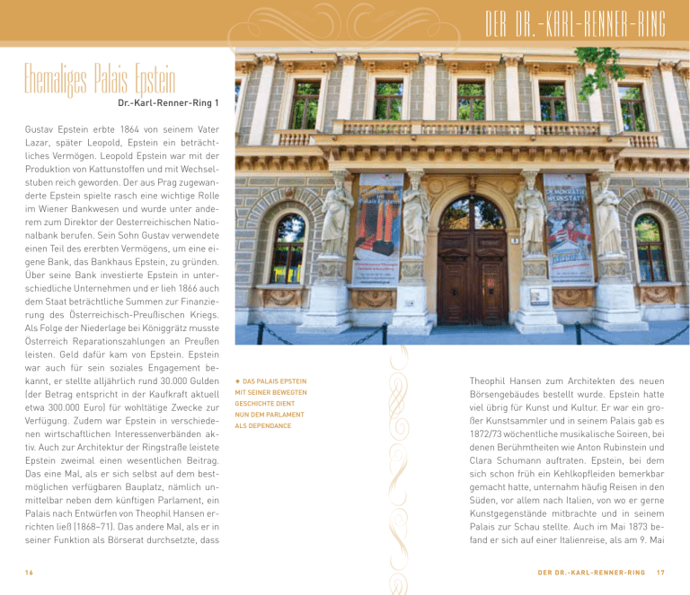 Gustav Epstein erbte 1864 von seinem Vater ­Lazar, später Leopold, Epstein ein beträcht­ liches Vermögen. Leopold Epstein war mit der Produktion von Kattunstoffen und mit Wechsel­ stuben reich geworden. Der aus Prag zugewan­ derte Epstein spielte rasch eine wichtige Rolle im Wiener Bankwesen und wurde unter ande­ rem zum Direktor der Oesterreichischen Natio­ nalbank berufen. Sein Sohn Gustav verwendete einen Teil des ererbten Vermögens, um eine ei­ gene Bank, das Bankhaus Epstein, zu gründen. Über seine Bank investierte Epstein in unter­ schiedliche Unternehmen und er lieh 1866 auch dem Staat beträchtliche Summen zur Finanzie­ rung des Österreichisch-Preußischen Kriegs. Als Folge der Niederlage bei Königgrätz musste Österreich Reparationszahlungen an Preußen leisten. Geld dafür kam von Epstein. Epstein war auch für sein soziales Engagement be­ kannt, er stellte alljährlich rund 30.000 ­Gulden (der Betrag entspricht in der Kaufkraft aktuell etwa 300.000 Euro) für wohltätige Zwecke zur Verfügung. Zudem war Epstein in verschiede­ nen wirtschaftlichen Interessenverbänden ak­ tiv. Auch zur Architektur der Ringstraße leistete Epstein zweimal einen wesentlichen ­Beitrag. Das eine Mal, als er sich selbst auf dem best­ möglichen verfügbaren Bauplatz, nämlich un­ mittelbar neben dem künftigen Parlament, ein Palais nach Entwürfen von Theophil Hansen er­ richten ließ (1868–71). Das andere Mal, als er in seiner Funktion als Börse­rat ­durchsetzte, dass 16 W Das Palais Epstein mit seiner bewegten Geschichte dient nun dem Parlament als Dependance ikgikgik Dr.-Karl-Renner-Ring 1 p p Theophil Hansen zum Archi­tekten des neuen Börsengebäudes bestellt wurde. Epstein hatte viel übrig für Kunst und Kultur. Er war ein gro­ ßer Kunstsammler und in seinem Palais gab es 1872/73 wöchentliche musikalische Soireen, bei denen Berühmtheiten wie Anton ­Rubinstein und Clara Schumann auftraten. Epstein, bei dem sich schon früh ein Kehlkopfleiden bemerkbar gemacht hatte, unternahm häufig Reisen in den Süden, vor allem nach Italien, von wo er gerne Kunstgegen­stände mitbrachte und in seinem Palais zur Schau stellte. Auch im Mai 1873 be­ fand er sich auf einer Italienreise, als am 9. Mai De r Dr . -K a r l-R e n n e r -R in g 17 18 ikgikgik 1873, dem Schwarzen Freitag der Wiener Börse, die Kurse dermaßen dramatisch einbrachen, dass die Börse schon um 13 Uhr behördlich geschlossen werden musste. ­Epstein kehrte umgehend nach Wien zurück, doch er konnte nur mehr mit Mühe den sofortigen völligen Zu­ sammenbruch seines Bankhauses verhindern. Das übrige betriebliche Vermögen der ­Familie Epstein war verloren. – In einem späteren Nach­ ruf auf Gustav Epstein in der „Neuen ­Freien Presse“ wurde das so beschrieben: „Als er heimkehrte, war er ein ruinierter Mann, und aus dem Millio­när war ein armer Bürger geworden.“ Zu allem Überdruss hatte auch noch der Kassier des Bankhauses eigene Schulden aus der Kas­ se der Bank beglichen und Selbstmord verübt. Gustav Epstein war gezwungen, seinen verblie­ benen Besitz zu veräußern, eine von Otto ­Wagner entworfene Villa in Baden, die Kunstwer­ke, Lie­ genschaften. Das Palais am Ring konnte vor­ erst, mit Hypotheken belastet, gehalten werden. Die Bank wurde – wie es hieß – „in Ehren“ ge­ schlossen. Nach dem Tod seines Sohnes Fried­ rich 1877 veräußerte ­Epstein das Palais an die britische Imperial Continental Gas Associa­tion p p AW Die Ähnlichkeiten der ObergeschoSSzone des Palais Epstein mit der des rund sieben Jahre später entstandenen Hauses Wagner am Schottenring sind sicherlich kein Zufall (siehe Seite 172 und Seite 178 f.) (I.C.G.A.), die zu diesem Zeitpunkt einen Gutteil der Wiener Gasversorgung in Händen hielt. Die schlechte Qualität der Gasversorgung durch das britische Privatunternehmen veranlasste den Wiener Gemeinderat, auf Betreiben des Bürger­ meisters Karl Lueger am 21. Oktober 1896 den Beschluss zu fassen, den mit der I.C.G.A. bis 1899 laufenden Vertrag nicht zu verlängern und den Briten keinerlei Ablöse für ihre Installatio­ nen zu zahlen. Stattdessen wurde innert dreier Jahre eine kommunale Gasversorgung auf die Beine gestellt. Die I.C.G.A. zog sich in der Folge aus Österreich zurück, das Palais Epstein ging in Staatsbesitz über. 1902 zog hier der Verwal­ tungsgerichtshof ein, 1922 wurde das Gebäude zum Sitz des Stadtschulrats. Die Nationalsozia­ listen quartierten den Stadtschulrat aus und brachten hier zwischen 1938 und 1945 eine Dependance des Reichbauamts unter. Von 1945 De r Dr . -K a r l-R e n n e r -R in g 19 Das Palais Epstein ist ein strenghistoristischer Bau in den Formen der römischen Renaissance, mit rechteckigem, glasüberdachtem Innenhof. An der Ringstraßenfassade fällt das Hauptpor­ tal mit seinem dreiachsigen Balkon besonders ins Auge. Die vier balkontragenden ­Karyatiden stammen von Vincenz Pilz. Pilz hat auch die ­Hygieia geschaffen, die als Brunnenfigur in ei­ ner Rundbogenädikula im Innenhof steht. Im Haus selbst sind das Vestibül, die Marmorstie­ ge und die Beletage von ­besonderem Interes­ se. Der ehemalige von Theophil Hansen und Carl Rahl entworfene Tanzsaal wurde 1922 zu einem Verhandlungssaal umgebaut. Die his­ toristische Raumgestaltung mit den korinthi­ schen Pilas­tern, den Ädikulatüren und der reich geschmück­ten Kassettendecke blieb erhalten. A Otto Wagner mal zwei. Links beim Haus Prohaska als entwerfender Architekt, rechts beim Palais Epstein als ausführender Mitarbeiter des Architekten Theophil Hansen 20 ikgikgik bis 1955 beherbergte das Palais die Sowjetische Kommandantur in Wien. Nach dem Abzug des sowjetischen Stabs kehrte der Stadtschulrat ins Palais Epstein zurück. Seit 2005 dient das Haus dem benachbarten österreichischen Parlament als Dependance. p p Die Entwürfe zu den Bildern in den Kassetten­ feldern stammen von Carl Rahl, die Ausfüh­ rung oblag Christian Griepenkerl (1871/