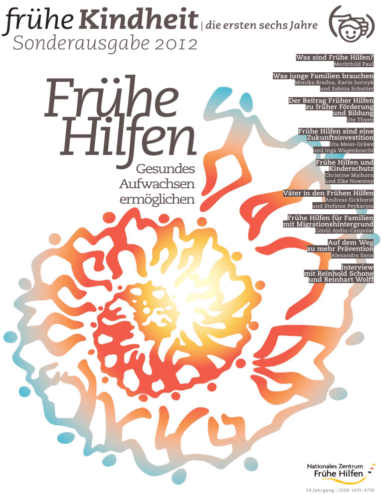 Sonderausgabe 2012 Was sind Frühe Hilfen? Mechthild Paul Was junge Familien brauchen Monika Bradna, Karin Jurczyk und Sabina Schutter Der Beitrag Früher Hilfen zu früher Förderung und Bildung Ute Thyen Frühe Hilfen sind eine Zukunftsinvestition Uta Meier-Gräwe und Inga Wagenknecht Frühe Hilfen und Kinderschutz Christine Maihorn und Elke Nowotny Väter in den Frühen Hilfen Andreas Eickhorst und Stefanie Peykarjou Frühe Hilfen für Familien mit Migrationshintergrund Gönül Aydin-Canpolat Auf dem Weg zu mehr Prävention Alexandra Sann Interview mit Reinhold Schone und Reinhart Wolff 14.Jahrgang | ISSN 1435- 4705 www.fruehehilfen.de PUBLIKATIONEN DES NZFH – NATIONALES ZENTRUM FRÜHE HILFEN Kostenlos bestellen und mit dem Newsletter regelmäßige Informationen erhalten 1 FORSCHUNG UND PRAXISENTWICKLUNG FRÜHER HILFEN MATERIALIEN ZU FRÜHEN HILFEN 4 MODELLPROJEKTE BEGLEITET VOM NATIONALEN ZENTRUM FRÜHE HILFEN EXPERTISE KOSTEN UND NUTZEN FRÜHER HILFEN Eine Kosten-Nutzen-Analyse im Projekt »Guter Start ins Kinderleben« NATIONALES ZENTRUM FRÜHE HILFEN Herausgegeben von: Ilona Renner, Alexandra Sann, Nationales Zentrum Frühe Hilfen NATIONALES ZENTRUM FRÜHE HILFEN | KÖLN 2010 Das Nationale Zentrum Frühe Hilfen. Bestell-Nr.: 16000000 Expertise Kosten und Nutzen Früher Hilfen. Bestell-Nr.: 16000122 Forschung und Praxisentwicklung Früher Hilfen. Bestell-Nr.: 16000116 Modellprojekte in den Ländern. Bestell-Nr.: 16000117 MODELLPROJEKT MATERIALIEN ZU FRÜHEN HILFEN 2 BESTANDSAUFNAHME KOMMUNALE PRAXIS FRÜHER HILFEN IN DEUTSCHLAND MATERIALIEN ZU FRÜHEN HILFEN GUTER START INS KINDERLEBEN 1 BESTANDSAUFNAHME ZUR ENTWICKLUNG DER KOMMUNALEN PRAXIS IM BEREICH FRÜHER HILFEN INTERVENTIONS- UND PRÄVENTIONSMASSNAHMEN IM BEREICH FRÜHER HILFEN Chancen und Stolpersteine interdisziplinärer Kooperation und Vernetzung im Bereich Früher Hilfen und im Kinderschutz Mit Förderung der Bundesländer Baden-Württemberg, Bayern, Rheinland-Pfalz und Thüringen sowie des Bundesministeriums für Familie, Senioren, Frauen und Jugend und des Nationalen Zentrums Frühe Hilfen Internationaler Forschungsstand, Evaluationsstandards und Empfehlungen für die Umsetzung in Deutschland Ute Ziegenhain, Angelika Schöllhorn, Anne K. Künster, Alexandra Hofer, Cornelia König, Jörg M. Fegert WERKBUCH VERNETZUNG KOMPAKT EXPERTISE WERKBUCH VERNETZUNG ZWEITE TEILUNTERSUCHUNG Teiluntersuchung 1: Kooperationsformen ������������������������� MATERIALIEN ZU FRÜHEN HILFEN Bestandsaufnahme: Kommunale Praxis Früher Hilfen in Deutschland erste Teiluntersuchung. Bestell-Nr.: 16000115 Bestandsaufnahme zur Entwicklung der kommunalen Praxis im Bereich Früher Hilfen – zweite Teiluntersuchung. Bestell-Nr.: 16000124 DIE BEDEUTUNG DER SCHWANGERSCHAFTSBERATUNG IM KONTEXT FRÜHER HILFEN Interventions- und Präventionsmaßnahmen im Bereich Früher Hilfen. Internationaler Forschungsstand, Evaluationsstandards und Empfehlungen für die Umsetzung in Deutschland. Bestell-Nr.: 16000102 STANDORTBESTIMMUNG MATERIALIEN ZU FRÜHEN HILFEN VORBEMERKUNG ZUR ENTSTEHUNG DIESES PAPIERS 3 Das vorliegende Papier wurde auf der Grundlage eines Entwurfs von Frau Prof. Dr. Ulrike Busch (Hochschule Merseburg) entwickelt. Dieser basiert auf ihrem Vortrag »Welche Bedeutung kommt der Schwangerschaftsberatung im Rahmen der Frühen Hilfen zu?«. Der Vortrag war eines der zentralen Inputreferate auf der gemeinsamen Fachtagung »Unterstützung von Anfang an! Schwangerschaftsberatungsstellen als Brückenbogen zu Jugendhilfe und Gesundheitswesen« des Nationalen Zentrums Frühe Hilfen (NZFH) und der Bundesarbeitsgemeinschaft der Freien Wohlfahrtspflege (BAGFW) am 23.09.2008 in Bad Lauterberg.1 Auf dieser Fachtagung wurde deutlich, wie hoch der Bedarf für eine Standortbestimmung der Schwangerschaftsberatung im Kontext Früher Hilfen ist. In der Folge wurde die nun vorliegende Standortbestimmung, unterstützt durch die fachliche Expertise der Spitzenverbände der Freien Wohlfahrtspflege, erarbeitet.2 TAGUNGSDOKUMENTATION Frühe Hilfen bei Häuslicher Gewalt Tagungsdokumentation des Nationalen Zentrums Frühe Hilfen (NZFH) und des Informationszentrums Kindesmisshandlung/ Kindesvernachlässigung (IzKK) zur Schnittstelle von Frühen Hilfen und Häuslicher Gewalt. 9. bis 11. Oktober 2009, in Kooperation mit der Evangelischen Akademie in Tutzing und der Frauenhauskoordinierung e.V. (Frankfurt). TAGUNGSDOKUMENTATION Frühe Hilfen bei Häuslicher Gewalt Werkbuch Vernetzung. Chancen und Stolpersteine interdisziplinärer Kooperation. Bestell-Nr.: 16000110 INHALT 1. Ausgangslage 2 DATENSCHUTZ BEI FRÜHEN HILFEN 2. Das Selbstverständnis von Schwangerschaftsberatung 3 3. Frühe Hilfen – begriffliche und konzeptionelle Aspekte 5 4. Schnittstellen zwischen Schwangerschaftsberatung und Frühen Hilfen 8 5. Herausforderungen der Schwanger- Praxiswissen Kompakt Deutsches Institut für Jugendhilfe und Familienrecht (DIJuF) e.V. Frühe Hilfen bei Häuslicher Gewalt. Bestell-Nr.: 16000118 Datenschutz bei Frühen Hilfen. Praxiswissen Kompakt. Bestell-Nr.: 16000112 Bitte senden Sie mir kostenlos folgende Publikationen zu Bestellnummer: Name, Vorname: Straße, Hausnummer: Postleitzahl, Ort: Bitte senden Sie mir Ihren Newsletter zu. E-Mail-Adresse: schaftsberatung im Feld Früher Hilfen und ihre Grenzen in der 1 2 Dokumentation der Fachtagung unter http://www.fruehehilfen.de/3368.0.html; zuletzt aufgerufen am 18.09.2009. Das NZFH hat die Standortbestimmung auch mit dem Bundesverband donum vitae e.V. und dem Deutschen Städtetag diskutiert, die diese Standortbestimmung unterstützen. Mitwirkung im Kinderschutz 10 6. Empfehlungen / weiteres Vorgehen 14 Die Bedeutung der Schwangerschaftsberatung im Kontext Früher Hilfen. Bestell-Nr.: 16000113 Diese und weitere Publikationen des Nationalen Zentrums Frühe Hilfen können kostenlos bestellt oder auf www.fruehehilfen.de heruntergeladen werden. Alle zwei Monate informiert ein Newsletter ü