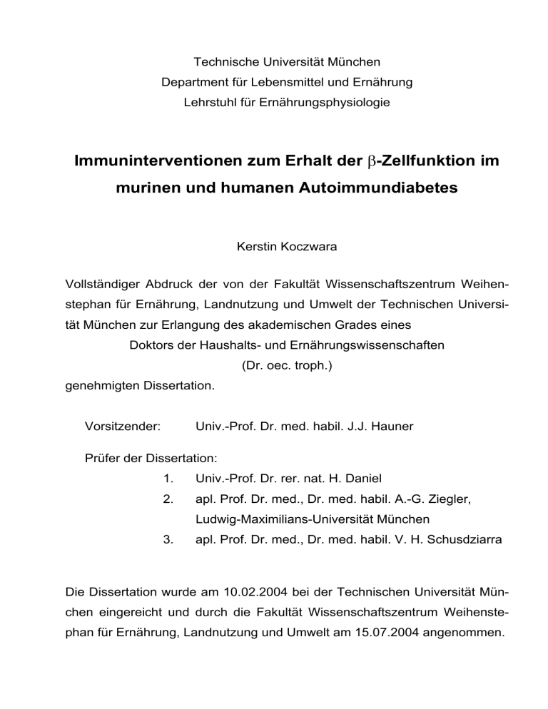Technische Universität München Department für Lebensmittel und Ernährung Lehrstuhl für Ernährungsphysiologie Immuninterventionen zum Erhalt der β-Zellfunktion im murinen und humanen Autoimmundiabetes Kerstin Koczwara Vollständiger Abdruck der von der Fakultät Wissenschaftszentrum Weihenstephan für Ernährung, Landnutzung und Umwelt der Technischen Universität München zur Erlangung des akademischen Grades eines Doktors der Haushalts- und Ernährungswissenschaften (Dr. oec. troph.) genehmigten Dissertation. Vorsitzender: Univ.-Prof. Dr. med. habil. J.J. Hauner Prüfer der Dissertation: 1. Univ.-Prof. Dr. rer. nat. H. Daniel 2. apl. Prof. Dr. med., Dr. med. habil. A.-G. Ziegler, Ludwig-Maximilians-Universität München 3. apl. Prof. Dr. med., Dr. med. habil. V. H. Schusdziarra Die Dissertation wurde am 10.02.2004 bei der Technischen Universität München eingereicht und durch die Fakultät Wissenschaftszentrum Weihenstephan für Ernährung, Landnutzung und Umwelt am 15.07.2004 angenommen. Inhaltsverzeichnis INHALTSVERZEICHNIS ABKÜRZUNGSVERZEICHNIS 7 1 EINLEITUNG 9 1.1 Allgemeine Grundlagen des Typ 1 Diabetes 12 1.1.1 T-Zellen im Typ 1 Diabetes 13 1.1.2 B-Zellen im Typ 1 Diabetes und mit Typ 1 Diabetes assoziierte Antigene 14 1.1.3 Kooperation von T- und B-Zellen in der Pathogenese von Typ 1 Diabetes 15 1.2 1.1.4 Ansätze zum Eingriff in die Pathogenese des Typ 1 Diabetes 16 1.1.5 Die NOD Maus, ein Tiermodell für Typ 1 Diabetes 17 Stand der Forschung als Grundlage dieser Arbeit 19 1.2.1 Einfluss von Antikörperübertragungen während der Schwangerschaft von Müttern mit Inselzell-Autoimmunität oder Typ 1 Diabetes auf das Autoimmundiabetesrisiko der Nachkommen 19 1.2.2 Immunisierungen mit Insulin und davon ausgehende protektive Auswirkungen auf die Entwicklung von autoimmunem Diabetes im NOD Mausmodell 1.2.3 Mucine und deren Einfluss auf das Immunsystem 20 20 1.2.4 Die Rolle von Gluten bei den Autoimmunerkrankungen Typ 1 Diabetes und Zöliakie 22 1.2.5 Histamin, Histamin-1-Rezeptoren und Histamin-2-Rezeptoren und deren Einfluss auf das Immunsystem 24 1.2.6 Einfluss von Vitamin D auf das Immunsystem und bekannte Wirkungen von Vitamin D auf die Entwicklung von Typ 1 Diabetes 26 1.3 Fragestellungen der vorliegenden Arbeit 29 2 MATERIAL UND METHODEN 31 2.1 Untersuchungsgruppen und Behandlungsprotokolle 31 2.1.1 Untersuchungen im NOD Mäusekollektiv 31 2.1.1.1 Diabetesprotektion durch Immunisierungen mit Insulin und Auswirkungen auf die Nachkommen 33 2 Inhaltsverzeichnis 2.1.1.2 Behandlung mit Mucin über das Trinkwasser 2.1.1.3 Glutenfreie Nahrung über verschiedene Zeiträume und glutenfreie Nahrung mit dem Zusatz von Gliadin 2.1.1.4 39 Therapie mit Histamin-1- und Histamin-2-Rezeptor-Antagonisten über das Trinkwasser 2.1.1.5 37 41 Unbehandelte weibliche Mäuse zur Darstellung der natürlichen Diabetes-Inzidenz und Insulinautoantikörper-Prävalenz in der verwendeten NOD Kolonie 2.1.1.6 42 Behandlung und Nachverfolgung der weiblichen NOD Mäuse in allen Behandlungs- und Kontrollgruppen 42 2.1.1.7 Durchführung von Blutabnahmen an lebenden Mäusen 43 2.1.1.8 Exitus bei Diabetesmanifestation oder am Versuchsende mit Blutund Organentnahme und Herstellung von Einzelzellpräparationen aus NOD Milzen 43 2.1.2 Diabetesrisiko bei Kindern von Müttern mit Typ 1 Diabetes in Abhängigkeit der transplazentär übertragenen Inselantikörper 45 2.1.3 Orale Supplementierung mit Calcitriol über neun Monate bei erwachsenen Personen mit neu manifestiertem Typ 1 Diabetes 2.2 Beschreibung der angewendeten Messmethoden 46 50 2.2.1 Detektion von Insulin(auto)antikörpern in murinen und humanen Seren im Radioliganden-Bindungsassay 50 2.2.2 Detektion von Insulin(auto)antikörpersubklassen in murinen und humanen Seren im Radioliganden-Bindungsassay 51 2.2.3 Detektion von Autoantikörpern gegen GAD und IA-2 in humanen Seren 53 2.2.3.1 Antigenmarkierung durch Einbau von 35S-Methionin 2.2.3.2 Detektion von Antikörpern gegen die Autoantigene GAD und IA-2 im Radioliganden-Bindungsassay 53 53 2.2.4 Detektion von IgG1-spezifischen Anti-Gliadin-Antikörpern in murinen Seren im ELISA 55 2.2.5 Detektion von Anti-Tetanus-Toxoid-Antikörpersubklassen in murinen Seren im ELISA 56 2.2.6 Bestimmung der Zytokinsekretion von murinen Milzzellen nach Stimulation mit Tetanus-Toxoid mit Elispot-Tests 57 3 Inhaltsverzeichnis 2.2.7 Bestimmung der C-Peptid-Ausschüttung nüchtern und nach Stimulation mit einer Mischmahlzeit 58 2.2.8 Safety-Parameter der mit Calcitriol behandelten Personen 59 2.2.9 Typisierung der HLA-Genotypen 59 2.3 Statistik 60 3 ERGEBNISSE 61 3.1 Kumulative Diabetes-Inzidenz und Insulinautoantikörper-Prävalenz bei unbehandelten weiblichen NOD Mäusen 3.2 61 Diabetesprotektion durch Immunisierungen mit Insulin, Übertragung von mütterlichen (Auto)Antikörpern und deren Auswirkungen auf die Nachkommen 63 3.2.1 Immunisierungen von weiblichen NOD Mäusen vor und während der Trächtigkeit und Übertragbarkeit der induzierten Diabetesprotektion auf die Nachkommen 3.2.1.1 Diabetes-Inzidenzen der immunisierten und unbehandelten Muttertiere 3.2.1.2 3.2.1.5 64 Insulin(auto)antikörper-Prävalenzen der immunisierten und unbehandelten Muttertiere 3.2.1.4 63 Diabetes-Inzidenzen der weiblichen Nachkommen abhängig von der Behandlung ihrer Muttertiere 3.2.1.3 63 65 Diabetes-Inzidenzen der weiblichen Nachkommen abhängig vom Insulinantikörperstatus ihrer Muttertiere 66 Insulinautoantikörper-Prävalenzen der Nachkommen 67 3.2.2 Auswirkungen der Übertragung von Inselautoantikörpern während der Schwangerschaft auf das Diabetesrisiko bei Kindern von Müttern mit Typ 1 Diabetes 69 4 Inhaltsverzeichnis 3.3 Auswirkungen von Mucin auf die Entwicklung von Diabetes und Autoimmunität bei weiblichen NOD Mäusen 73 3.3.1 Kumulative Diabetes-Inzidenzen der mit Mucin behandelten Mäuse 73 3.3.2 Insulinautoantikörper-Prävalenzen der mit Mucin behandelten Mäuse bei zehn Lebenswochen und bei Exitus 3.4 74 Auswirkungen von glut