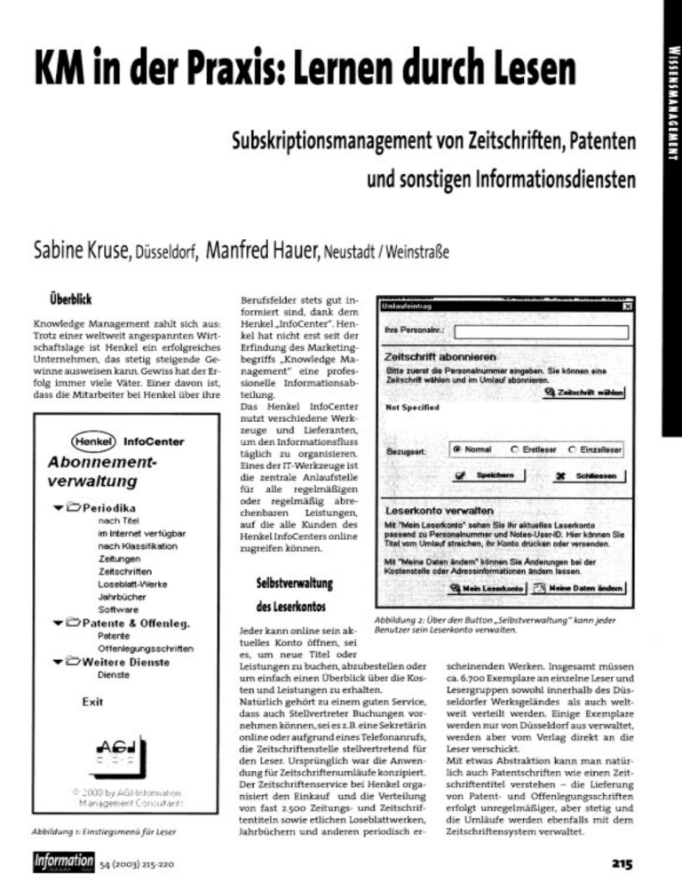 KM in der Praxis: lernen durch lesen Subskriptionsmanagement von Zeitschriften, Patenten und sonstigen Info rmat ionsdiensten bine Kruse, Düsseldorf, Manfred Hauer, Neustadt Überblick Knowledge Management zahlt sich aus: Trotz einer weltweit angespannten Wirtschaftslage ist Henkel ein erfolgreiches Unternehmen, das stetig steigende Gewinne ausweisen kann. Gewiss hat der Erfolg immer viele Väter. Einer davon ist, dass die Mitarbeiter bei Henkel über ihre fnternet verfügbar nach Zeitungen Zeitschriften Loseblatt-Werke Jahrbücher Software Patente Patente Of Dienste Exit Abbildung I:Einstiegsmenü für Leser 54 (2003)215-220 Berufsfelder stets gut informiert sind, dank dem Henkel ,,InfoCenter".Henkel hat nicht erst seit der Erfindung des Marketingbegriffs ,,Knowledge Management" eine professionelle Informationsabteilung. Das Henkel InfoCenter nutzt verschiedene Werkzeuge und Lieferanten, um den Informationsfluss täglich zu organisieren. Eines der IT-Werkzeuge ist die zentrale Anlaufstelle fur alle regelmäßigen oder regelmäßig abrechenbaren Leistungen, auf die alle Kunden des Henkel InfoCentersonline zugreifen können. Weinstraße . . I Not Specified bstverwaltung des teserkontos Abbildung 2: Über den Button „Selbstverwaltung" kann jeder Benutzer sein Leserkonto verwalten. Jeder kann online sein aktuelles Konto Öffnen, sei es, um neue Titel oder Leistungen zu buchen, abzubestellen oder scheinenden Werken. Insgesamt müssen um einfach einen Überblick über die Kos6.700 Exemplare an einzelne Leser und Lesergruppen sowohl innerhalb des Düsten und Leistungen zu erhalten. seldorfer Werksgeländes als auch weltNatürlich gehört zu einem guten Service, dass auch Stellvertreter Buchungen vorweit verteilt werden. Einige Exemplare nehmen können, sei es z.B.eine Sekretärin werden nur von Düsseldorf aus verwaltet, online oder aufgrund eines Telefonanrufs, werden aber vom Verlag direkt an die Leser verschickt. die Zeitschriftenstelle stellvertretend den Leser. Ursprünglich war die AnwenMit etwas Abstraktion kann man natürdung fur Zeitschriftenumläufekonzipiert. lich auch Patentschriften wie einen ZeitDer Zeitschriftenservice bei Henkel orgaschriftentitel verstehen - die Lieferung nisiert den Einkauf und die Verteilung von Patent- und Offenlegungsschriften erfolgt unregelmäßiger, aber stetig und von fast 2.500 Zeitungs- und Zeitschrifdie Umläufe werden ebenfalls mit dem tentiteln sowie etlichen Loseblattwerken, Zeitschriftensystem verwaltet. Jahrbüchern und anderen periodisch er- Auch die kostenpflichtigen User-IDs zu unterschiedlichen Datenbanken kann man als abrechenbare Leistung in diesem System verwalten. Ebenso die Nutzung von GrapeVine,einer Art Spider, der die Datenbanken laufend nach einschlägigen Themen durchforstet und relevante Informationen direkt in die Mail-Briefkästen der angeschlossenen User verschickt. Auch das neue NewsPortal von Henkel, gehört in die Gruppe der ,,WeiterenDienste". IC Media Directory (T) Advanced Synthesis Advanced Synihesis Umlaufverbuchung Je eine Person bucht je ein Medium. Jede Person kann viele Medien abonnieren. Jedes Medium kann von vielen Personen gebucht werden.Wir haben also eine Relation und jeder Link ist genau eine Buchung oder Bestellung, die Verbindung zwischen Person und Medium. Die Buchung kann ein Anwender online aus- Abbildung 3: Media Circulation verknüpft Leser mit Medien. An der Verknüpfung hängt das Accounting, Archivierung, Buchbinderei und neuerdings auch intelligentNEWS. 216 Catalycis I Architektur Um die Datenbank unter Lotus Notes Domino transparent, performant und stabil zu halten, ist es sinnvoll, die Anwendung in einzelne Lotus Notes DominoDatenbanken zu zerlegen. Grob betrachtet genügen zunächst drei Datenbankobjekte: Personen - Medien - Links zwischen Personen und Medien So zerteilt, sind alle drei Objekte relativ stabil, nicht ständigen Änderungen unterworfen. Die Datenbanken dazu IC Address Contact (Personen), IC Media Directory (Medien)und IC Media Circulation (Links). Catalysis + Absiraci inhalisveizeichnis Nui Aktuelle Auszuge Subskription geplani zur CB Abbildung 4: Erfassungsmaske - Teil führen, von berechtigten Vertretern ausführen lassen oder die Zeitschriftenstelle übernimmt die Buchung. Dabei kann sie auch die Abo-Profile eines Mitarbeiters auf einen Nachfolger oder anderen Kollegen übertragen, ohne einzeln buchen zu müssen. An jeder Person und an jedem Medium hängt eine Reihe von Regeln, welche die Programmierung dahinter reichlich komplex werden lässt. Dazu einige Regelbeispiele: Bei jedem Medium wird festgelegt, wie viele Personen auf ein physisches Exemplar maximal zugreifen sollen. gibt es kein hartes jeder Leser soll noch hinreichend rechtzeitig ein Exemplar erhalten - die Erfahrung der internen Mitarbeiter,die Erscheinungshäufigkeit einer Publikation und natürlich das Budget legen die Grenzen fest. Diese Grenzen sind dynamisch änderbar. Es gibt Exemplare fur den Umlauf, wo n Leser bei einer durchschnittlichen Lesezeit von x Tagen eingetragen werden dürfen. Doch wer mehr bezahlt, kann auch als ,,Einzelleser" häufiger Fall bei Tageszeitungen - oder als erster Leser auf einer Umlaufliste erscheinen. Der letzte Leser ist bei einem Kreisumlauf entweder wiederum die interne Zeitschriftenstelle oder eine Bibliothek oder ein echter menschlicher Leser, der diese Publikation gerne sammelt. Die Sortierung der Umlauflisten dazwischen berechnet sich automatisch aus Gebäuden, Etagen mernummern. Nur: und Gewichtungen zwischen den Mitarbeitern gestatten es der Zeitschriftenstelle, die alternative oder zusätzliche Sortierungdem sozialen Ranking anzupassen. macht für externe Mitarbeiter und andere der Direktbezug Sinn, d.h.,die Publikation wird zwar von der Zeitschriftenstelle bestellt, abbestellt,verbucht - doch physisch immer direkt vom Lieferanten zum Leser transportiert. Papier geht manchmal verloren, wird vergessen oder unterwegs beschädigt. Somit kann ein Exemplar im Umlauf ausfal