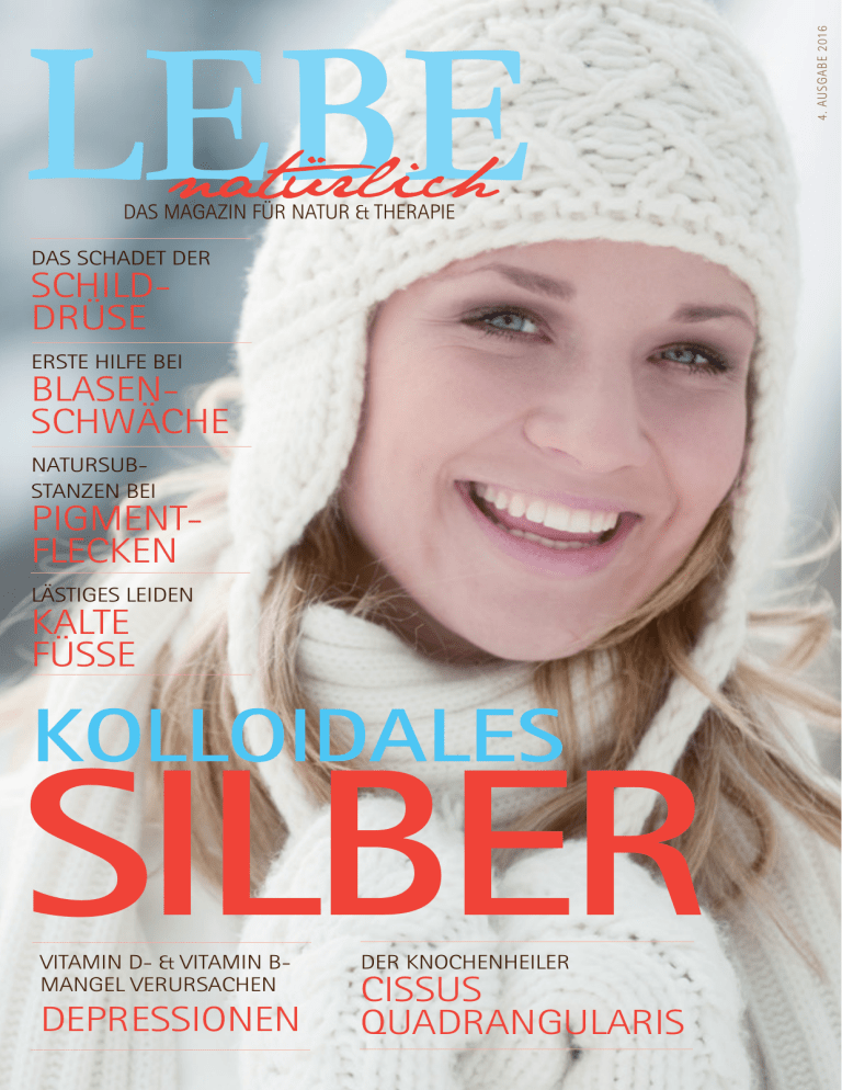 Das Magazin für Natur & Therapie Das schadet der SCHILDDRÜSE Erste Hilfe bei BLASENSCHWÄCHE Natursubstanzen bei PIGMENTFLECKEN Lästiges Leiden Kalte FüSSe Kolloidales SILBER Vitamin D- & Vitamin BMangel verursachen DEPRESSIONEN Der Knochenheiler CISSUS QUADRANGULARIS 4. AUSGABE 2016 LEBE PROBLEMORGAN SCHILDDRÜSE DR. DORIS STEINEREHRENBERGER LIEBE LESERINNEN UND LESER, 10 6 IMMER KALTE FÜSSE? fa & 14 KOLLOIDALES SILBER 7 HILFE BEI BLASENSCHWÄCHE PIGMENTFLECKEN 16 20 DEPRESSIONEN DURCH VITAMINMANGEL? 18 IMPRESSUM Mit den besten Grüßen herzlichst Ihre CISSUS DER KNOCHENHEILER Medieninhaber und Herausgeber: Verein Netzwerk Gesundheit, Natur & Therapie, Postfach 10, A-8382 Mogersdorf, natursubstanzen.com Chefredakteurin: Dr. phil. Doris Steiner-Ehrenberger, Mobil: +43 664 311 13 87 Grafik: Erek Engelberger Fotos: thinkstock.com, fotolia.com Erscheinungsort: Mogersdorf Druck: Gugler GmbH, 3390 Melk/Donau, Auf der Schön 2 Mitarbeiter dieser Ausgabe: Dr. phil. Doris Steiner-Ehrenberger, Silvia Konrath, Benny Ehrenberger, Daniela Merkl Titelfoto: thinkstock.com Auflage: 60.000 Erscheint 4mal jährlich Abo-Bestellung/Verwaltung: [email protected] Bankverbindung: RAIKA, IBAN: AT94 3303 4000 0191 4209, BIC: RLBBAT2E034 02 LEBE 4/2016 4 das Jahr geht dem Ende zu und ich hoffe natürlich sehr, dass viele wieder Mitglied beim Verein Netzwerk Gesundheit, Natur & Therapie werden. Die Mitgliedschaft muss ja jedes Jahr erneuert werden, kostet aber nur 20,– Euro. Dafür bekommen Sie viermal jährlich dieses Magazin zugeschickt und monatliche Newsletter zugemailt. Alle alten Ausgaben des Magazins sind auf der Vereinswebsite nachlesbar. Wir halten das deshalb für wichtig, weil sich heutzutage jeder selbst um seine Gesundheit kümmern und mit allen möglichen Mitteln und Methoden auch lange erhalten sollte. In öffentlichen Medien erfährt man einfach zu wenig über Naturheilkunde und über Natursubstanzen, die eventuell helfen können. In diesem Sinne werden Ihnen gerade die Artikel über Blasenschwäche, Schilddrüsenprobleme und kolloidales Silber viele neue - und auch ungewöhnliche - Erkenntnisse bringen. Hier spielen außerdem Empfehlungen der Therapeuten herein, die im Netzwerk mitwirken und es mit ihrem Erfahrungsschatz bereichern! So manche neue oder wiederentdeckte Forschung, wie die über Kolloide, steckt nämlich erst in den Kinderschuhen. Es ist Pionierarbeit sozusagen und darum doppelt bedeutend, wenn die vielen schon vorhandenen Erfolgsberichte mit anderen geteilt werden können... Dr. Doris Steiner-Ehrenberger Verein Netzwerk Gesundheit Natur & Therapie, [email protected] P.S. Details zu den nächsten Workshops finden Sie unter natursubstanzen.com. Dort sind auch zahlreiche Fallberichte aufgelistet, unsere laufenden Veranstaltungen, alle bisher erschienenen Magazine und noch vieles mehr. Höchster Standard für Ökoeffektivität. Weltweit einzigartig: Cradle-to-Cradle®Druckprodukte innovated by gugler*. Sämtliche Druckkomponenten sind für den biologischen Kreislauf optimiert. Nicht nur die Natur profitiert maximal, sondern auch der Mensch! MIT FREIER NASE DURCH DEN WINTER mit der normalen Dosis Infekten vorbeugen. Spürt man Schnupfen aufkommen, nimmt man gleich bis zu fünf Kapseln dreimal täglich. Vitalpilze wirken gleichzeitig antiviral und antibakteriell. Sie unterstützen etwa auch in Mitleidenschaft gezogene Organe wie die Lunge und sorgen für raschere Heilungsprozesse ohne Komplikationen durch Sekundärinfektionen wie Lungenentzündung. Die Nase befreien mit kolloidalem Zinköl Bei verstopfter Nase, sogar bei Nebenhöhlenentzündung, hilft das äußerliche Ein Schnupfen dauert behandelt eine Woche und unbehandelt auch eine Woche, sagt man. Stimmt nicht. Mit Naturmitteln kann Schnupfen oft noch im Anfangsstadium verhindert werden oder zumindest ganz schnell wieder verschwinden! A Von Dr. phil. Doris Steiner-Ehrenberger us Sicht der Schulmedizin kann man gegen das Schnupfen-Virus selbst nichts tun, man kann nur die Symptome erleichtern. Aus Sicht der Naturheilkunde kann man ein Um-Sich-Greifen einer Virusinfektion jedoch sehr wohl verhindern. Vor allem mit Sternanis, einem einfachen Gewürz aus Vietnam, das in Kapseln gefüllt in der Dosis von sechs, manchmal auch zehn bis fünfzehn Kapseln (über den Tag verteilt) der Vermehrung von Viren entgegenwirkt. Durch die enthaltene Shikimisäure kann sich das Virus nicht von seiner Wirtszelle lösen und die Infektion breitet sich nicht aus. Beginnt man mit der Einnahme schon bei den allerersten Anzeichen und wiederholt sie regelmäßig, dann entwickelt sich der Schnupfen oft gar nicht richtig. Nimmt man Sternanis im Verlauf eines Schnupfens, ist er schneller vorbei und es profitieren die Bronchien. Denn meist folgt dem Schnupfen der Husten und der schleimlösende Sternanis ist erst recht hilfreich. Sind die Bronchien belegt, auch bei Kindern, vermischt man Sternanis mit Creme, reibt die Fußsohlen damit ein und trägt über Nacht Socken. Coriolus Vitalpilz bei Verschleimung Ebenso hilfreich sind immunstimulierende Vitalpilze wie etwa der Reishi, der Cordyceps sinensis, der Agaricus blazei murrill, um die wichtigsten zu nennen. Besonders geeignet bei starker Verschleimung ist der Coriolus Vitalpilz. Man kann Auftragen von kolloidalem Zinköl an den Nasenflügeln. Anwender berichten, dass sich sogar alte Krusten lösen können und selbst bei Beeinträchtigung des Geruchssinns Hilfe zu erwarten ist. Zink in kolloidaler Form dringt direkt zu den Zellen vor, daher wirkt die äußerliche Anwendung gleichzeitig innerlich. Zink ist ein wichtiges Spurenelement des Immunsystems und beugt Infekten vor. Ernährung bei Verschleimung Um Verschleimungs-Erkrankungen vorzubeugen, sollte man dem Rat aus der TCM (Traditionelle Chinesische Medizin) folgen und auf eine Ernährungsweise achten, die Verschleimung nicht noch begünstigt. Nach chinesischem Denken kontrolliert die Milz Feuchtigkeit und Schleimbildung im Körper. Süßigkeiten, Südfrüc