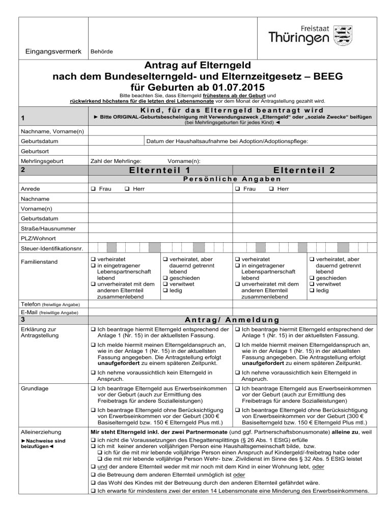 Eingangsvermerk Behörde Antrag auf Elterngeld nach dem Bundeselterngeld- und Elternzeitgesetz – BEEG für Geburten ab 01.07.2015 Bitte beachten Sie, dass Elterngeld frühestens ab der Geburt und rückwirkend höchstens für die letzten drei Lebensmonate vor dem Monat der Antragstellung gezahlt wird. Kind, für das Elterngeld beantragt wird 1 ► Bitte ORIGINAL-Geburtsbescheinigung mit Verwendungszweck „Elterngeld“ oder „soziale Zwecke“ beifügen (bei Mehrlingsgeburten für jedes Kind) ◄ Nachname, Vorname(n) Geburtsdatum Datum der Haushaltsaufnahme bei Adoption/Adoptionspflege: Geburtsort Mehrlingsgeburt Zahl der Mehrlinge: Vorname(n): Elternteil 1 2 Elternteil 2 Persönliche Angaben Anrede Frau Herr Frau Herr Nachname Vorname(n) Geburtsdatum Straße/Hausnummer PLZ/Wohnort Steuer-Identifikationsnr. Familienstand verheiratet in eingetragener Lebenspartnerschaft lebend unverheiratet mit dem anderen Elternteil zusammenlebend verheiratet, aber dauernd getrennt lebend geschieden verwitwet ledig verheiratet in eingetragener Lebenspartnerschaft lebend unverheiratet mit dem anderen Elternteil zusammenlebend verheiratet, aber dauernd getrennt lebend geschieden verwitwet ledig Telefon (freiwllige Angabe) E-Mail (freiwillige Angabe) 3 Erklärung zur Antragstellung Grundlage Antrag/ Anmeldung Ich beantrage hiermit Elterngeld entsprechend der Anlage 1 (Nr. 15) in der aktuellsten Fassung. Ich beantrage hiermit Elterngeld entsprechend der Anlage 1 (Nr. 15) in der aktuellsten Fassung. Ich melde hiermit meinen Elterngeldanspruch an, wie in der Anlage 1 (Nr. 15) in der aktuellsten Fassung angegeben. Die Antragstellung erfolgt unaufgefordert zu einem späteren Zeitpunkt. Ich melde hiermit meinen Elterngeldanspruch an, wie in der Anlage 1 (Nr. 15) in der aktuellsten Fassung angegeben. Die Antragstellung erfolgt unaufgefordert zu einem späteren Zeitpunkt. Ich nehme voraussichtlich kein Elterngeld in Anspruch. Ich nehme voraussichtlich kein Elterngeld in Anspruch. Ich beantrage Elterngeld aus Erwerbseinkommen vor der Geburt (auch zur Ermittlung des Freibetrags für andere Sozialleistungen) Ich beantrage Elterngeld aus Erwerbseinkommen vor der Geburt (auch zur Ermittlung des Freibetrags für andere Sozialleistungen) Ich beantrage Elterngeld ohne Berücksichtigung von Erwerbseinkommen vor der Geburt (300 € Basiselterngeld bzw. 150 € Elterngeld Plus mtl.) Ich beantrage Elterngeld ohne Berücksichtigung von Erwerbseinkommen vor der Geburt (300 € Basiselterngeld bzw. 150 € Elterngeld Plus mtl.) Alleinerziehung Mir steht Elterngeld inkl. der zwei Partnermonate (und ggf. Partnerschaftsbonusmonate) alleine zu, weil ►Nachweise sind beizufügen◄ ich nicht die Voraussetzungen des Ehegattensplittings (§ 26 Abs. 1 EStG) erfülle ich mit keiner anderen volljährigen Person eine Haushaltsgemeinschaft bilde, bzw. ich für die mit mir lebende volljährige Person einen Anspruch auf Kindergeld/-freibetrag habe oder die mit mir lebende volljährige Person Wehr- bzw. Zivildienst im Sinne des § 32 Abs. 5 EStG leistet und der andere Elternteil weder mit mir noch mit dem Kind in einer Wohnung lebt, oder die Betreuung dem anderen Elternteil unmöglich ist oder das Wohl des Kindes mit der Betreuung durch den anderen Elternteil gefährdet wäre. Ich erwarte für mindestens zwei der ersten 14 Lebensmonate eine Minderung des Erwerbseinkommens. Elternteil 1 4 in Deutschland seit Wohnsitz / gewöhnlicher Aufenthalt Staatsangehörigkeit Elternteil 2 Wohnsitz / gew öhnlicher Aufenthalt / Staatsangehörigkeit in Deutschland seit ___________ ___________ (Tag/Monat/Jahr) (Tag/Monat/Jahr) ► Spätaussiedler: Vertriebenenausweis/Bescheinigung nach § 15 BVFG stets beifügen; sofern noch nicht ausgestellt: Registrierschein oder Aufnahmebescheid◄ im Ausland seit _________ bis ___________ Grund (z. B. Entsendung): _______________ im Ausland seit ______________, ich stehe jedoch in einem inländischen Arbeitsverhältnis deutsch EU-/EWR-Staat/Schweiz: _______________________ (bitte hier eintragen) im Ausland seit _________ bis ___________ Grund (z. B. Entsendung): _______________ im Ausland seit ______________, ich stehe jedoch in einem inländischen Arbeitsverhältnis deutsch EU-/EWR-Staat/Schweiz: _______________________ (bitte hier eintragen) andere: ________________ andere: ________________ ► EU-EWR-Staat/Schweiz: Nachweis des inländischen Wohnsitzes/gewöhnlichen Aufenthaltes ist erforderlich (z. B. Bescheinigung über die Freizügigkeit für EU-Staatsangehörige – § 5 FreizügG/EU –, EG-Ausweis oder Meldebescheinigung)◄ ► andere Staatsangehörige: Passkopie (einschl. Aufenthaltstitel) bzw. Bescheinigung der Ausländerbehörde (siehe Anlage 5) ist immer erforderlich◄ Ausländisches Arbeitsverhältnis vor/nach Geburt des Kindes nein ja, selbst ja, der andere Elternteil Beschäftigungsland _________________________ nein ja, selbst ja, der andere Elternteil Beschäftigungsland __________________________ ausländische Familienleistung wird gewährt ja, ► bitte Nachweis beifügen◄ nein ausländische Familienleistung wird gewährt ja, ► bitte Nachweis beifügen◄ nein 5 Kindschaftsverhältnis zum Antragsteller leibliches Kind/Adoptivkind leibliches Kind/Adoptivkind ► Bei einem Adoptivkind bitte die Meldebescheinigung beifügen ◄ in Adoptionspflege Kindschaftsverhältnis 6 Das Kind lebt mit mir in einem Haushalt und wird von mir selbst betreut und erzogen ► Bestätigung des Jugendamtes/der Adoptionsvermittlungsstelle bitte beifügen ◄ nicht sorgeberechtigter Elternteil sonstiges Kindschaftsverhältnis: nicht sorgeberechtigter Elternteil sonstiges Kindschaftsverhältnis: ______________________ ______________________ (z. B. Kind des Ehe-/Lebenspartners, Enkelkind) ► Meldebescheinigung für das Kind sowie Heirats- bzw. Lebenspartnerschaftsurkunde bitte beifügen ◄ (z. B. Kind des Ehe-/Lebenspartners, Enkelkind) ► Meldebescheinigung für das Kind sowie Heirats- bzw. Lebenspartnerschaftsurkund