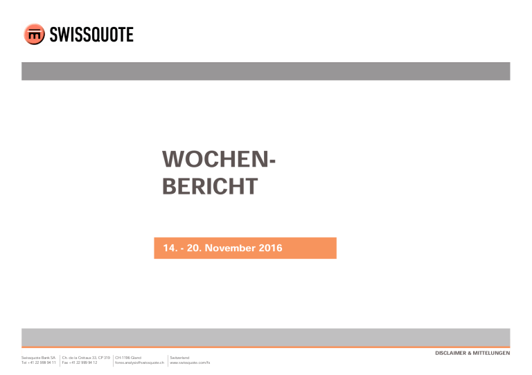 WOCHENBERICHT 14. - 20. November 2016 Swissquote Bank SA Tel +41 22 999 94 11 Ch. de la Crétaux 33, CP 319 Fax +41 22 999 94 12 CH-1196 Gland [email protected] Switzerland www.swissquote.com/fx DISCLAIMER & MITTELUNGEN WOCHENBERICHT 14. - 20. November 2016 WOCHENBERICHT - Ein Überblick p3 p4 p5 p6 p7 Swissquote Bank SA Tel +41 22 999 94 11 Ch. de la Crétaux 33, CP 319 Fax +41 22 999 94 12 Wirtschaft Wirtschaft Wirtschaft Wirtschaft Disclaimer CH-1196 Gland [email protected] Switzerland www.swissquote.com/fx Verkauf von Anleihen nach Trump-Sieg - Peter Rosenstreich Folgen der US-Wahl 2016 für Chinas Handelspartner - Arnaud Masset Märkte nach Trumps Wahl endlich bullisch - Yann Quelenn China: Exporte stolpern trotz schwächerem Yuan - Yann Quelenn Page 2 | 7 WOCHENBERICHT 14. - 20. November 2016 Wirtschaft Verkauf von Anleihen nach Trump-Sieg Der Verkaufsdruck auf die festverzinslichen Papiere steigt weiter, da der designierte Präsident eine deutliche Steuerexpansion vorschlägt. Die Staatsanleihen mussten Rückschläge hinnehmen, denn die Renditen der zehnjährigen Papiere stiegen auf 2,092% und die der dreißigjährigen US-Anleihen stiegen auf 2,887%. Der designierte Präsident Trump hat während seiner Kampagne nur sehr oberflächliche Angaben zu seiner Politik gemacht. Aber bei seiner Antrittsrede versicherte er, dass es wohl massive Infrastrukturausgaben in Höhe von +600 Mrd. USD geben werde. "Wir werden unsere Städte restaurieren und unsere Highways, Brücken, Tunnel, Flughäfen, Schulen, Krankenhäuser neu bauen", so Trump. Solange nichts Näheres bekannt ist, z. B. was die Finanzierung angeht, warum sollte Trump nicht den schnellen Erfolg über finanzpolitische Anreize für eine unterdurchschnittlich wachsende Wirtschaft in einem zyklischen Abschwung suchen? Selbst die steuerlich konservativen Republikaner zeigen sich erschöpft von den Ausgabenbeschränkungen. Es ist unwahrscheinlich, dass Trump auf großen Widerstand treffen wird, vor allem wenn man die Verhältnisse im Repräsentantenhaus und im Senat berücksichtigt, wo die Republikaner die Mehrheit haben und der gleichen Meinung sind wie Trump. Diese neue "Trumpflation" führt zu Druck auf die Renditen, die bereits unter einem straffen Arbeitsmarkt leiden, und die steigende Inflation belastet die Löhne. Die Spekulationen nehmen zu, dass die Fed die Zinsen im Dezember um 25 Basispunkte anheben wird, und dann noch zwei- oder dreimal im Jahr 2017. Die langfristigen Inflationserwartungen steigen und somit auch die Renditen der USAnleihen. Damit sollten die größer werdenden US-Spreaddifferentiale gegenüber den EM-Währungen mit hohen Renditen unter weiteren Verkaufsdruck geraten. Swissquote Bank SA Tel +41 22 999 94 11 Ch. de la Crétaux 33, CP 319 Fax +41 22 999 94 12 CH-1196 Gland [email protected] Switzerland www.swissquote.com/fx Kurzfristig gehen wir von einer anhaltenden USD-Stärke aus, die sich am besten über die Long-Positionen im USD/JPY zeigt. Auch der AUD/USD bleibt als Vertretungstrade für die schwachen asiatischen EM-Währungen anfällig (vor allem wenn nach und nach weitere Details zur Trump-Politik bekannt werden). Mittelfristig zweifeln wir jedoch, wie viel Inflation eine Steuerexpansion in der USWirtschaft erzeugen kann. Trumps Infrastrukturplan sollte das BIP um 0,2% steigen lassen, aber ein stärkerer USD und niedrige Energiekosten begrenzen die Preise nach oben. Zudem wird die USA weiter Deflation importieren, da sich das externe Nachfrageumfeld schwer tut. Für uns ist es wahrscheinlicher, dass die Fed die Zinsen bis Ende 2017 einmal um 25 Bp anhebt. Page 3|7 WOCHENBERICHT 14. - 20. November 2016 Wirtschaft Folgen der US-Wahl 2016 für Chinas Handelspartner Der australische und neuseeländische Dollar und der Koreanische Won haben die Last eines Abverkaufs an den Finanzmärkten nach der Wahl von Donald Trump als 45. Präsident der Vereinigten Staaten getragen. Der nächste US-Präsident hat versprochen, dass er Zölle von 45% auf chinesische Güter unterstützen will, um die Handelsbilanz auszugleichen. Eine solche starke Maßnahme würde eine negative Auswirkung auf das globale Wachstum haben und insbesondere Chinas wirtschaftliche Verlangsamung verstärken. Auch wenn China von einem alleine durch Exporte generierten Wachstum auf ein im Inland generiertes Wachstum übergeht, bleibt die zweitgrößte Volkswirtschaft der Welt immer noch stark exportabhängig. Daher ist es wahrscheinlich, dass schwächere Aussichten für China schlechte Nachrichten für Länder wie Südkorea, Neuseeland oder Australien, die stark auf die chinesische Nachfrage empfindlich sind, bedeuten werden. Mehr als 30% der südkoreanischen Exporte gehen nach China, während 32% der australischen Exporte nach China geschickt werden. Für Neuseeland ist das Bild ein wenig anders, da das Land eine negative Handelsbilanz mit China hat, was bedeutet, dass es mehr importiert als exportiert. Allerdings ist die Wirtschaft von Neuseeland stark vom internationalen Handel abhängig und vor allem der Nachfrage aus Australien und China, den beiden größten Handelspartnern, ausgesetzt. makroprudenziellen Maßnahmen weiter zu verbessern, um den Inflationsdruck auf dem Wohnungsmarkt zu verringern. Es wird Gouverneur Wheeler eine weitere Lockerung erlauben, ohne die Immobilienblase zu nähren. Der Kiwi zeigte letzte Woche die schlechteste Leistungen unter den G10-Währungen; er ist auf $0,7180 gerutscht, nachdem er unmittelbar nach der US-Wahl bei $0,74 gelegen hatte. Trotz eines soliden Jahrs auf der Wachstumsseite glauben wir, dass die Zentralbank nicht untätig an der Inflationsfront sein darf: die Binneninflation, die im dritten Quartal im Vergleich zum vorherigen stagnierte, während die Inflation im Jahresvergleich um 2,1% fiel. Der getrimmte Mittelwert für die Inflation stieg um 0,8% im Jahresvergleich im September-Quartal. Die RBNZ hat keine weiteren Leitzinssenkung signalisiert, aber hat die Anleger gewarnt, dass es moglich ist, wenn