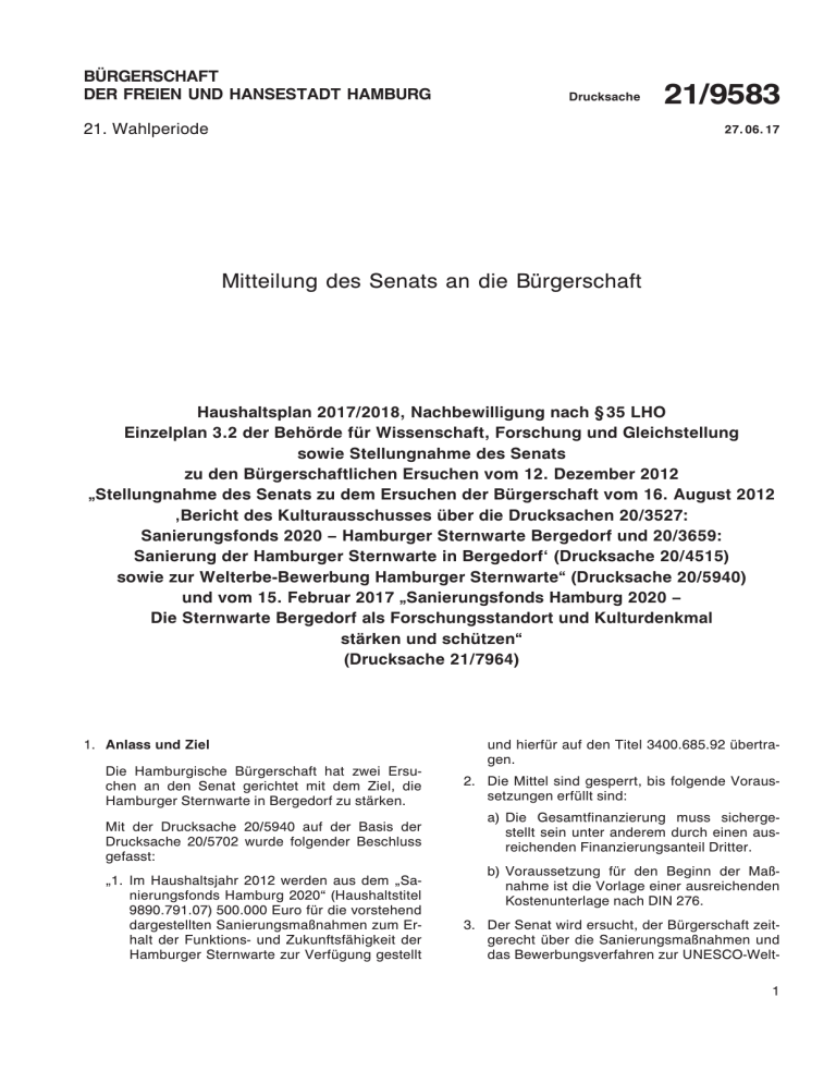 BÜRGERSCHAFT DER FREIEN UND HANSESTADT HAMBURG Drucksache 21. Wahlperiode 21/9583 27. 06. 17 Mitteilung des Senats an die Bürgerschaft Haushaltsplan 2017/2018, Nachbewilligung nach § 35 LHO Einzelplan 3.2 der Behörde für Wissenschaft, Forschung und Gleichstellung sowie Stellungnahme des Senats zu den Bürgerschaftlichen Ersuchen vom 12. Dezember 2012 „Stellungnahme des Senats zu dem Ersuchen der Bürgerschaft vom 16. August 2012 ‚Bericht des Kulturausschusses über die Drucksachen 20/3527: Sanierungsfonds 2020 – Hamburger Sternwarte Bergedorf und 20/3659: Sanierung der Hamburger Sternwarte in Bergedorf‘ (Drucksache 20/4515) sowie zur Welterbe-Bewerbung Hamburger Sternwarte“ (Drucksache 20/5940) und vom 15. Februar 2017 „Sanierungsfonds Hamburg 2020 – Die Sternwarte Bergedorf als Forschungsstandort und Kulturdenkmal stärken und schützen“ (Drucksache 21/7964) 1. Anlass und Ziel Die Hamburgische Bürgerschaft hat zwei Ersuchen an den Senat gerichtet mit dem Ziel, die Hamburger Sternwarte in Bergedorf zu stärken. Mit der Drucksache 20/5940 auf der Basis der Drucksache 20/5702 wurde folgender Beschluss gefasst: „1.Im Haushaltsjahr 2012 werden aus dem „Sanierungsfonds Hamburg 2020“ (Haushaltstitel 9890.791.07) 500.000 Euro für die vorstehend dargestellten Sanierungsmaßnahmen zum Erhalt der Funktions- und Zukunftsfähigkeit der Hamburger Sternwarte zur Verfügung gestellt und hierfür auf den Titel 3400.685.92 übertragen. 2. Die Mittel sind gesperrt, bis folgende Voraussetzungen erfüllt sind: a)Die Gesamtfinanzierung muss sichergestellt sein unter anderem durch einen ausreichenden Finanzierungsanteil Dritter. b)Voraussetzung für den Beginn der Maßnahme ist die Vorlage einer ausreichenden Kostenunterlage nach DIN 276. 3. Der Senat wird ersucht, der Bürgerschaft zeitgerecht über die Sanierungsmaßnahmen und das Bewerbungsverfahren zur UNESCO-Welt1 Drucksache 21/9583 Bürgerschaft der Freien und Hansestadt Hamburg – 21. Wahlperiode kulturerbeliste der Hamburger Sternwarte zu berichten.“ Mit der Drucksache 21/7964 ersucht die Bürgerschaft den Senat „1. die vorbereitenden Maßnahmen zur Sanierung der Sternwarte Bergedorf weiter voranzutreiben, mit dem Ziel, spätestens im 4. Quartal 2017 mit den Sanierungsarbeiten beginnen zu können, und 2. der Bürgerschaft bis Ende 2017 über den Fortgang der Sanierungsmaßnahmen zu berichten.“ Mit dieser Mitteilung des Senats wird die Bürgerschaft – über die Umsetzung der Ersuchen und – über das Ergebnis der Entwurfsplanung und der Kostenberechnung informiert, sowie – um Nachbewilligung nach § 35 LHO zur Anpassung des Haushaltsplanes 2017/2018 gebeten, – um die Aufhebung der Sperre nach § 38 LHO für die Ermächtigungen aus der „Zentralen Sanierungsreserve Hamburg“ des Aufgabenbereiches 283 des Einzelplans 9.2 gebeten und – um Zustimmung zur Sollübertragung aus der „Zentralen Investitionsreserve“ des Aufgabenbereichs 283 des Einzelplans 9.2 an den Aufgabenbereich 246 des Einzelplans 3.2 gebeten. 2.Stand der Welterbe-Bewerbung Hamburger Sternwarte Da die Kultusministerkonferenz 2014 die Hamburger Sternwarte nicht in die bis mindestens 2024 gültige deutsche Tentativliste aufgenommen hat, ist eine Welterbe-Bewerbung der Hamburger Sternwarte von deutscher Seite aus auf absehbare Zeit leider nicht möglich, wird aber als mittel- bis langfristiges Ziel von Hamburg weiterverfolgt (siehe dazu die Ausführungen in den Drucksachen 21/8593 sowie 21/8774). 3. Gegenstand der Planung Das Gebäude am Gojenbergsweg 112, in dem der Große Refraktor steht, wurde als Teil der Hamburger Sternwarte Bergedorf 1908/09 erbaut und wird heute von der Astrophysik der Universität Hamburg im Wesentlichen zu Demonstrationszwecken genutzt. Es verfügt über rd. 342 m² Nutzfläche (NF 1–6 gem. DIN 277). Das Gebäude ist in zwei miteinander verbundene Baukörper unterteilt. Dem runden Baukörper ist ein eingeschossiger, rechteckiger Baukörper vorgelagert in dem u.a. Büros untergebracht sind. In dem Rundbau ist der Refraktor fest 2 installiert. Das Dach besteht aus einer drehbaren Stahlkuppel mit Spaltenschieber, das zu Beobachtungszwecken geöffnet werden kann. Zwecks leichterer Bedienung des Refraktors ist der Rundbau mit einer Hebebühne im Durchmesser der Kuppel und einem Hub von 4,5 m ausgestattet. Beide Gebäudeteile sind durch eine „Schleuse“ getrennt, weil im Kuppelraum für Sichtungen zwingend die gleichen Temperaturen wie im Außen­ bereich herrschen müssen. Beide Gebäudeteile weisen beträchtliche Schäden an der Bausubstanz auf, die den Bestand des ­Gebäudes gefährden. Die 1908 errichtete Kuppel ist undicht und hat starke Korrosionsschäden, tragende Teile der Konstruktionen sind schadhaft, das Untergeschoss ist massiv durchfeuchtet. Das Gebäude hat im Zweiten Weltkrieg einen Bombenschaden erlitten, die Kuppel mit Antrieben wurde mehrfach modifiziert. Um den Erhalt des Gebäudes als bedeutendes Kulturdenkmal zu gewährleisten und seine Funk­ tionsfähigkeit wieder herzustellen, ist dringend eine umfassende Sanierung erforderlich. Die Herrichtung soll denkmalgerecht erfolgen und den Großen Refraktor auch für die Öffentlichkeit möglichst barrierefrei zugänglich machen. Für die Trockenlegung des Gebäudes ist es notwendig, eine Drainage anzulegen und das Fundament sowie die Außenwände im unteren Bereich zu isolieren. Ölhaltige Farbe ist zu entfernen, weil der Anstrich der Fassade schadet. Außerdem soll die bauzeitliche Farbgebung wieder hergestellt werden. Sämtliche Fenster und Türen sind zu erneuern. Die Elektroinstallation entspricht nicht mehr den geltenden Vorschriften und dem Stand der Technik. Sie ist vollständig zu erneuern und zu modernisieren. Dabei sollen die vorhandenen Komponenten museal aufgearbeitet werden. Außerdem sind für die Beschäftigten sowie Besucherinnen und Besucher Rettungswege zu schaffen, um eine Flucht im Brandfall zu ermöglichen. Um bei diesen Baumaßnah