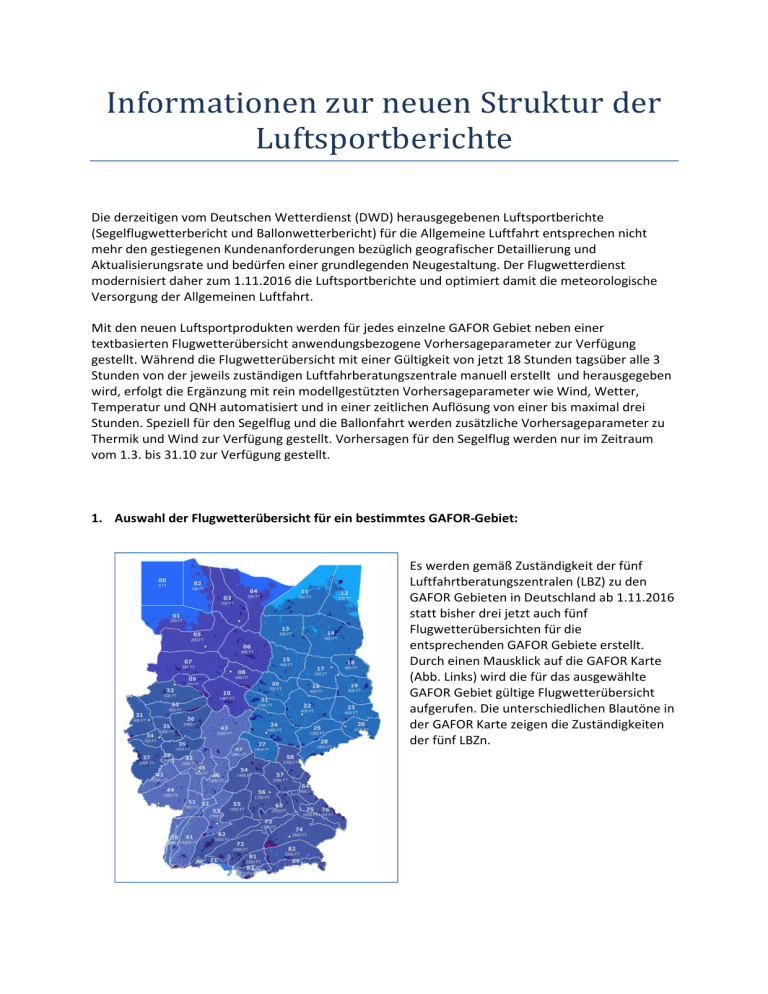 InformationenzurneuenStrukturder Luftsportberichte Die derzeitigen vom Deutschen Wetterdienst (DWD) herausgegebenen Luftsportberichte (Segelflugwetterbericht und Ballonwetterbericht) für die Allgemeine Luftfahrt entsprechen nicht mehr den gestiegenen Kundenanforderungen bezüglich geografischer Detaillierung und Aktualisierungsrate und bedürfen einer grundlegenden Neugestaltung. Der Flugwetterdienst modernisiert daher zum 1.11.2016 die Luftsportberichte und optimiert damit die meteorologische Versorgung der Allgemeinen Luftfahrt. Mit den neuen Luftsportprodukten werden für jedes einzelne GAFOR Gebiet neben einer textbasierten Flugwetterübersicht anwendungsbezogene Vorhersageparameter zur Verfügung gestellt. Während die Flugwetterübersicht mit einer Gültigkeit von jetzt 18 Stunden tagsüber alle 3 Stunden von der jeweils zuständigen Luftfahrberatungszentrale manuell erstellt und herausgegeben wird, erfolgt die Ergänzung mit rein modellgestützten Vorhersageparameter wie Wind, Wetter, Temperatur und QNH automatisiert und in einer zeitlichen Auflösung von einer bis maximal drei Stunden. Speziell für den Segelflug und die Ballonfahrt werden zusätzliche Vorhersageparameter zu Thermik und Wind zur Verfügung gestellt. Vorhersagen für den Segelflug werden nur im Zeitraum vom 1.3. bis 31.10 zur Verfügung gestellt. 1. Auswahl der Flugwetterübersicht für ein bestimmtes GAFOR-Gebiet: Es werden gemäß Zuständigkeit der fünf Luftfahrtberatungszentralen (LBZ) zu den GAFOR Gebieten in Deutschland ab 1.11.2016 statt bisher drei jetzt auch fünf Flugwetterübersichten für die entsprechenden GAFOR Gebiete erstellt. Durch einen Mausklick auf die GAFOR Karte (Abb. Links) wird die für das ausgewählte GAFOR Gebiet gültige Flugwetterübersicht aufgerufen. Die unterschiedlichen Blautöne in der GAFOR Karte zeigen die Zuständigkeiten der fünf LBZn. An der inhaltlichen Struktur der Flugwetterübersicht ändert sich nur wenig. Die Sicht wird nicht mehr im Abschnitt Wettergeschehen, sondern unter einem separaten Abschnitt, aufgeführt. Hinzu kommen die Abschnitte: • Hinweise für Hubschrauberflüge • Hinweise für Ballonfahrer und • Hinweise für Segelflieger Zum Zwecke der Planung und einer optimalen Versorgung werden die Gültigkeitszeiträume auf 18 Stunden verlängert. Zusätzlich wird am Spätnachmittag ein Bericht herausgegeben, der in der ersten Nachthälfte nochmals aktualisiert wird. 2. Auswahl der Gebietsvorhersage für ein bestimmtes GAFOR-Gebiet Aus einer GAFOR-Karte (Abb. links) wird das jeweilige GAFOR-Gebiet durch Klicken ausgewählt. Danach erscheinen die für die jeweilige Kundengruppe relevanten flugmeteorologischen Informationen in tabellarischer Form. Die Vorhersageparameter beziehen sich auf einen für das GAFOR Gebiet repräsentativen Standort. Da die Größe der GAFOR-Gebiete stark variiert, wird für das Frühjahr 2017 eine Erweiterung der Vorhersagestationen pro GAFOR-Gebiet angestrebt. Die erweiterten Flugwetterübersichten in Verbindung mit den automatisierten GAFOR-Gebietebezogenen Vorhersagen ersetzen somit die bisherigen Ballon- und Segelflugwetterberichte. Auf Grund der frühen Erstausgabe und der 3-stündigen Aktualisierung entfallen auch die Ballon-Ticker. Nachfolgend sollen zwei Beispiele für die Ballonfahrer bzw. Segelflieger die Visualisierung der Gebietsvorhersagen zeigen. Beispiel 1: Gebietsvorhersage für Ballonfahrer für das GAFOR Gebiet 11 Die Windgeschwindigkeit wird dabei nach folgenden Kriterien farblich unterlegt: Bedingungen zum Ballonfahren Günstig Fraglich Mittelwind <= 4 Knoten 5 bis 7 Knoten Böen <= 9 Knoten 10 bis 12 Knoten Ungünstig >= 8 Knoten >= 13 Knoten Beispiel 2: Gebietsvorhersage für Segelflieger für das GAFOR Gebiet 11 Thermikgüte und PFD gesamt werden nach folgenden Kriterien farblich unterlegt: Thermikgüte (mittl. Steigen) PFD 2 Stunden PFD gesamt sehr gut (> 2,5 m/s) gut ( >1,5 - 2,5 m/s) ≥ 100 km 67 - 100 km > 600 km 400 - < 600 km mäßig (> 0,5 - 1,5 m/s) 34 - 66 km 200 - < 400 km gering (< 0,5 m/s) 9 - 33 km 50 - < 200 km < 9 km < 50 km Diese Vorhersagen werden nur vom 1.3. bis 31.10. zur Verfügung gestellt. Die Luftsportberichte im DWD Internet werden ersetzt durch die neuen Flugwetterübersichten und eine allgemeine für alle Kunden der Allgemeinen Luftfahrt gültige Gebietsvorhersage für alle GAFOR Gebiete. Beispiel für Gebietsvorhersage für das GAFOR Gebiet 11 im DWD Internet Kontakt Deutscher Wetterdienst, Abteilung Flugmeteorologie, Frankfurter Str. 135, 63067 Offenbach Anregungen und Fragen bitten an: Per E-Mail: [email protected] (Wir helfen Ihnen per E-Mail auf schnellstem Weg weiter.) Per Telefon: +49 (0)69 8062 2695 (Sie erreichen diese Telefonnummer während der normalen Bürodienstzeiten.) Per Telefax: +49 (0)69 8062 11925 oder +49 (0)69 8062 2014 Stand: September 2016