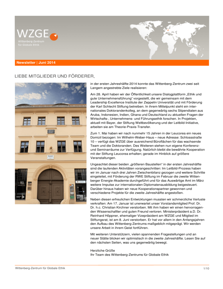 Wittenberg - Zentrum für Globale Ethik Newsletter | Juni 2014 LIEBE MITGLIEDER UND FÖRDERER, in der ersten Jahreshälfte 2014 konnte das Wittenberg-Zentrum zwei seit Langem angestrebte Ziele realisieren: Am 28. April haben wir der Öffentlichkeit unsere Dialogplattform „Ethik und gute Unternehmensführung“ vorgestellt, die wir gemeinsam mit dem Leadership Excellence Institute der Zeppelin Universität und mit Förderung der Karl Schlecht Stiftung betreiben. In ihrem Mittelpunkt steht ein internationales Doktorandenkolleg, an dem gegenwärtig sechs Stipendiaten aus Aruba, Indonesien, Indien, Ghana und Deutschland zu aktuellen Fragen der Wirtschafts-, Unternehmens- und Führungsethik forschen. In Projekten, aktuell mit Bayer, der Stiftung Weltbevölkerung und der Leitbild-Initiative, arbeiten sie am Theorie-Praxis-Transfer. Zum 1. Mai haben wir nach nunmehr 15 Jahren in der Leucorea ein neues Domizil bezogen: Im Wilhelm-Weber-Haus – neue Adresse: Schlossstraße 10 – verfügt das WZGE über ausreichend Büroflächen für das wachsende Team und die Doktoranden. Des Weiteren stehen nun eigene Konferenzund Seminarräume zur Verfügung. Natürlich bleibt die bewährte Kooperation mit der Stiftung Leucorea erhalten; gerade im Hinblick auf größere Veranstaltungen. Ungeachtet dieser beiden „größeren Baustellen“ in der ersten Jahreshälfte sind die laufenden Aktivitäten vorangeschritten: Im Leitbild-Prozess haben wir im Januar nach drei Jahren Zwischenbilanz gezogen und weitere Schritte eingeleitet, mit Förderung der RWE Stiftung im Februar die zweite Wittenberger Energie-Akademie durchgeführt und für das Auswärtige Amt im März weitere Impulse zur internationalen Diplomatenausbildung beigesteuert. Darüber hinaus haben wir neue Kooperationspartner gewonnen und verschiedene Projekte für die zweite Jahreshälfte angestoßen. Neben diesen erfreulichen Entwicklungen mussten wir schmerzliche Verluste verkraften: Am 17. Januar ist unerwartet unser Vorstandsmitglied Prof. Dr. Dr. h.c. Christian Kirchner verstorben. Mit ihm haben wir einen hervorragenden Wissenschaftler und guten Freund verloren. Ministerpräsident a.D. Dr. Reinhard Höppner, ehemaliger Vizepräsident am WZGE und Mitglied im Stiftungsrat, ist am 8. Juni verstorben. Er hat vor allem in den Anfangsjahren den Aufbau des Wittenberg-Zentrums maßgeblich mitgeprägt. Wir werden unsere Arbeit in ihrem Geist fortführen. Mit weiteren Unterstützern, vielen spannenden Fragestellungen und an neuer Stätte blicken wir optimistisch in die zweite Jahreshälfte. Lesen Sie auf den nächsten Seiten, was uns gegenwärtig bewegt. Herzliche Grüße Ihr Team des Wittenberg-Zentrums für Globale Ethik Wittenberg-Zentrum für Globale Ethik 1/10 Newsletter | Juni| 2014 WZGE intern Dezember 2011 EINBLICK 1/2007 Marktwirtschaft und Unternehmensverantwortung Dialog Leitbild-Initiative der deutschen Wirtschaft Auch im ersten Halbjahr 2014 hat das Leitbild neue Unterstützer gewonnen: Für die RWE AG hat Peter Terium als Vorstandsvorsitzender mit seiner Unterschrift das Bekenntnis des Konzerns zur Initiative bestätigt. Für die BDA unterzeichnete Ingo Kramer in Nachfolge von Prof. Dieter Hundt das Leitbild. Parallel wächst das Interesse mittelständischer Unternehmen; verschiedene Gespräche laufen gegenwärtig. Das Arbeitskreistreffen im Januar stand im Zeichen von Evaluation und künftiger Ausrichtung des Leitbild-Prozesses. Dabei fiel die Zwischenbilanz positiv aus: Seit dem Start der Initiative Ende 2010 hat sich die Zahl der Unterzeichner von einst 19 auf nunmehr 53 Unternehmen und Organisationen fast verdreifacht. In zwölf internen Workshops und mit dem Wittenberger Führungskolloquium konnten wichtige Schritte zur Umsetzung des Leitbilds auf Unternehmensebene eingeleitet werden. Auf Branchenebene erfolgte ein enger Austausch mit der Chemieindustrie im Hinblick auf ihren Wittenberg-Prozess und die Initiative „Chemie hoch drei“; im Finanzsektor haben sich fünf führende Kreditinstitute auf Prinzipien einer ethischen Fundierung ihrer Management-Vergütungssysteme verständigt. Nach außen erfolgte der Dialog mit der EU-Kommission, vier Bundesministerien, dem Bundespräsidialamt, den großen Volksparteien, den christlichen Kirchen sowie zahlreichen gesellschaftlichen Organisationen. Das WZGE selbst hat in mehr als 50 Veranstaltungen über das Leitbild informiert und mit gesellschaftlichen Gruppen diskutiert. Im wissenschaftlichen Bereich wurden verschiedene Forschungsprojekte und Diskussionen begleitet. Und nicht zuletzt hat der Leitbild-Prozess als praktisches Beispiel ethischer Theorie auch die Einrichtung des internationalen Doktorandenkollegs am WZGE durch die Karl Schlecht Stiftung und des Stiftungslehrstuhls für Unternehmensethik und Controlling durch die Friede Springer Stiftung mitinspiriert. Für ihre künftige Arbeit setzt die Initiative folgende Prioritäten: In den Reihen der Wirtschaft will sie weitere Unterstützer für das Leitbild gewinnen, gerade auch im Mittelstand. Daneben gilt es, die mit dem Führungskolloquium eingeleitete Vorbereitung künftiger Entscheider auf ihre gesellschaftliche Verantwortung weiter auszubauen. Auch in der Gesellschaft muss das Leitbild größere Verbreitung finden. Dazu bedarf es immer wieder auch des sichtbaren Engagements der Unterzeichner für das Leitbild, wie zuletzt etwa durch Johannes Teyssen auf der E.ON-Hauptversammlung. Im Dialog mit gesellschaftlichen Akteuren gilt es, neben den Inhalten auch die ethisch legitimen Grenzen unternehmerischer Verantwortung herauszuarbeiten. Hier befasst sich die Initiative gegenwärtig in verschiedenen Projekten mit der Frage, wie Unternehmen bei der Beschaffung von Ressourcen, insbesondere im Hinblick auf Konfliktrohstoffe, verantwortlich handeln können. Schließlich gilt es auch, den internationalen Dialog zur Leitbild-Idee voranzutreiben. Mit dem Workshop in Uganda im letzten Jahr wurde hier bereits ein erster Schritt getan; Gespräche mit 