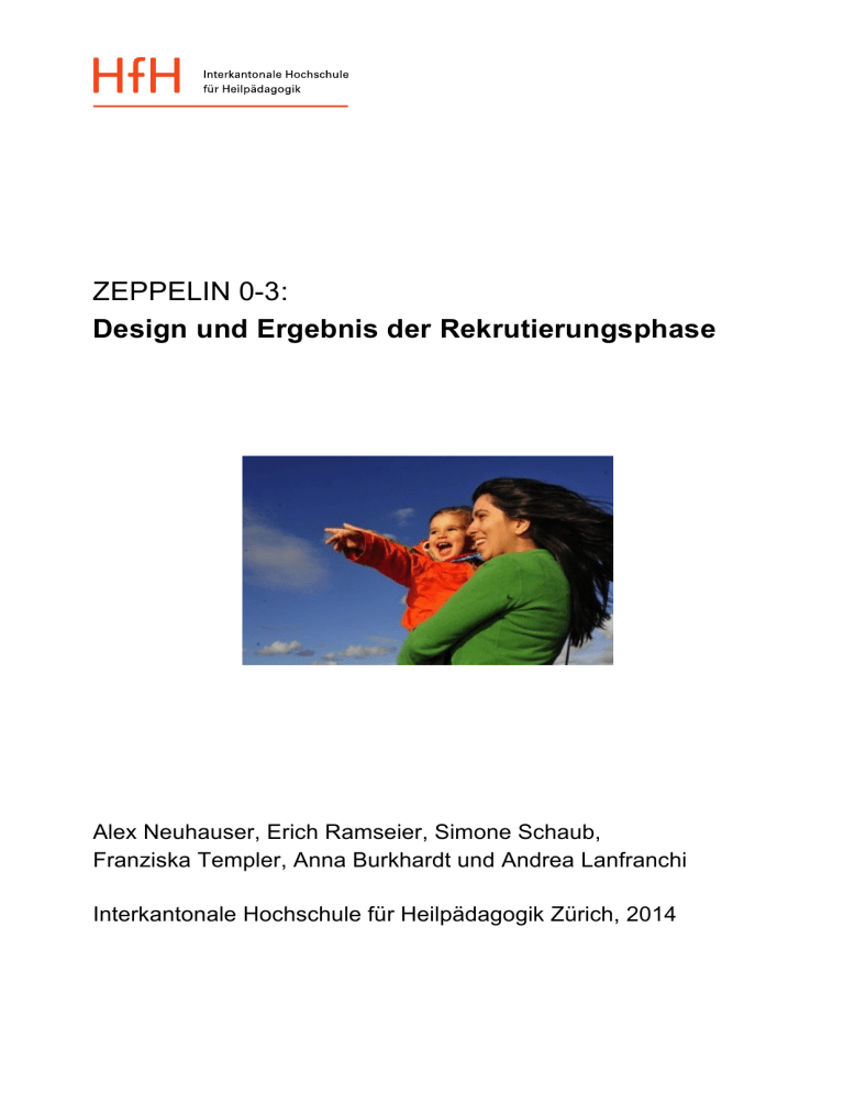 ZEPPELIN 0-3: Design und Ergebnis der Rekrutierungsphase Alex Neuhauser, Erich Ramseier, Simone Schaub, Franziska Templer, Anna Burkhardt und Andrea Lanfranchi Interkantonale Hochschule für Heilpädagogik Zürich, 2014 ZEPPELIN 0-3: Design und Ergebnis der Rekrutierungsphase Impressum Herausgeber & Bezugsadressen: Interkantonale Hochschule für Heilpädagogik Forschung & Entwicklung Schaffhauserstrasse 239, Postfach 5850 CH-8050 Zürich Telefon: +41 (0)44 317 12 35 [email protected] www.hfh.ch Ausgabe: 31. März 2014 Zitationsvorschlag: Neuhauser, A., Ramseier, E, Schaub, S., Templer, F., Burkhardt, A., & Lanfranchi, A. (2014). ZEPPELIN 0-3: Design und Ergebnis der Rekrutierungsphase. Arbeitspapier Nr. 6 der Interkantonalen Hochschule für Heilpädagogik (HfH). ZEPPELIN 0-3: Design und Ergebnis der Rekrutierungsphase 1 Einleitung 2 2 Projektorganisation 2.1 Intervention 2.2 Forschung 3 3 3 3 Forschungsdesign und Methoden 3.1 Definition der Population und Gesamtstichprobe 3.2 Projektstandorte 3.3 Messzeitpunkte und angestrebte Stichprobengrösse. 3.4 Intervention: PAT – Mit Eltern Lernen 3.5 Rahmenmodell und Forschungsfragen 3.6 Forschungsinstrumente und Zeitplan 3.7 Organisation des Forschungsvorgehens 4 4 4 5 6 7 10 15 4 Früherkennung und Rekrutierung der Zielgruppe 4.1 Screening zur Früherkennung von psychosozialen Risiken 4.2 Verfahren der Früherkennung und Rekrutierung 4.3 Ablauf der Früherkennung und Rekrutierung 4.4 Psychosoziale Belastung gemäss Heidelberger Belastungsskala 4.5 Diskussion 17 17 18 20 22 22 5 Verfahren der Zuordnung zur Interventions- bzw. Kontrollgruppe 5.1 Ausgangslage 5.2 Zweck und Aspekte der Randomisierung 5.3 Randomisierungsverfahren im Projekt ZEPPELIN 5.4 Ablauf der Randomisierung 5.5 Ergebnis der Randomisierung 5.6 Diskussion 24 24 24 25 26 26 28 6 Literatur 29 7 Anhang 32 ZEPPELIN 0-3: Design und Ergebnis der Rekrutierungsphase 1 ZEPPELIN 0-3: Design und Ergebnis der Rekrutierungsphase 1 Einleitung ZEPPELIN 0-3 ist eine Interventionsstudie zur interdisziplinären Früherkennung und frühen Förderung von Kindern, die aus psychosozialen Gründen in ihrer Entwicklung gefährdet sind. Ziel der Intervention ist die langfristig anhaltende Erhöhung der Bildungschancen dank Unterstützung der Eltern mittels Implementierung des Programms „PAT –Mit Eltern Lernen“ (PATNC, 2011): Zu PAT-Elterntrainerinnen ausgebildete Mütterberaterinnen unterstützen belastete Familien während der ersten drei Lebensjahre des Kindes zu Hause – im Durchschnitt 2 Mal pro Monat. Ergänzt werden die Hausbesuche durch monatlich stattfindende Gruppentreffen. Kurzfristig sollen so die elterlichen Erziehungskompetenzen gestärkt und die kontextuellen Entwicklungsbedingungen für das Kind verbessert werden. Die Forschung hat zum übergeordneten Ziel, die Wirksamkeit der frühen Förderung zu untersuchen. Dazu zählt 1) die Überprüfung der Früherkennung von Familien in psychosozialen Risikokonstellationen; 2) die Untersuchung der Partizipationsbereitschaft von psychosozial belasteten Familien an Massnahmen zur frühen Förderung ihrer Kinder; 3) die Prozess- und Wirksamkeitsevaluation während und unmittelbar nach der Programmdurchführung im Alter von 0-3 Jahren; 4) die Wirksamkeitsevaluation im Hinblick auf den Schulerfolg der Kinder. Übergeordnete Forschungsfrage ist, ob und allenfalls wie sich die Intervention auf die elterlichen Erziehungskompetenzen und die Entwicklung der Kinder auswirkt. Zu deren Beantwortung werden an drei Projektstandorten im Kanton Zürich 251 Familien über ein interdisziplinäres Netzwerk zur Früherkennung psychosozialer Risiken mittels Screeningverfahren erfasst und rekrutiert. Um die Wirkung der Intervention untersuchen zu können, werden die Familien nach einem Zufallsverfahren der Interventions- (IG) bzw. der Kontrollgruppe (KG) zugeordnet und es werden bei ihnen im Verlaufe der drei Jahre viermal Daten erhoben. In diesem Arbeitspapier werden zunächst die Projektorganisation (Kapitel 2) und anschliessend das Forschungsdesign und die Methoden (Kapitel 3), die Früherkennung und Rekrutierung (Kapitel 4) und das Randomisierungsverfahren (Kapitel 5) sowohl konzeptionell als auch empirisch beschrieben. Im Mittelpunkt stehen folgende Fragen: 1) Inwiefern wurde die Zielgruppe a) erkannt, b) erreicht und c) zur Projektteilnahme gewonnen? 2) Inwiefern gelang die Zufallsverteilung auf Interventions- und Kontrollgruppe? Abschliessend bleibt anzumerken, dass ein Teil der in ZEPPELIN 0-3 eingesetzten Interventions- und Forschungsmethoden zuvor in der Machbarkeitsstudie ZEPPELIN-M (Lanfranchi et al., 2011) erprobt wurden. In den nachfolgenden Ausführungen wird deshalb an verschiedenen Stellen auf die Machbarkeitsstudie Bezug genommen. 2 ZEPPELIN 0-3: Design und Ergebnis der Rekrutierungsphase 2 Projektorganisation ZEPPELIN 0-3 ist ein Gemeinschaftsprojekt der Hochschule für Heilpädagogik Zürich (HfH) und der Bildungsdirektion des Kantons Zürich, Amt für Jugend und Berufsberatung (AJB). Es wird von zahlreichen Stiftungen finanziert und vom Schweizerischen Nationalfonds gefördert (Zürcher Equity Präventionsprojekt Elternbeteiligung und Integration: NFP-Nr. 100013_134975/1). Nachfolgend werden die beteiligten Akteure in Intervention und Forschung beschrieben. 2.1 Intervention An den Projektstandorten Dietikon, Kloten und Dübendorf sind drei Teilprojektleiterinnen und insgesamt zwölf PAT-Elterntrainerinnen für die Früherkennung, Rekrutierung und Intervention verantwortlich. Diese Projekt-Teams sind vom AJB angestellt und nutzen dessen Infrastruktur am Projektstandort. Bei den PAT-Elterntrainerinnen handelt es sich um erfahrene Mütterberaterinnen, eine Familienberaterin sowie um eine Hebamme, die sich über eine fünftägige Weiterbildung zur PAT-Elterntrainerin qualifiziert haben und sich jährlich über Weiterbildungskurse neu rezertifizieren müssen. Falls erforderlich, werden sie bei fremdsprachigen Familien durch interkulturelle Übers