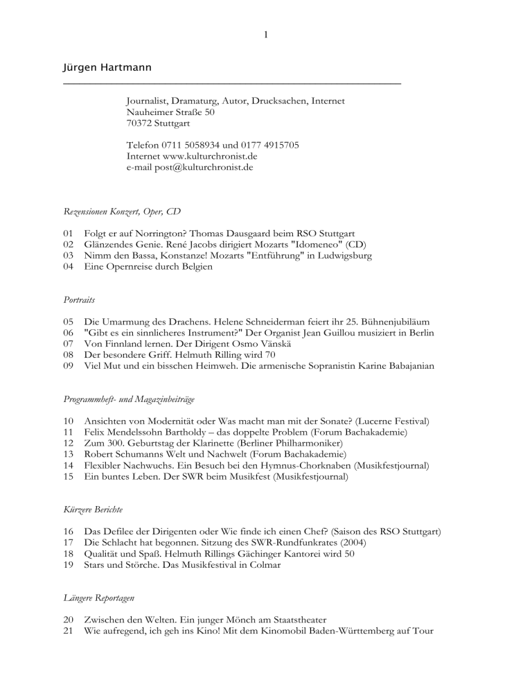 1 Jürgen Hartmann _______________________________________________________________ Journalist, Dramaturg, Autor, Drucksachen, Internet Nauheimer Straße 50 70372 Stuttgart Telefon 0711 5058934 und 0177 4915705 Internet www.kulturchronist.de e-mail [email protected] Rezensionen Konzert, Oper, CD 01 Folgt er auf Norrington? Thomas Dausgaard beim RSO Stuttgart 02 Glänzendes Genie. René Jacobs dirigiert Mozarts "Idomeneo" (CD) 03 Nimm den Bassa, Konstanze! Mozarts "Entführung" in Ludwigsburg 04 Eine Opernreise durch Belgien Portraits 05 Die Umarmung des Drachens. Helene Schneiderman feiert ihr 25. Bühnenjubiläum 06 "Gibt es ein sinnlicheres Instrument?" Der Organist Jean Guillou musiziert in Berlin 07 Von Finnland lernen. Der Dirigent Osmo Vänskä 08 Der besondere Griff. Helmuth Rilling wird 70 09 Viel Mut und ein bisschen Heimweh. Die armenische Sopranistin Karine Babajanian Programmheft- und Magazinbeiträge 10 Ansichten von Modernität oder Was macht man mit der Sonate? (Lucerne Festival) 11 Felix Mendelssohn Bartholdy – das doppelte Problem (Forum Bachakademie) 12 Zum 300. Geburtstag der Klarinette (Berliner Philharmoniker) 13 Robert Schumanns Welt und Nachwelt (Forum Bachakademie) 14 Flexibler Nachwuchs. Ein Besuch bei den Hymnus-Chorknaben (Musikfestjournal) 15 Ein buntes Leben. Der SWR beim Musikfest (Musikfestjournal) Kürzere Berichte 16 Das Defilee der Dirigenten oder Wie finde ich einen Chef? (Saison des RSO Stuttgart) 17 Die Schlacht hat begonnen. Sitzung des SWR-Rundfunkrates (2004) 18 Qualität und Spaß. Helmuth Rillings Gächinger Kantorei wird 50 19 Stars und Störche. Das Musikfestival in Colmar Längere Reportagen 20 Zwischen den Welten. Ein junger Mönch am Staatstheater 21 Wie aufregend, ich geh ins Kino! Mit dem Kinomobil Baden-Württemberg auf Tour 2 Rezensionen Oper, Konzert, CD Folgt er auf Norrington? Jubel beim Debüt: Thomas Dausgaard dirigiert erstmals das Radio-Sinfonieorchester Stuttgart (Rezension für die Stuttgarter Zeitung, veröffentlicht heute) Nicht nur in der Politik sind Personalspekulationen spannend, auch in der Kultur lässt sich die Frage „Wer wird was?" kaum unterdrücken. Im Strudel der Opernkrise ging unter, dass auch beim Radio-Sinfonieorchester Stuttgart (RSO) für 2011 die Neubesetzung des Chefpostens ansteht. Zählt man die freudigen Gesichter im Orchester und den Jubel des Publikums im gut besuchten Beethovensaal zusammen, dürfte der dänische Dirigent Thomas Dausgaard aus dem Stand die Favoritenrolle im Schaulaufen um die Norrington-Nachfolge erobert haben. Der 46-Jährige, der leitende Funktionen in Schweden und Dänemark innehat, eröffnete die Abonnementsreihe des RSO gewiss nicht zufällig mit einem extravaganten Programm. Ein modernes Werk von Dausgaards Landsmann Poul Ruders zum Auftakt, eine komplexe Begleitaufgabe im ersten Klavierkonzert von Franz Liszt und die pompös dimensionierte zweite Sinfonie von Sergej Rachmaninow - was will man mehr von einem ernsthaften Bewerber für höhere Weihen? Dass die enorme Überlänge des Konzerts den Jubel für den Pultdebütanten nicht verknappte, verrät viel über den außergewöhnlichen Abend. Dem „Concerto in Pieces" von Poul Ruders hört man an, dass es für eine der legendär lockeren „Last Night of the Proms" entstanden ist. Der dänische Komponist stellte sich dem Auftrag, eine Art Neuaufguss von Brittens „Orchesterführer für junge Leute" herzustellen, unerschrocken und mit Esprit. Mit vielen Instrumentationstricks, elektronisch garniert, schichtet er Jazziges und Avantgardistisches auf. Das ist im Grunde „very british" - in der englischen Küche nennt man es „Trifle", ein Dessert, das herrlich schmeckt, ohne dass man wirklich weiß, was drin ist. Kurzum: ein musikalischer Spaß erster Güte. Franz Liszts erstes Klavierkonzert entfaltet sich unter den zarten Händen von Lise de la Salle aufs Angenehmste, denn die Französin beherrscht Träumerei und Tragik gleichermaßen, ist gewandt in Ausdruck und Technik. Das RSO schmiegt sich mit überragenden Soli an das Klavier an, Dausgaard erweist sich als aufmerksamer Vermittler zwischen Solistin und Orchester. Sergej Rachmaninows zweite Sinfonie fließt unter seiner inspirierten und dabei immer freundlichen Anleitung wie ein majestätischer Strom musikalischer Gedanken dahin. Anwandlungen von Kitsch veredelt Dausgaard, indem er das Klangbild zu größter Klarheit aufspreizt und nicht routiniert abdunkelt. Herzergreifend war das Klarinettensolo von Robert Oberaigner im dritten Satz, das sich nahtlos in die erstklassige Orchesterleistung einfügte. 3 Glänzendes Genie Mozarts „Idomeneo“ mit René Jacobs - CD-Rezension für die Stuttgarter Zeitung, veröffentlicht am 08.09.2009) In seinem 1984 erschienenen Buch über Mozarts Opern schreibt Stefan Kunze, niemals später habe sich „Mozarts musikalisches Erfindungsgenie glänzender bewährt“ als im „Idomeneo“, um sogleich vor „leeren Beschönigungsformeln“ hinsichtlich der Ausformung der Charaktere zu warnen. Die Fachleute haben sich immer wieder gegenseitig versichert, dass die Oper des jungen Mozart etwas ganz Besonderes sei. Aber ist „Idomeneo“ deshalb ins Standardrepertoire eingegangen? Gute Aufnahmen gibt es: Harnoncourts Pioniertat von 1980, Gardiners Referenzeinspielung zehn Jahre später und Mackerras’ gediegene Interpretation von 2001. Im Booklet der neuen Aufnahme macht sich der Dirigent René Jacobs Gedanken darüber, wie man heutzutage Ungeheuer und göttlichen Verlautbarungen interpretieren könnte, und er kommt zu überzeugenden Einsichten. Das stärkste Plädoyer für diese wahrhaft stürmische Oper ist dennoch Jacobs’ Arbeit am Dirigentenpult – nicht einen Takt der wohl erstmals in voller Länge und Pracht eingespielten Partitur möchte man missen, die Spannung lässt in keinem Augenblick nach, und im Gegensatz zu Kunzes damaligem Verdikt stehen bei Jacobs glaubwürdige Personen auf der imaginären Bühne, deren teils schicksalhafte, 