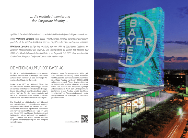 Medienfassaden ... die mediale Inszenierung der Corporate Identity ... ag4 Media facade GmbH entwickelt und realisiert die Medienskulptur für Bayer in Leverkusen. Ohne Wolfram Lusche wäre dieses Projekt niemals zustande gekommen und deswegen habe ich ihn gebeten, den Bericht über das Projekt aus der Sicht von Bayer zu verfassen. Wolfram Lusche ist Dipl.-Ing. Architekt, war von 1991 bis 2002 Leiter Design in der zentralen Messeabteilung der Bayer AG und verantwortlich für jährlich 150 Messen. Seit 2002 ist er Head of Corporate Events & Fairs in der Bayer AG. Seit 2005 ist er verantwortlich für die Entwicklung von Design und Content der Medienskulptur. Die Medienskulptur der Bayer AG Es gibt nicht viele Gebäude der modernen Architektur, die auf eine so bewegte Geschichte zurückblicken können wie das ehemalige Verwaltungshochhaus der Bayer AG. In den Jahren 1960 bis 1963 nach Plänen des Architekturbüros Hentrich, Petschnigg & Partner als damals höchstes und modernstes Bürogebäude Deutschlands errichtet, diente es bis zum Jahre 2002 als Sitz der Konzernzentrale und setzte ein selbstbewusstes, weithin sichtbares Wahrzeichen des Unternehmens in der Region. Der Standort war städtebaulich wohl überlegt und hatte die Verlegung eines liebevoll angelegten japanischen Gartens mit seltenen Gehölzen, Skulpturen und einem japanischen Teepavillon um mehrere hundert Meter zur Folge. Im März des Jahres 1999 machte das Gebäude weltweit Schlagzeilen, als es anlässlich des hundertjährigen Jubiläums von Aspirin mehrere Wochen als größte Tablettenpackung der Welt komplett verhüllt wurde. 212 Wegen zu hoher Sanierungskosten fiel im gleichen Jahr die Entscheidung für den Abriss des Hochhauses und den Neubau der Konzernzentrale. Dieser Neubau wurde von 2000 bis 2002 gleich nebenan nach Plänen des Architekturbüros Helmut Jahn errichtet, ebenfalls von einem Abriss des Hochhauses ausgehend (geringer Gebäudeabstand). Nach dem Umzug der Konzernführung in den Neubau wurde das Hochhaus bis 2007 als Bürogebäude genutzt, während parallel die Vorbereitungen für den Abriss getroffen wurden. www.mediatecture.info/22 213 Medienfassaden Die Idee Die architektonischen Anforderungen Im Zentrum des Bayer-Werkes vollendete sich damit ein einzigartiges städtebauliches Ensemble bestehend aus Es bot sich nun die konkrete Möglichkeit, etwas völlig Neuartiges zu schaffen. Ein Gebäude, welches, auf seine Tragstruktur reduziert, von einer transparenten Medienhülle allseitig umfasst, keine weiteren Funktionen beherbergen musste. Die einmalige Ausgangssituation war durch die vorhandene Stahlskelettkonstruktion und die sehr gut geeigneten Dimensionen und Proportionen des Gebäudes gegeben. Durch eine zusätzliche Lichtinszenierung sollte die Tragstruktur in die Bespielung der Fassaden mit einbezogen werden. Deshalb kam der Transparenz eine wesentliche Bedeutung zu, nicht nur für die Fassadengestaltung, sondern vor allem um so die Möglichkeiten einer dreidimensionalen Bespielung nutzen zu können. Dieses inszenierte Zusammenspiel von beleuchteter Gebäudestruktur, Lichtdesign und medialisierter Hülle an dem gewaltigen Baukörper (21 m x 65 m x 122 m) konnte nicht mehr unter dem Terminus Medienfassade subsumiert werden. Um den Unterschied zu verdeutlichen, führte ich deshalb hierfür einen neuen Terminus ein: Medienskulptur. »» dem alten Hauptverwaltungsgebäude, erbaut 1903 bis 1912 nach Plänen der Architekten Willy Günther und Hubert Amrhein im Stil des Historismus, »» dem Pharma-Verwaltungsgebäude, errichtet 1937 bis 1939 nach Plänen des Architekten Emil Fahrenkamp, mit seiner strengen Sandsteinfassade (beide Bauten stehen unter Denkmalschutz), »» dem Neubau der Konzernzentrale von Helmut Jahn mit seiner konvexen Glasfassade Ich ging bei meinen Mittagsspaziergängen oft um dieses Gebäudeensemble herum, betrachtete es aus vielen Perspektiven und spielte in Gedanken durch, wie das Hochhaus zu erhalten sei.Im August 2005 blieb ich mit dem Blick auf das Hochhaus stehen und hatte plötzlich eine Vision: Ich sah das skelettierte Hochhaus vor mir, umhüllt von einer transparenten Medienhaut. Foto © Bayer AG »» und dem Verwaltungshochhaus als weithin sichtbarer Landmarke, das durch seine Querstellung dieses Ensemble räumlich abschließt. Damit könnte diese bedeutende Landmarke nicht nur bewahrt, sondern durch eine neuartige, innovative Nutzung zum neuen Wahrzeichen der Bayer AG transformiert werden. Den weltweiten Trend und die kontroversen Diskussionen zur Medialisierung von Architektur im öffentlichen Raum hatte ich mit großem Interesse verfolgt und die ersten geplanten und realisierten Projekte waren mir weitgehend bekannt. Sie lassen erkennen, dass sich in unserer Gesellschaft – in unterschiedlichsten Ländern – ein 214 es musste noch ein anderes architektonisches Problem gelöst werden: die gestalterische Einbindung in das Gebäudeensemble, insbesondere in Beziehung zur neuen Konzernzentrale mit ihrer geringen Distanz und konvexen Form. Die inhaltlichen Anforderungen Die Aufgabenstellung Ausgehend von dieser Idee mussten eine konkrete Aufgabenstellung und eine Machbarkeitsprüfung erarbeitet werden. Und es mussten Partner gefunden und für diese Idee begeistert werden. Im unbespielten bzw. ausgeschalteten Zustand sollte dieses Gebäude auch hohen architektonischen und ästhetischen Ansprüchen genügen und durch seine Transparenz die unterschiedlichsten Wirkungen des Sonnenlichtes zu den wechselnden Tageszeiten widerspiegeln. Aber Bindung des Hochhauses an die neue Konzernzentrale von Murphy/ Jahn durch die Außenanlagen zunehmender Bedarf entwickelt hat, öffentlichen Raum zu emotionalisieren. Medienfassaden bieten dabei die phantastische Möglichkeit, dem statischen Charakter der Architektur dynamische Elemente hinzuzufügen. Sie schaffen eine Kommunikationsebene mit dem Betrachter und die Möglichkeit zur Interaktion. Diese Chancen wollte ich für das Projekt nutzen. Alle bis