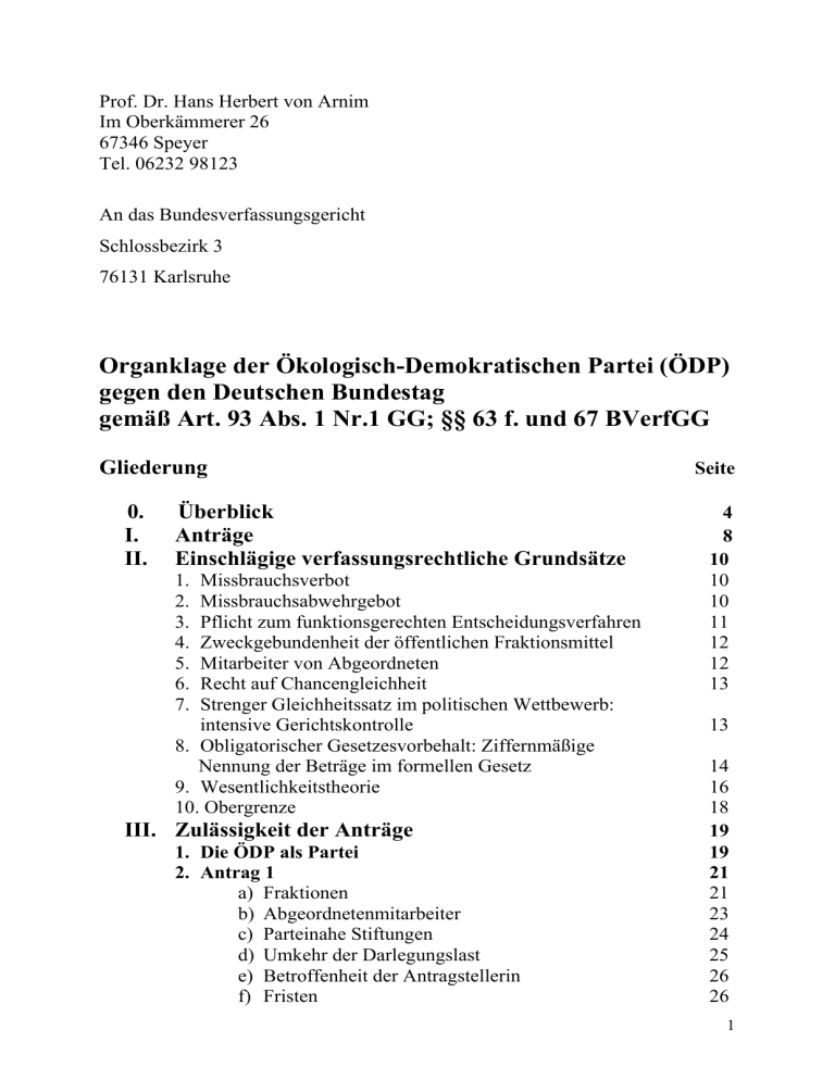 Prof. Dr. Hans Herbert von Arnim Im Oberkämmerer 26 67346 Speyer Tel. 06232 98123 An das Bundesverfassungsgericht Schlossbezirk 3 76131 Karlsruhe Organklage der Ökologisch-Demokratischen Partei (ÖDP) gegen den Deutschen Bundestag gemäß Art. 93 Abs. 1 Nr.1 GG; §§ 63 f. und 67 BVerfGG Gliederung 0. I. II. Überblick Anträge Einschlägige verfassungsrechtliche Grundsätze 1. 2. 3. 4. 5. 6. 7. Missbrauchsverbot Missbrauchsabwehrgebot Pflicht zum funktionsgerechten Entscheidungsverfahren Zweckgebundenheit der öffentlichen Fraktionsmittel Mitarbeiter von Abgeordneten Recht auf Chancengleichheit Strenger Gleichheitssatz im politischen Wettbewerb: intensive Gerichtskontrolle 8. Obligatorischer Gesetzesvorbehalt: Ziffernmäßige Nennung der Beträge im formellen Gesetz 9. Wesentlichkeitstheorie 10. Obergrenze III. Zulässigkeit der Anträge 1. Die ÖDP als Partei 2. Antrag 1 a) Fraktionen b) Abgeordnetenmitarbeiter c) Parteinahe Stiftungen d) Umkehr der Darlegungslast e) Betroffenheit der Antragstellerin f) Fristen Seite 4 8 10 10 10 11 12 12 13 13 14 16 18 19 19 21 21 23 24 25 26 26 1 3. Antrag 2 IV. Begründetheit der Anträge 1. Der strenge Gleichheitssatz als Maßstab 2. Begründung des Antrags 1 a) Umkehr der Darstellungs- und Beweislast b) Funktioneller Ersatz für die begrenzte Staatsfinanzierung der Parteien c) „Parties in parliament“ d) Fraktionen des Bundestags aa) Das Missbrauchsverbot bb) Öffentlichkeitsarbeit e) Persönliche Mitarbeiter von Bundestagsabgeordneten aa) Entwicklung 1969 bis 2009 bb) „Rückgrat der Parteien“ cc) Eine Stichprobe: Beschäftigung von Parteifunktionären dd) Missbrauch f) Parteinahe Stiftungen aa) Parteiliche Prägung bb) Das Urteil von 1996: überholt 3. Begründung des Antrags 2 a) Ein Blick in die Parlamentsgeschichte: Die Errichtung von Kontrollen und Grenzen der Staatsfinanzierung von Parteien zur Verhinderung von Missbrauch und „Selbstbedienung“ aa) Gegen die Ausschaltung außerparlamentarischer Konkurrenten bb) Gegen den Trend zu übermäßigem Wachstum b) Weder Grenzen noch Kontrollen bei der Selbstfinanzierung von Fraktionen, Abgeordnetenmitarbeitern und Parteistiftungen aa) Kumulation beider Trends bb) Erhöhter Kontrollbedarf cc) Unübertragbarkeit bestimmter Vorkehrungen dd) Vernachlässigung spezieller Zweckbindungen ee) Weder Gesetzesvorbehalt noch Obergrenze noch spezifizierten Ausweis im Haushaltsplan aaa) Kein Gesetzesvorbehalt bbb) Verwirrende Berichte und Verweise ccc) Hochschießen der öffentlichen Mittel für Fraktionen ddd) Hochschießen der öffentlichen Mittel für Abgeordnetenmitarbeiter 28 33 34 36 36 37 39 42 42 44 49 49 51 54 56 59 59 60 62 62 62 64 67 67 68 68 70 71 72 73 75 77 2 eee) Ohne Gesetzesvorbehalt, Obergrenze und spezifizierten Ausweis im Haushaltsplan: verfassungswidrig c) Ein Seitenblick auf die Landesparlamente d) Mangelhafte Verwendungskontrolle 4. Zusammenfassung und Ergänzung: Verschleierte Parteienfinanzierung auf Grund mangelhaft kontrollierter Bewilligung und Verwendung von Staatsmitteln zu Lasten außerparlamentarischer Konkurrenten V. 77 81 84 89 Anhang 93 Anlage 1: Anlage 2: Bewilligung für Fraktionen des Bundestags Bewilligung für Mitarbeiter von Bundestagsabgeordneten Bewilligung der Globalzuschüsse für parteinahe Stiftungen Einnahmen der Bundestagsfraktionen und Ausgaben für Öffentlichkeitsarbeit 1995-2010 Einnahmenund Ausgabenrechnung der Bundestagsfraktionen für 2010 Zahlungen an Abgeordnetenmitarbeiter des Bundes 1969-2011 Bruttoarbeitnehmerentgelt 1950-2011 Statistische Übersicht zur Zahl der Abgeordnetenmitarbeiter 1969-2009 Parteifunktionen von Wahlkreismitarbeitern von Bundestagsabgeordneten Muster-Arbeitsvertrag von Abgeordnetenmitarbeitern Ausführungsbestimmungen für die Beschäftigung von Abgeordnetenmitarbeitern Berichte des Bundestagspräsidenten über Fraktionszuschüsse Fraktionszuschüsse im Bundestag 1949-2011 Fraktionszuschüsse der Landesparlamente Zahl der Abgeordnetenmitarbeiter in Bund und Ländern Globalbewilligungen für Abgeordnetenmitarbeiter in Bund und Ländern 2010 Fraktionsfinanzierung 2010. Vergleich der Länder mit und ohne gesetzliche Nennung der Höhe Email des Bundesrechnungshofs zur Nicht-Prüfung der Abgeordnetenmitarbeiter Anlage 3: Anlage 4: Anlage 4a: Anlage 5. Anlage 6: Anlage 7: Anlage 8: Anlage 9: Anlage 10: Anlage 10a: Anlage 11: Anlage 12: Anlage 13: Anlage 14: Anlage 15: Anlage 16: 3 0. Überblick Um den Wald vor lauter Bäumen nicht aus dem Blick zu verlieren, sei den folgenden detaillierten Ausführungen ein kurzer Überblick vorangestellt. Zugleich seien benachbarte Probleme genannt, die aus prozessualen Gründen nicht einbezogen werden konnten. Dass die Parteien staatlich bezuschusst werden, ist allgemein bekannt, 2012 mit rund 151 Mio. Euro. Weniger bekannt ist, dass die Fraktionen ebenfalls viel Staatsgeld erhalten, rund 190 Mio. Euro im Jahr, davon 81 Mio. für Bundestagsund rund 109 Mio. für Landtagsfraktionen. Noch weniger bekannt ist, dass auch Abgeordneten eine große Zahl von „persönlichen Mitarbeitern“ finanziert wird; dafür stehen im Bund 149 Mio. Euro und in den Ländern weitere 75 Mio. Euro zur Verfügung. Hinzu kommen rund 450 Mio. Euro für sechs parteinahe Stiftungen, davon 98 Mio. global für deren Inlandsarbeit und rund 352 Mio. für Projekte, vor allem im Ausland. In den Sechzigerjahren war das noch anders. Die öffentlichen Mittel für Bundestagsfraktionen betrugen damals gerade mal zwei Prozent der heutigen Summe. Abgeordnetenmitarbeiter und Globalzuschüsse der Stiftungen gab es noch nicht, und die zweckgebundenen Zuwendungen der Stiftungen machten weniger als drei Prozent des heutigen Volumens aus. Der Wandel, der durch das Hochschießen der Zahlungen bewirkt wurde, hängt damit zusammen, dass die Parteien in eigener Sache über ihre Staatsmittel entscheiden und das Bundesverfassungsgericht in den Sechzigerjahren auf einen der vier „Staatstöpfe“ einen Deckel gelegt hatte. Durch Urteile von 
