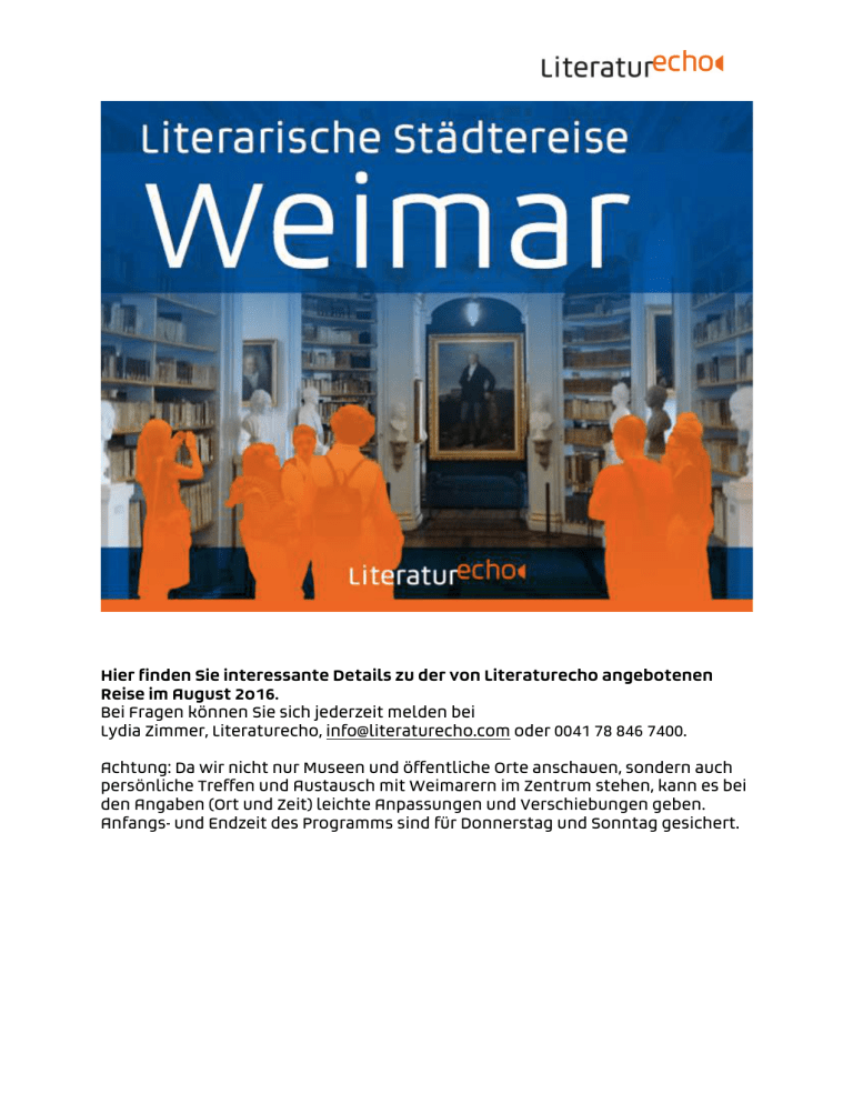 Hier finden Sie interessante Details zu der von Literaturecho angebotenen Reise im August 2o16. Bei Fragen können Sie sich jederzeit melden bei Lydia Zimmer, Literaturecho, [email protected] oder 0041 78 846 7400. Achtung: Da wir nicht nur Museen und öffentliche Orte anschauen, sondern auch persönliche Treffen und Austausch mit Weimarern im Zentrum stehen, kann es bei den Angaben (Ort und Zeit) leichte Anpassungen und Verschiebungen geben. Anfangs- und Endzeit des Programms sind für Donnerstag und Sonntag gesichert. Programm 1. Tag (Donnerstag): Die Stadt Weimar, der Goethe-Park und die Herzogin Anna Amalia Individuelle Anreise bis spätestens 15 Uhr. Ankunft im Hotel. Treffen in der Hotellobby. Willkommen in Weimar! 15.15 Uhr Bei einem ersten Spaziergang lassen wir die Stadt der deutschen Klassik und die Goethe-Parkanlage mit ihren verschlungenen Wegen auf uns wirken. Notizen: 16 Uhr Wir besichtigen die Anna Amalia Bibliothek mit ihrem fantastischen Rokokosaal – mit exklusiver Führung. Seit der Restaurierung der Bibliothek im Jahr 2007 sind die limitierten Eintrittskarten Monate im Voraus ausgebucht! Im Anschluss gehen wir in das neue Bibliothekszentrum gegenüber – ein zeitgenössischer Bau, der sowohl inhaltliche Ergänzung, als auch wunderbarer beeindruckender Gegenpol ist. Zwei ganz besondere Buchwelten – ein wahrer Höhepunkt zu Beginn der Reise! Dauer: 1 Stunde 18.30 Uhr Gemeinsames Abendessen (auf Wunsch) und Kennenlernen in der Gruppe. Ein Tisch im lichtdurchfluteten Restaurant „Anno 1900“ ist für Sie reserviert. Notizen: 2. Tag (Freitag): Das Klassische Weimar (UNESCO – Weltkulturerbe) 10 Uhr Entdecken Sie Weimar zu Fuss mit der Stadtführung Schauplätze der Literatur: In welchem Haus in Weimar entstand Weltliteratur, wo wurden welche berühmten Werke uraufgeführt und wo lebten einige der 70 Weimarer Schriftsteller zu Beginn des 20. Jahrhunderts? Renate Weichert, seit Jahren bekannt für ihre kurzweiligen und interessanten Führungen mit zahlreichen Anekdoten, führt uns durch das literarische Weimar. Treffpunkt: Hotellobby Hotel Leonardo Dauer: 2 Stunden 12.30 Uhr Stärkung in der Mittagspause im Garten-Café Caroline im Herderhaus, Weimar. Anja Lohaus verwöhnt uns mit Lieblingsspeisen im wundervollen Ambiente mitten in der Stadt. Notizen: 14.00 bis 15.45 Uhr Freizeit 16.00 Uhr Private Führung in Schillers Wohnhaus Am 10. Februar 1802, wenige Wochen vor seinem Einzug in dieses Haus, schreibt Schiller an seinen Verleger Göschen in Leipzig: „Ich habe dieser Tage endlich einen alten Wunsch realisiert, ein eigenes Haus zu besitzen. Denn ich habe nun alle Gedanken an das Wegziehen von Weimar aufgegeben und denke hier zu leben und zu sterben.“ Nun ist der Dichter anscheinend angekommen: Er hat ein Haus, eine Familie und Erfolg. Doch das ist nur eine Seite der Medaille. Um sich all das leisten zu können, musste Schiller unermüdlich arbeiten. Die Einrichtung des Wohnhauses verbindet authentische Nachlassstücke mit analogen Ergänzungen und zeitgenössischem Interieur. Sie ermöglicht dem Besucher, den Zeitgeschmack, die Lebensumstände und die Atmosphäre des Schaffens, Wohnens und Haushaltens in Schillers Wohnhaus nachzuempfinden. Dauer: 1 Stunde Am Abend Zeit zur freien Verfügung. Gemeinsames Abendessen auf Wunsch möglich. Notizen: 3. Tag (Samstag): Weimar als Schauplatz von Literatur und Kultur Individuelle Freizeit am Morgen. Möglichkeit für Spaziergang entlang des Schlosses Belvedere oder für einen Besuch eines der Museen bzw. Ausstellungen Weimars. Herzogin Anna Amalia, Goethe, Schiller, Wieland und Herder sowie Liszt: Die Grossen der deutschen Literatur und Kultur haben das „klassische Weimar“ (UNESCO – Kulturerbe) geprägt. Für welchen Anlaufpunkt entscheiden Sie sich? Treffen am Theaterplatz um 14.45 Uhr. 15 Uhr 500 Meter Weimar. Auf Zeitreise mit dem Stadtbild-Erklärer Uraufführung: Anke Heelemann/Fotothek Was ist es, was Weimar ausmacht? Sind es die Häuser, Strassenzüge und historischen Persönlichkeiten – oder die Menschen, die hier leben? Mit der inszenierten Stadtführung »500 Meter Weimar« lädt die Künstlerin Anke Heelemann, die im Rahmen ihres Langzeitprojekts »Fotothek« mit vergessenen Privatfotografien arbeitet, zu einem Spaziergang entlang einer zentralen Weimarer Wegstrecke ein. Das Unscheinbare und Verborgene ist Ausgangspunkt einer subjektiven Stadterkundung: 500 Meter geht man vom Goetheplatz hin zur aktuellen Grossbaustelle Weimars, wo in unmittelbarer Nachbarschaft des ehemaligen Gauforums Hitlers das neue Bauhaus-Museum entsteht. Ausgestattet mit allerlei analogem Werkzeug – Diabetrachtern, Bild- und Kartenmaterial, Kreide und Schallplattenspieler – und angeleitet von Schauspieler Markus Fennert begeben sich die TeilnehmerInnen auf die Spuren historischer Begebenheiten, stadtpolitischer Visionen und persönlicher Geschichten. Verschiedene Perspektiven öffnen dabei Raum für Assoziationen und verwandeln 500 Meter Innenstadt in eine Zeitreise zwischen erlebten und imaginären Momenten. Dauer: 1 Stunde Notizen: 20.00 Uhr Siena La Veronal (E) La Veronal ist eine der großen Entdeckungen der europäischen Tanzszene. Dem virtuosen, zehnköpfigen Ensemble dient die Kultur-geschichte Sienas – eine der Partnerstädte Weimars – als Inspiration, um in einer bizarrschillernden Collage über unsere Wahrnehmung des menschlichen Körpers und unseren veränderten Umgang mit ihm nachzudenken. Das Markenzeichen des Künstlerkollektivs um den spanischen Regisseur Marcos Morau ist es, geografische Regionen, Städte und ihre Geschichte im Spiegel ihrer jeweiligen Kultur in dramatische Aufführungen zu verwandeln. »Siena« entführt uns auf eine Entdeckungsreise in die Kunst Italiens von der Renaissance bis in die Gegenwart: Eine Frau sitzt allein in einer Museumshalle und wird dabei von einem Mann beobachtet. Die Bilder an den Wänden beginnen zu leuchten, der Raum füllt sich mit Tänzer*innen in Fechtmontur, die si